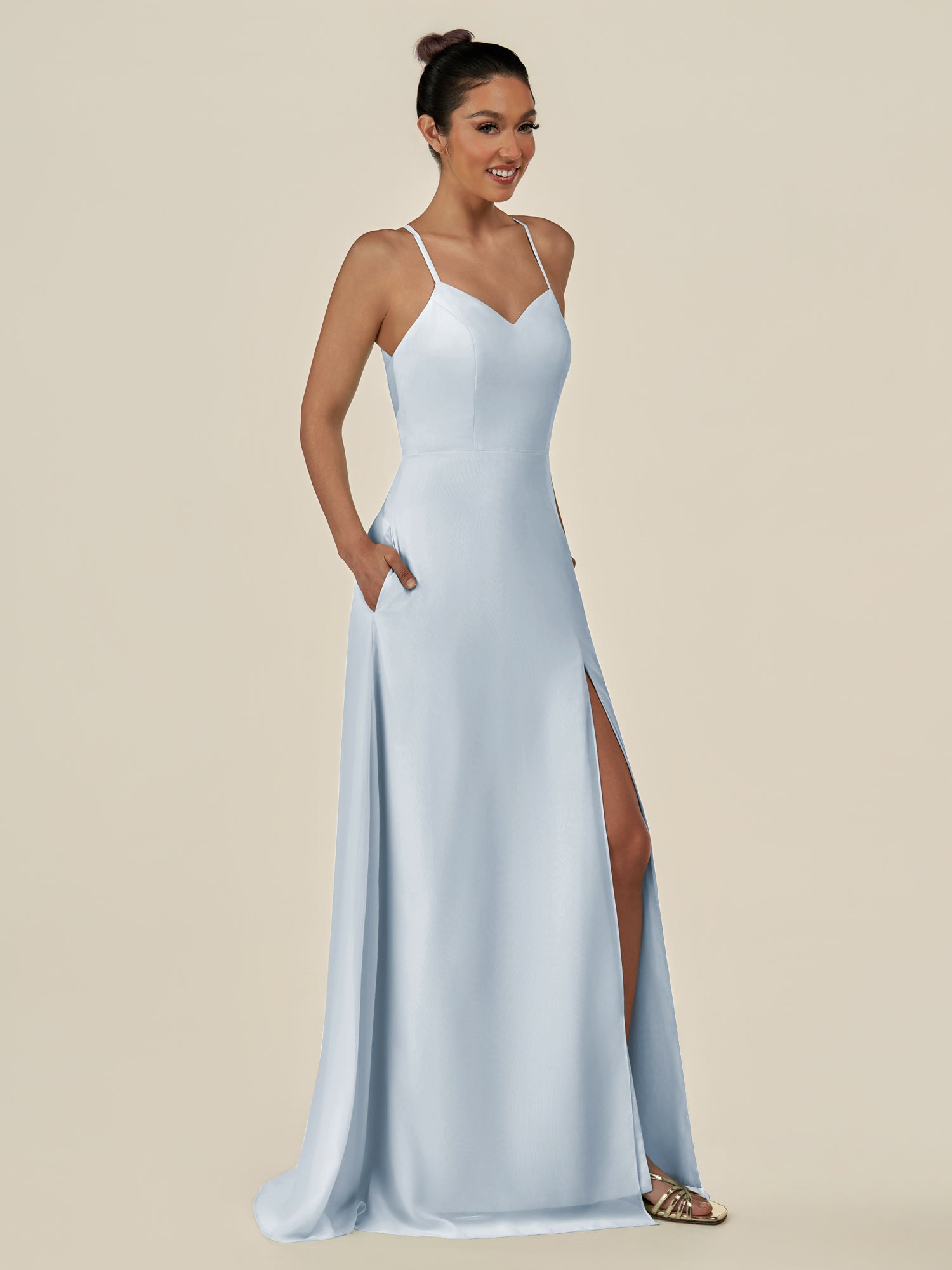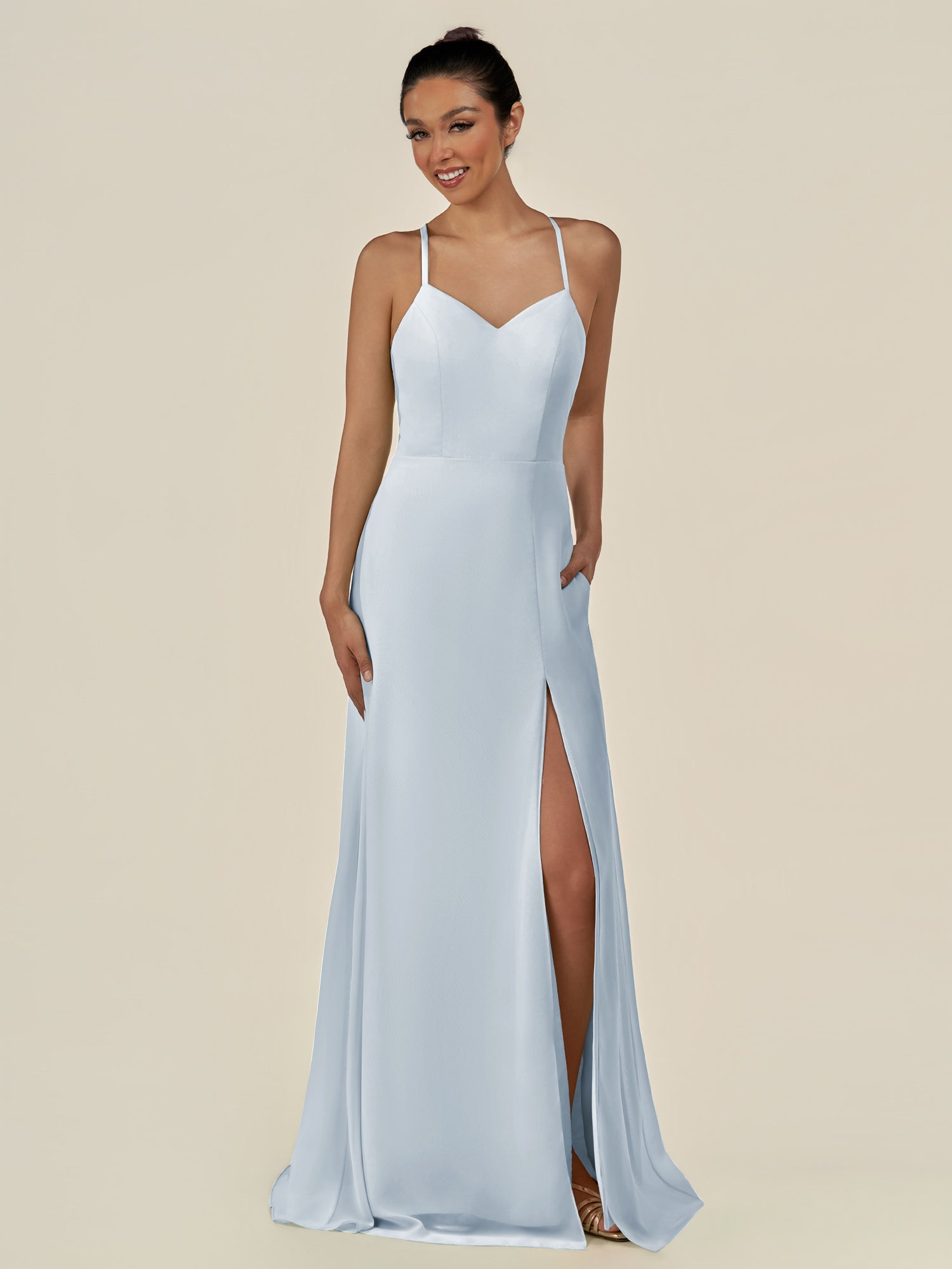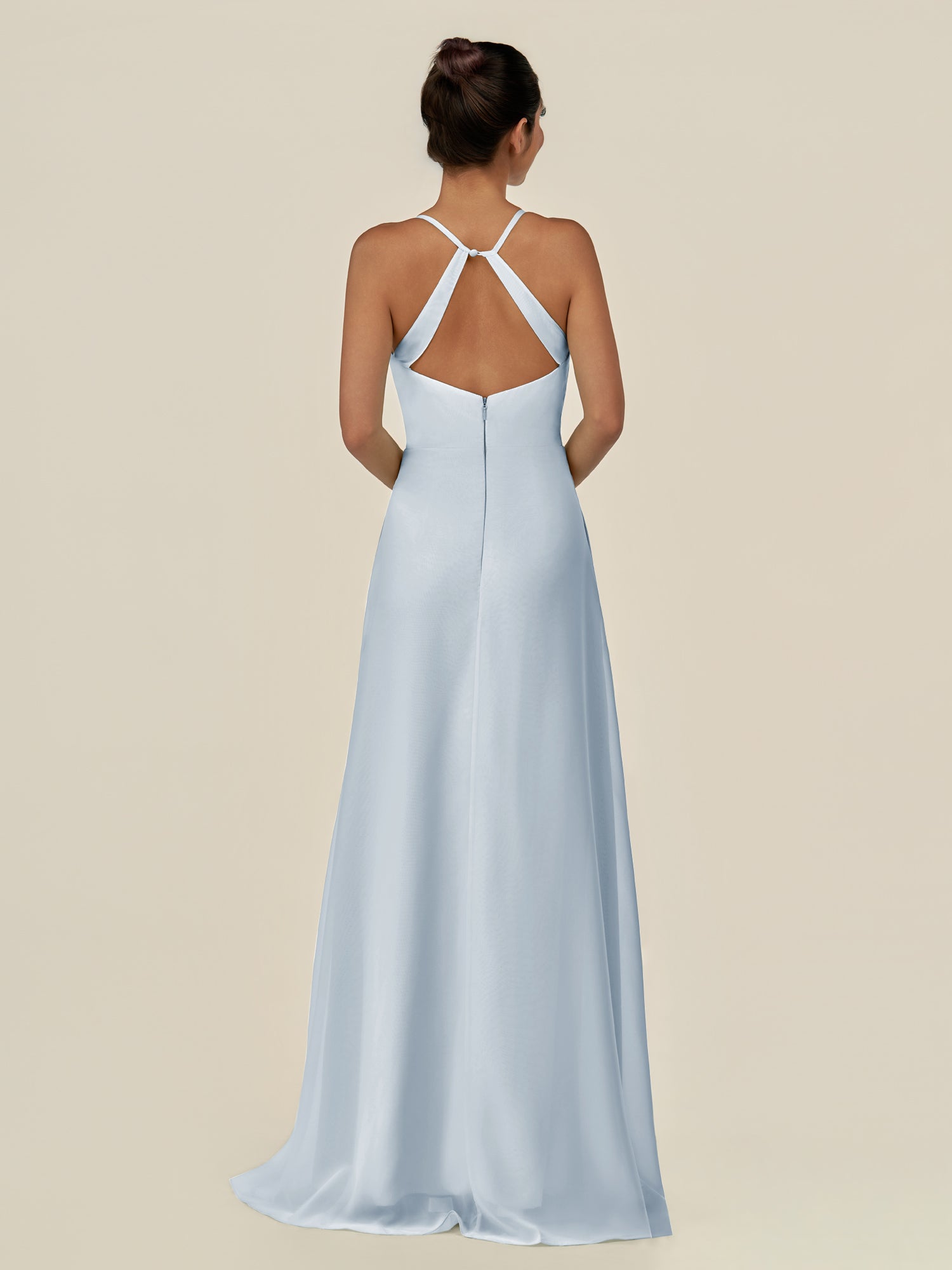 Cerin is a sleek and sophisticated choice for your bridal party. Crafted from soft chiffon, she features a flattering v neckline and a sleeveless bodice that creates a refined silhouette. Her floor-length sheath skirt flows elegantly, accented by a subtle side slit for graceful movement. Finished with a smooth zipper back, Irys combines timeless style with contemporary elegance—perfect for weddings and special occasions.