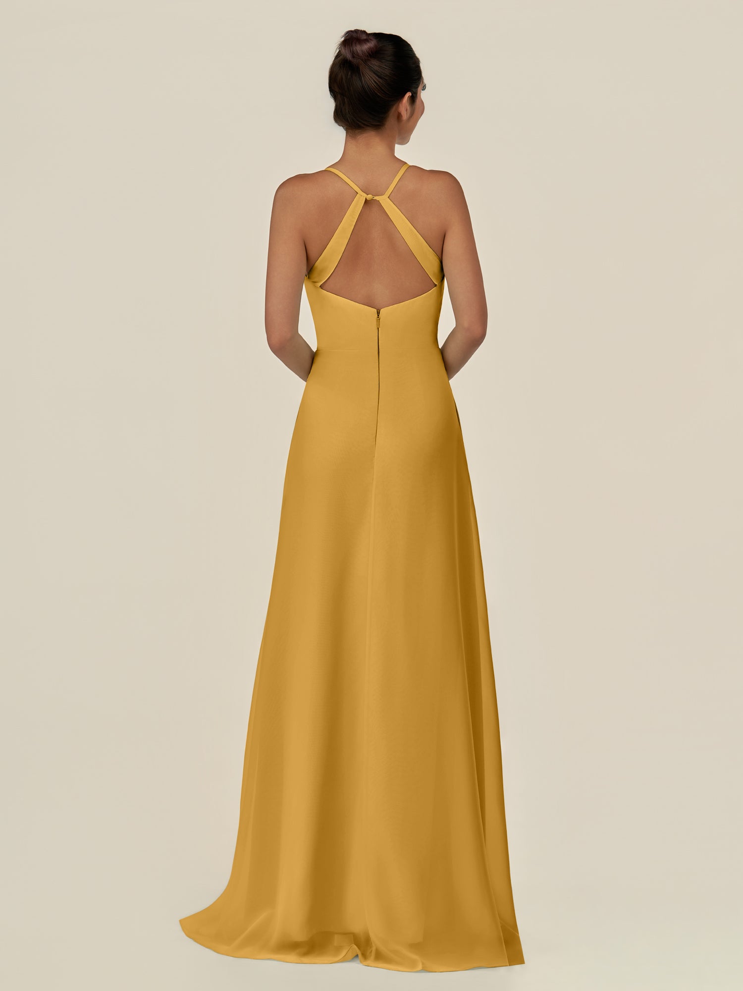 Cerin is a sleek and sophisticated choice for your bridal party. Crafted from soft chiffon, she features a flattering v neckline and a sleeveless bodice that creates a refined silhouette. Her floor-length sheath skirt flows elegantly, accented by a subtle side slit for graceful movement. Finished with a smooth zipper back, Irys combines timeless style with contemporary elegance—perfect for weddings and special occasions.