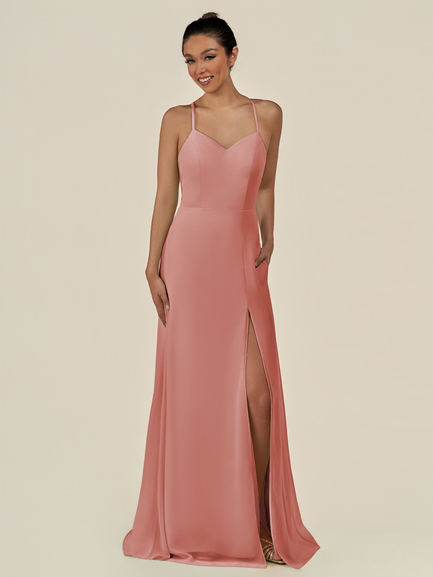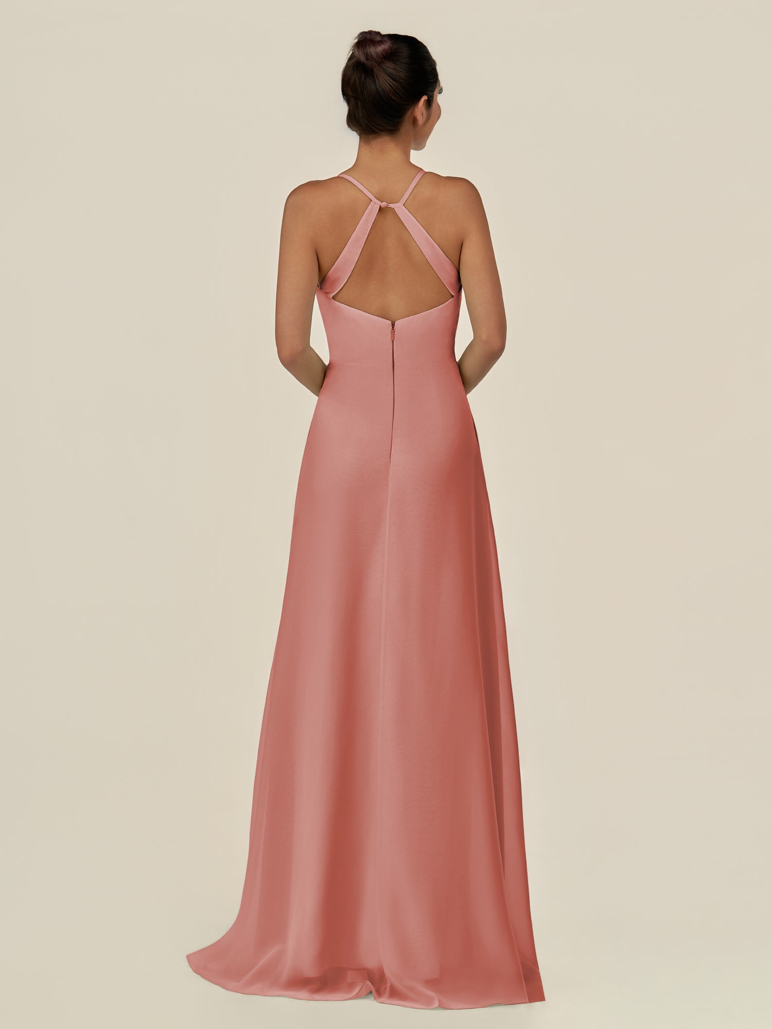 Cerin is a sleek and sophisticated choice for your bridal party. Crafted from soft chiffon, she features a flattering v neckline and a sleeveless bodice that creates a refined silhouette. Her floor-length sheath skirt flows elegantly, accented by a subtle side slit for graceful movement. Finished with a smooth zipper back, Irys combines timeless style with contemporary elegance—perfect for weddings and special occasions.