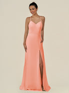 Cerin is a sleek and sophisticated choice for your bridal party. Crafted from soft chiffon, she features a flattering v neckline and a sleeveless bodice that creates a refined silhouette. Her floor-length sheath skirt flows elegantly, accented by a subtle side slit for graceful movement. Finished with a smooth zipper back, Irys combines timeless style with contemporary elegance—perfect for weddings and special occasions.