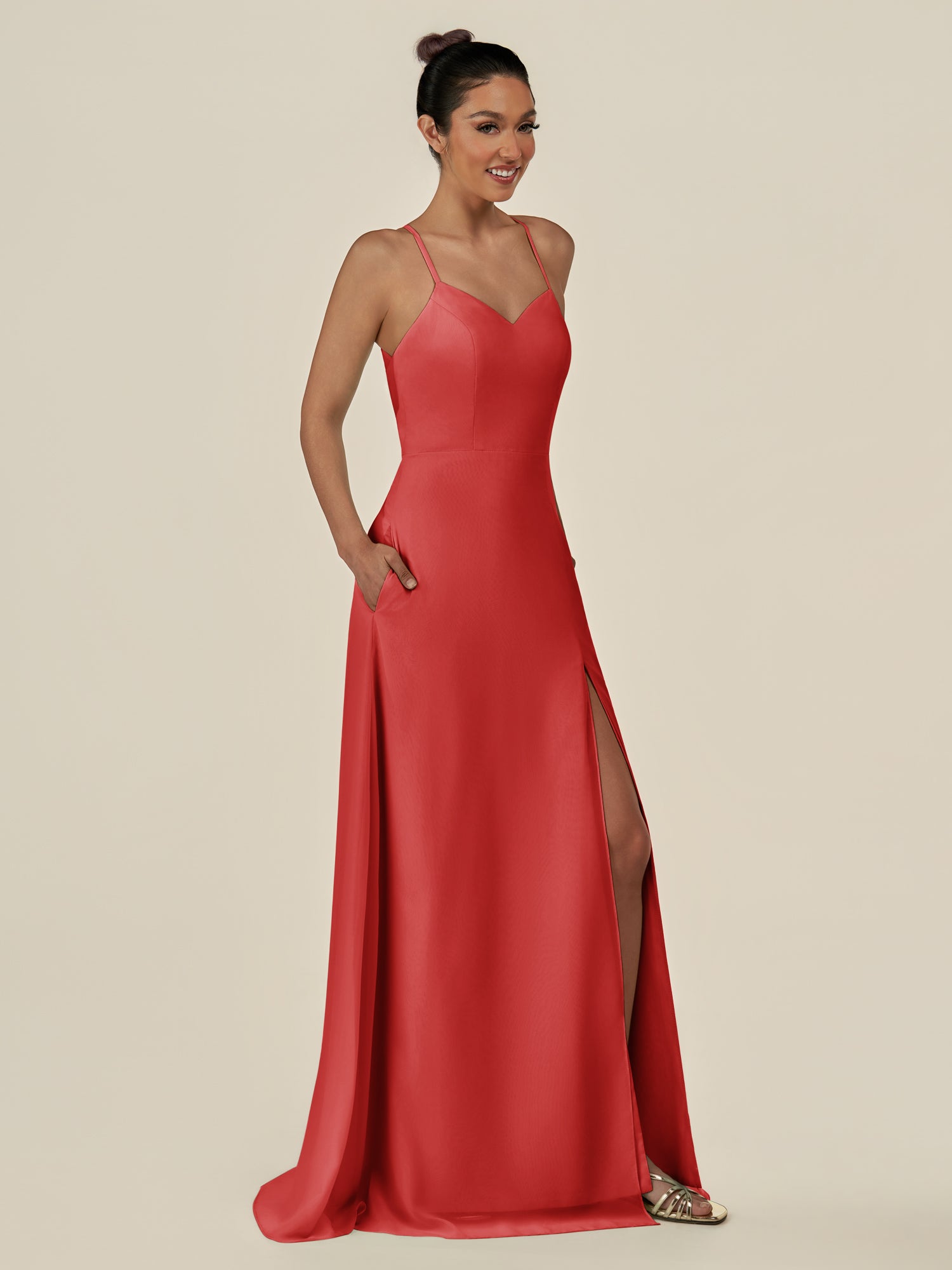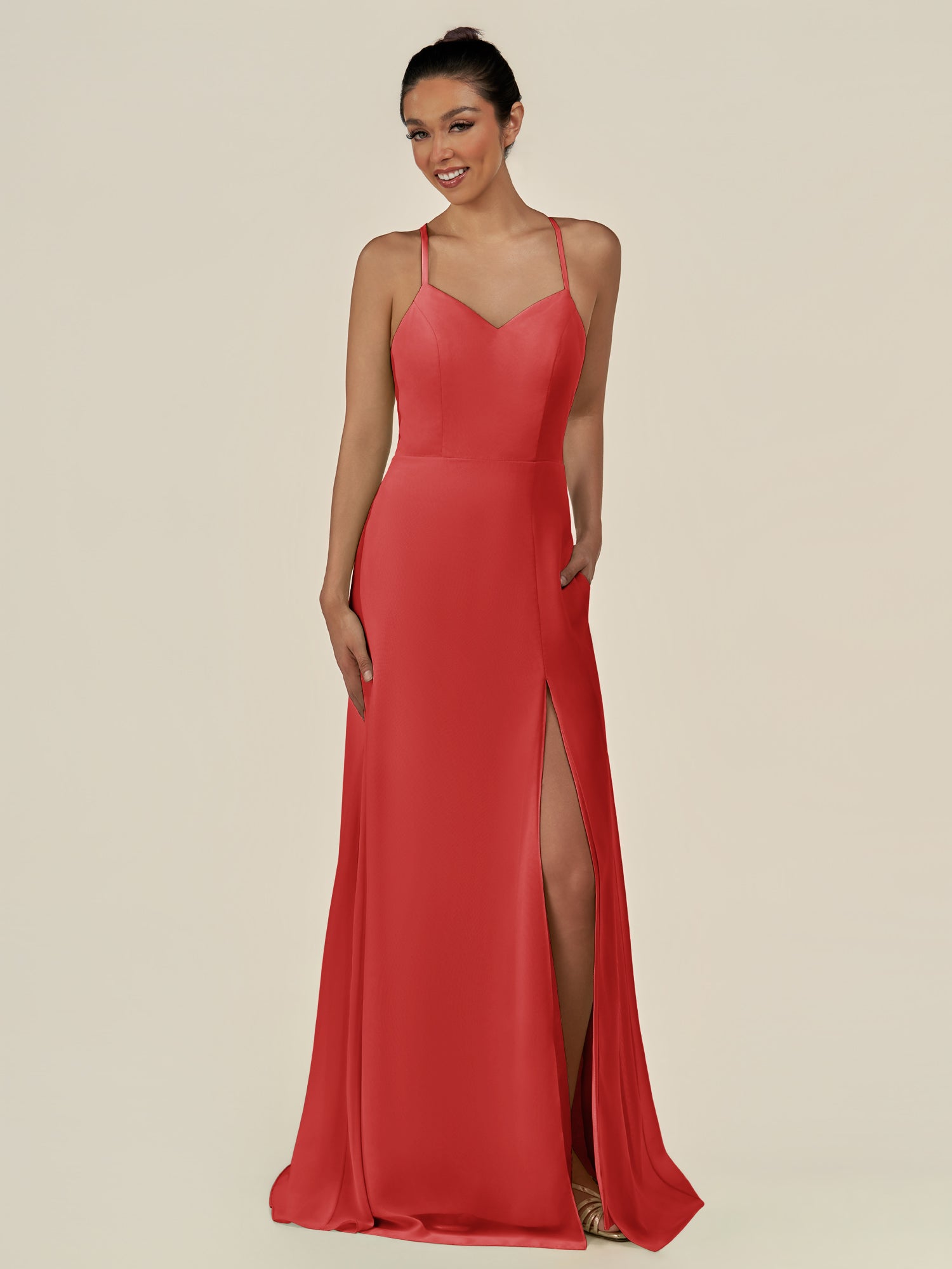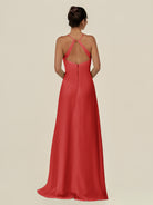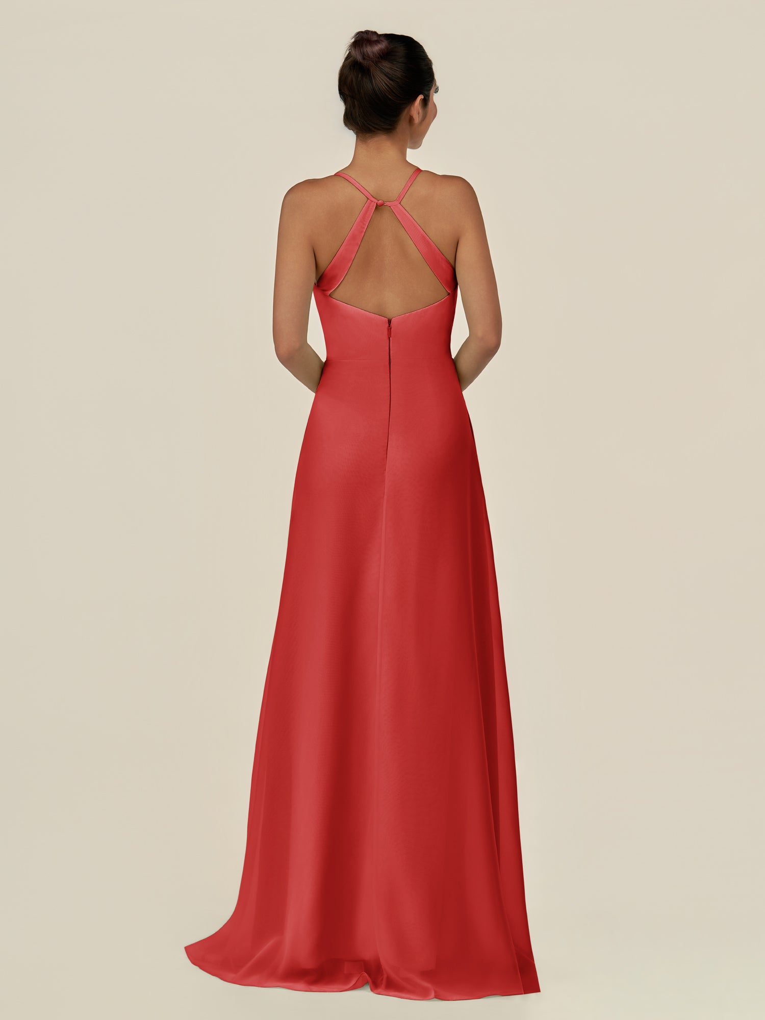 Cerin is a sleek and sophisticated choice for your bridal party. Crafted from soft chiffon, she features a flattering v neckline and a sleeveless bodice that creates a refined silhouette. Her floor-length sheath skirt flows elegantly, accented by a subtle side slit for graceful movement. Finished with a smooth zipper back, Irys combines timeless style with contemporary elegance—perfect for weddings and special occasions.