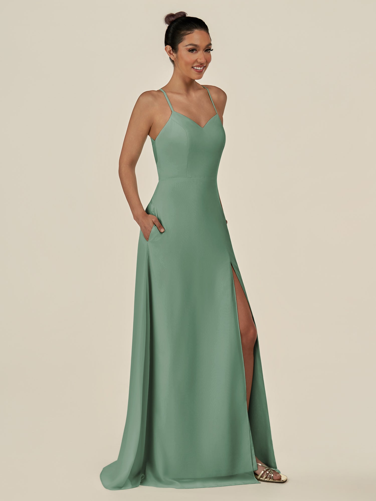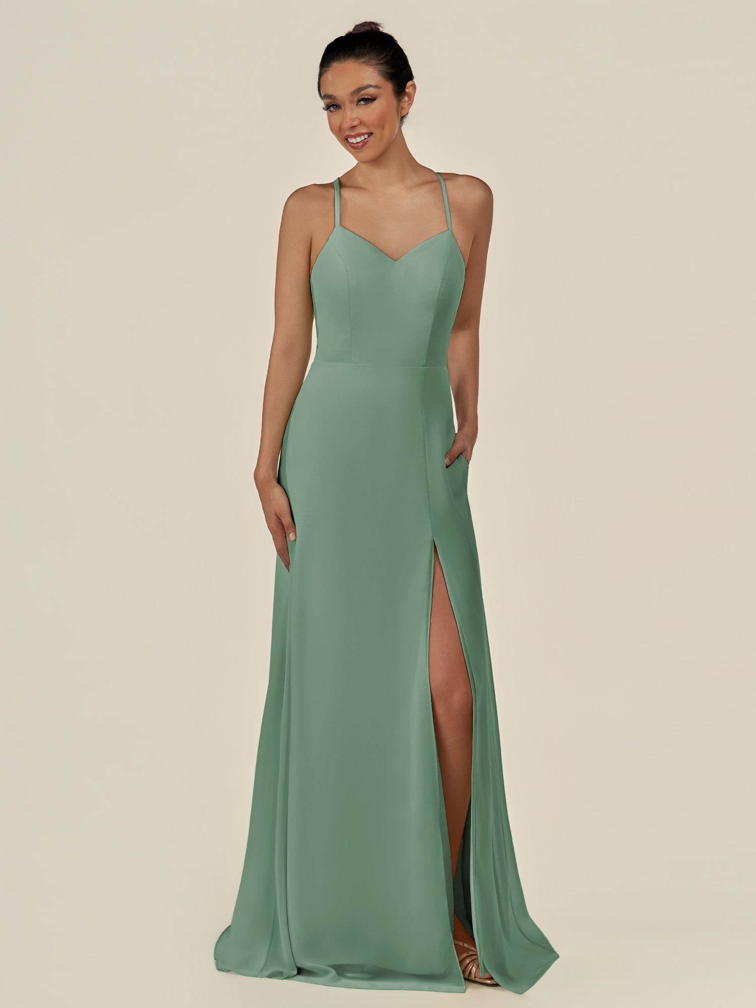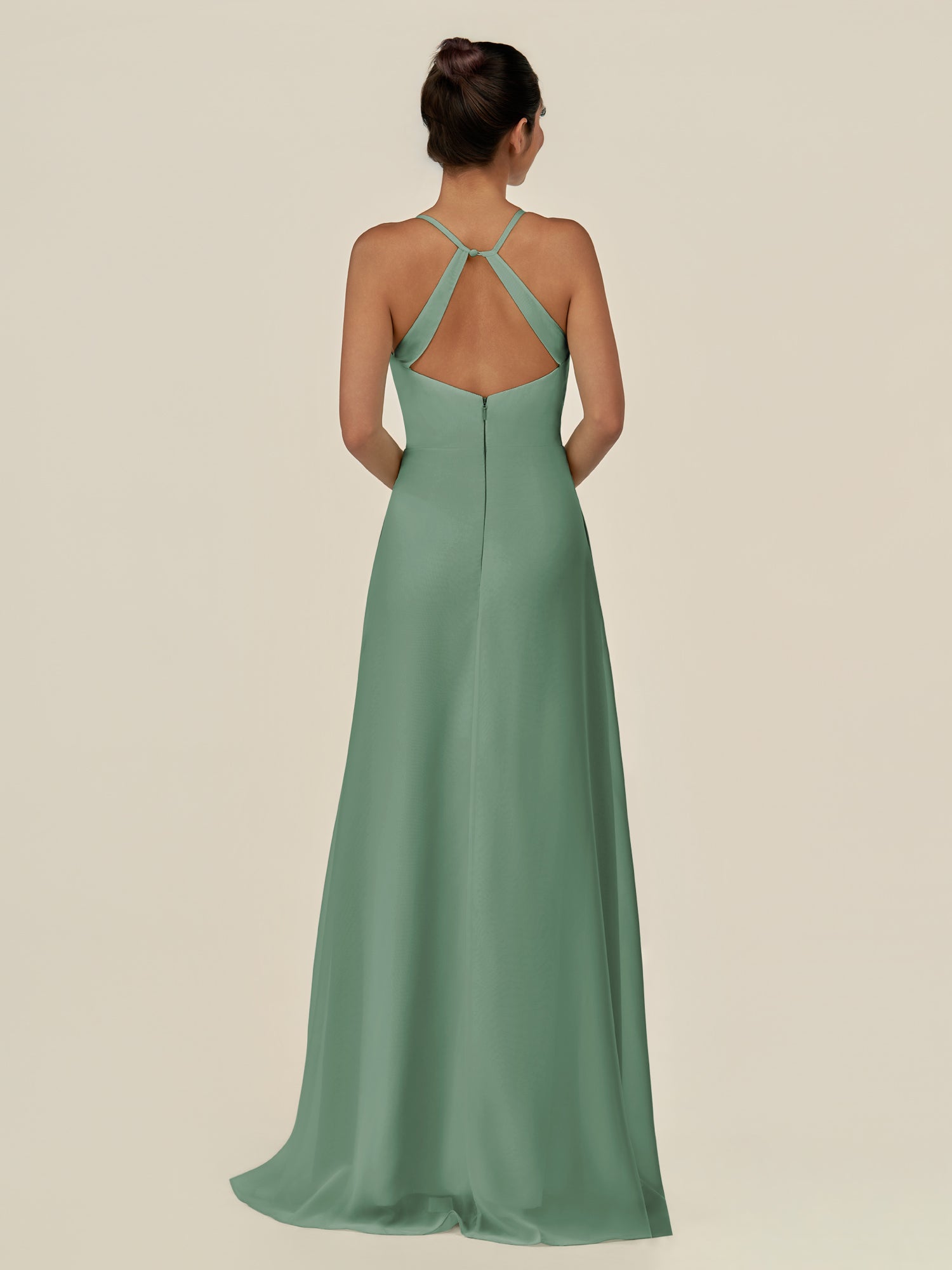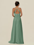 Cerin is a sleek and sophisticated choice for your bridal party. Crafted from soft chiffon, she features a flattering v neckline and a sleeveless bodice that creates a refined silhouette. Her floor-length sheath skirt flows elegantly, accented by a subtle side slit for graceful movement. Finished with a smooth zipper back, Irys combines timeless style with contemporary elegance—perfect for weddings and special occasions.