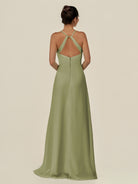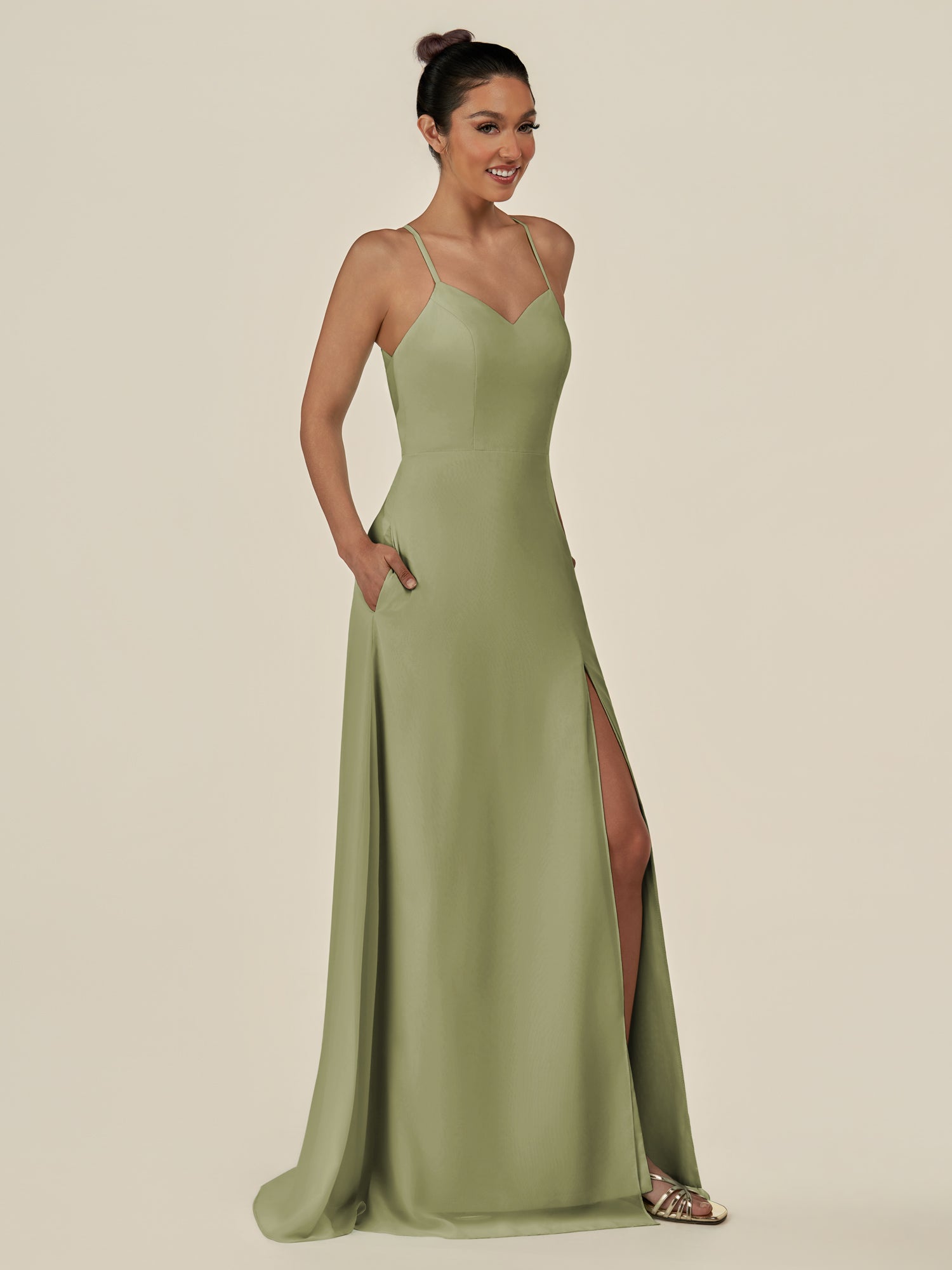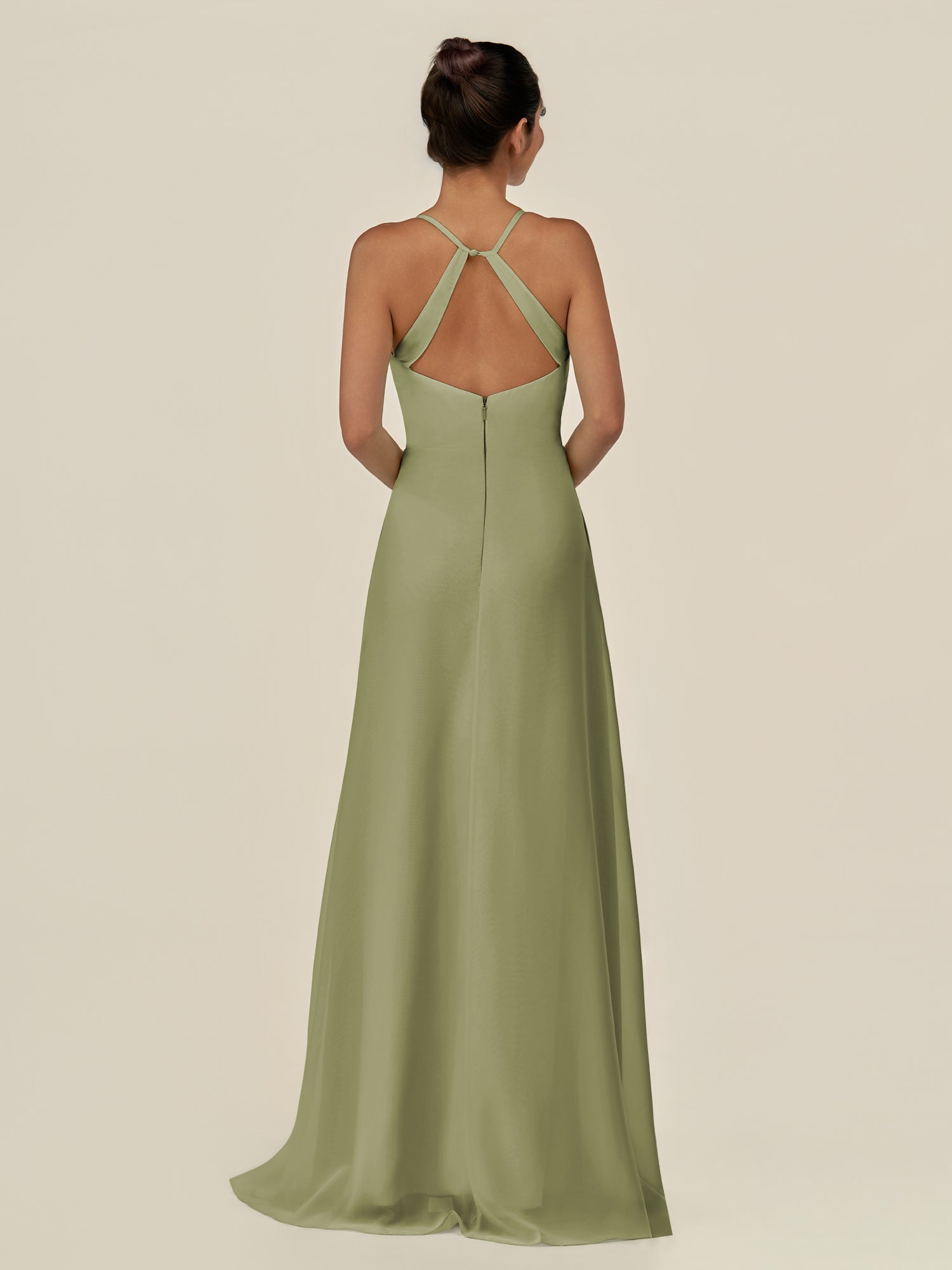 Cerin is a sleek and sophisticated choice for your bridal party. Crafted from soft chiffon, she features a flattering v neckline and a sleeveless bodice that creates a refined silhouette. Her floor-length sheath skirt flows elegantly, accented by a subtle side slit for graceful movement. Finished with a smooth zipper back, Irys combines timeless style with contemporary elegance—perfect for weddings and special occasions.