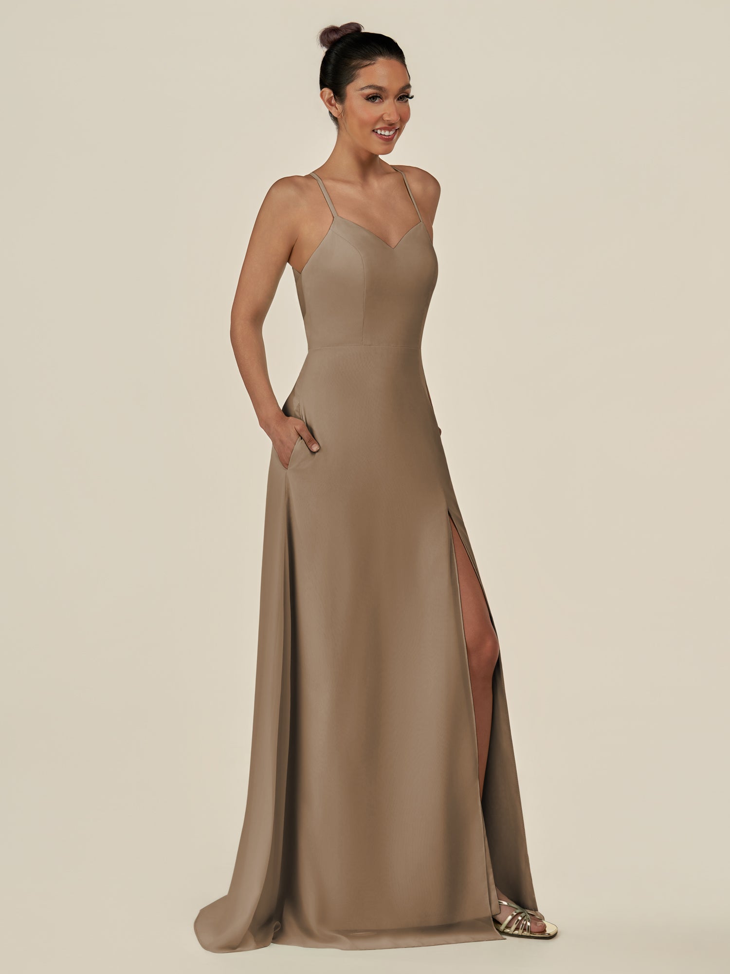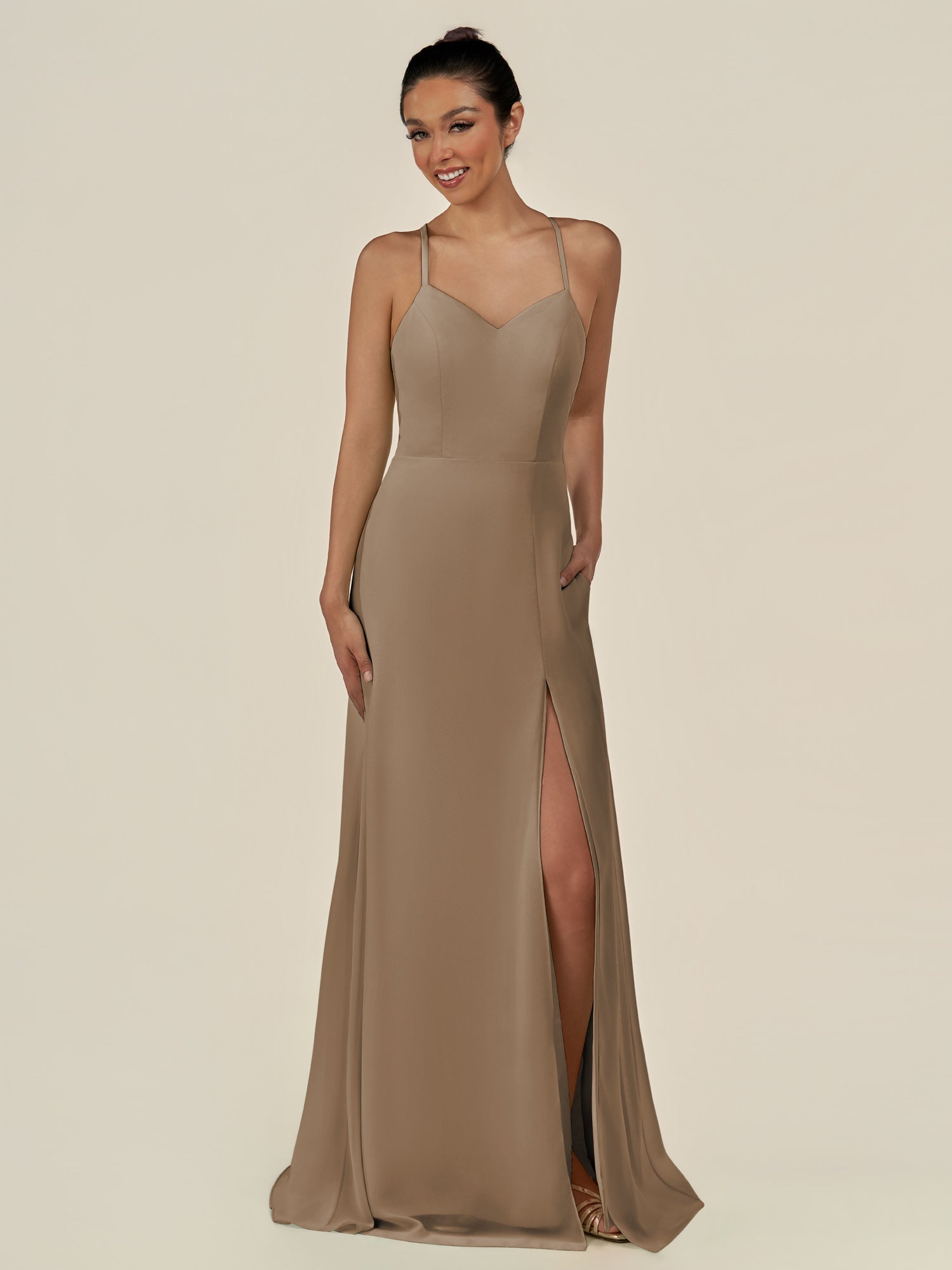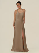 Cerin is a sleek and sophisticated choice for your bridal party. Crafted from soft chiffon, she features a flattering v neckline and a sleeveless bodice that creates a refined silhouette. Her floor-length sheath skirt flows elegantly, accented by a subtle side slit for graceful movement. Finished with a smooth zipper back, Irys combines timeless style with contemporary elegance—perfect for weddings and special occasions.