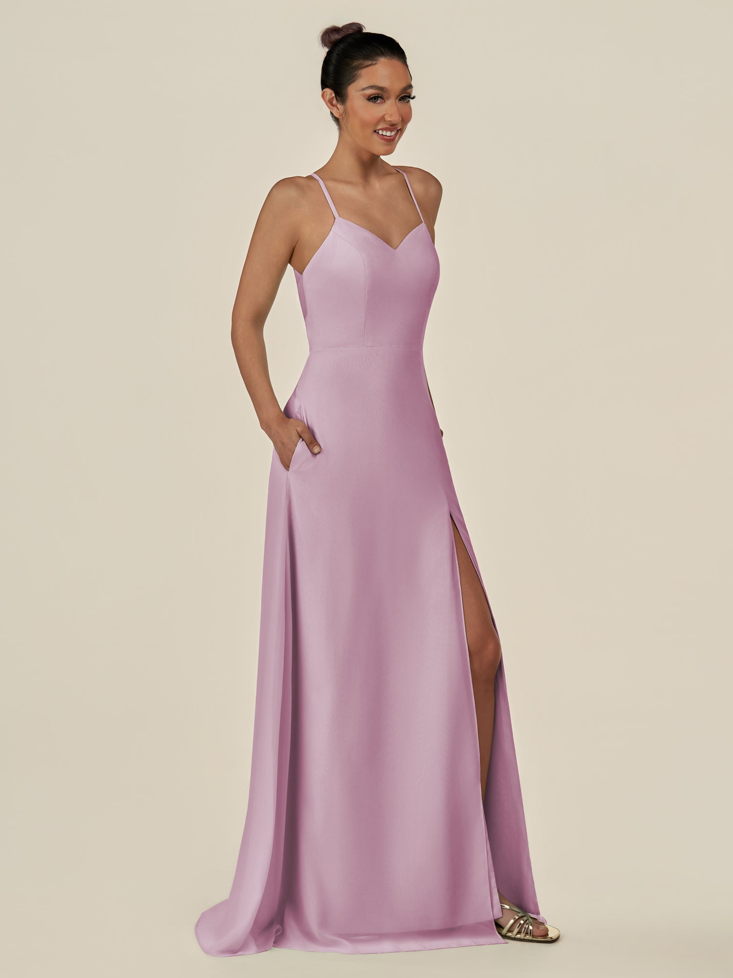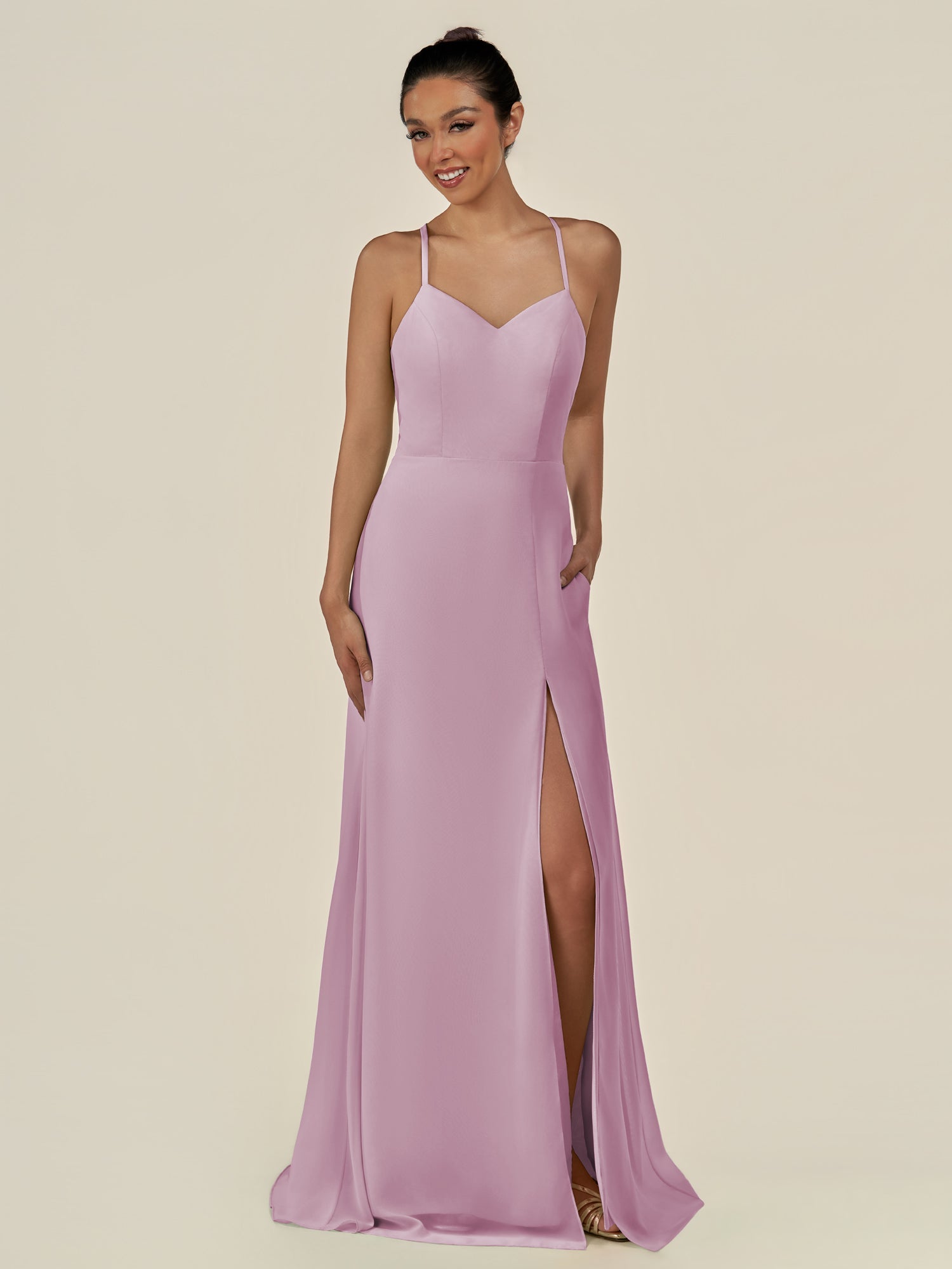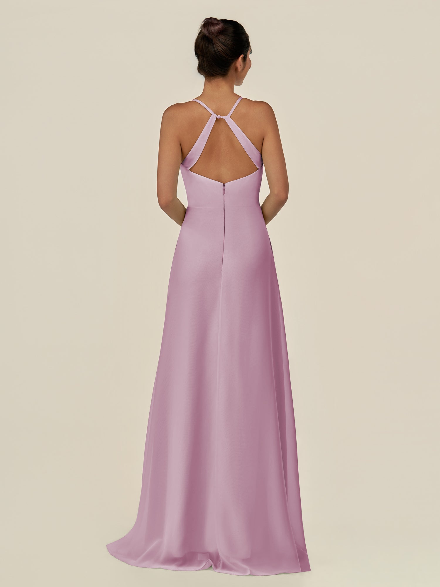 Cerin is a sleek and sophisticated choice for your bridal party. Crafted from soft chiffon, she features a flattering v neckline and a sleeveless bodice that creates a refined silhouette. Her floor-length sheath skirt flows elegantly, accented by a subtle side slit for graceful movement. Finished with a smooth zipper back, Irys combines timeless style with contemporary elegance—perfect for weddings and special occasions.