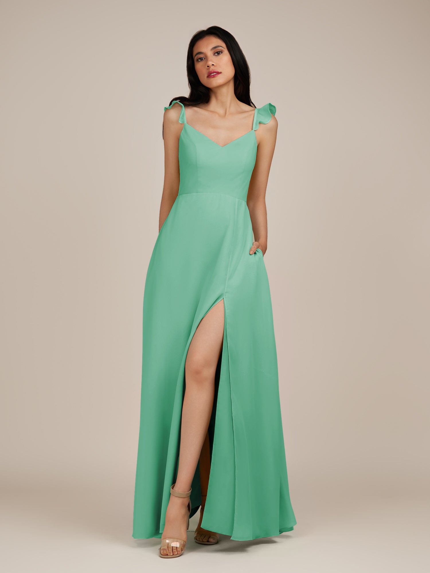 Citrine is a graceful and stylish choice for your bridal party. Crafted from soft chiffon, she features a flattering V-neckline and a sleeveless bodice for a modern, elegant look. Her floor-length A-line skirt flows beautifully with every step, accented by delicate ruffles and a subtle side slit for added movement and charm. Finished with a smooth zipper back, Citrine blends timeless sophistication with contemporary style, perfect for weddings and special occasions.