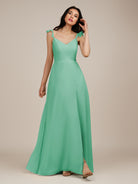 Citrine | Turquoise - A Line V Neck Chiffon Ruffled Long Bridesmaid Dress with Slit