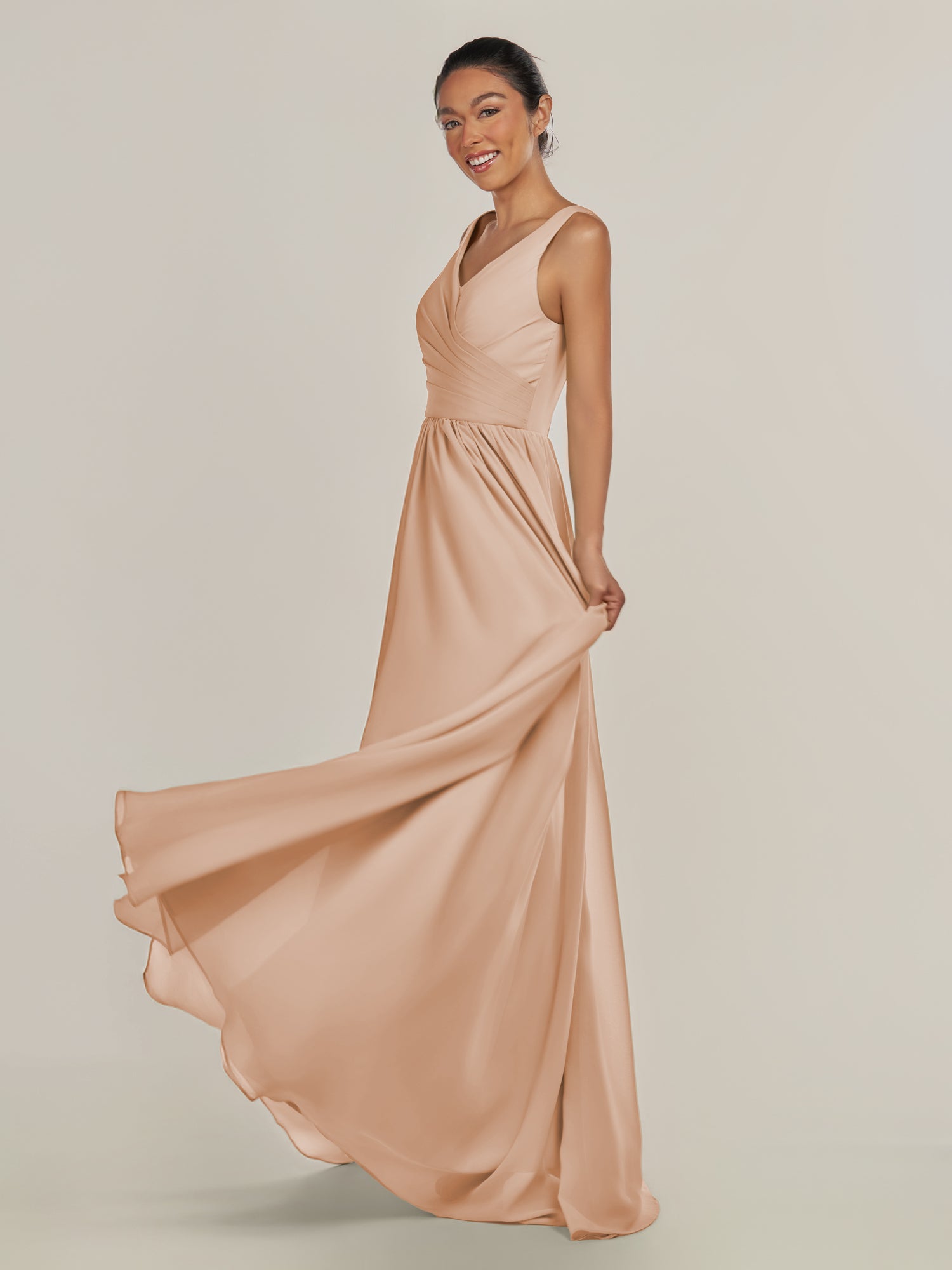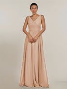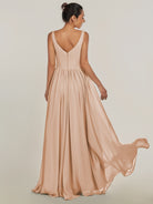 Cova | Champagne Rose - A Line Chiffon V Neck Long Bridesmaid Dress with Slit