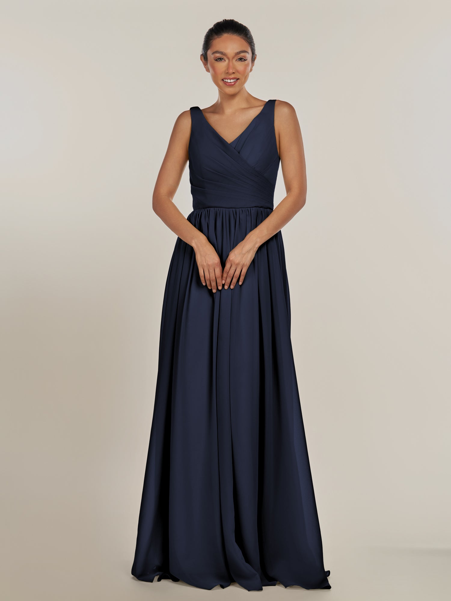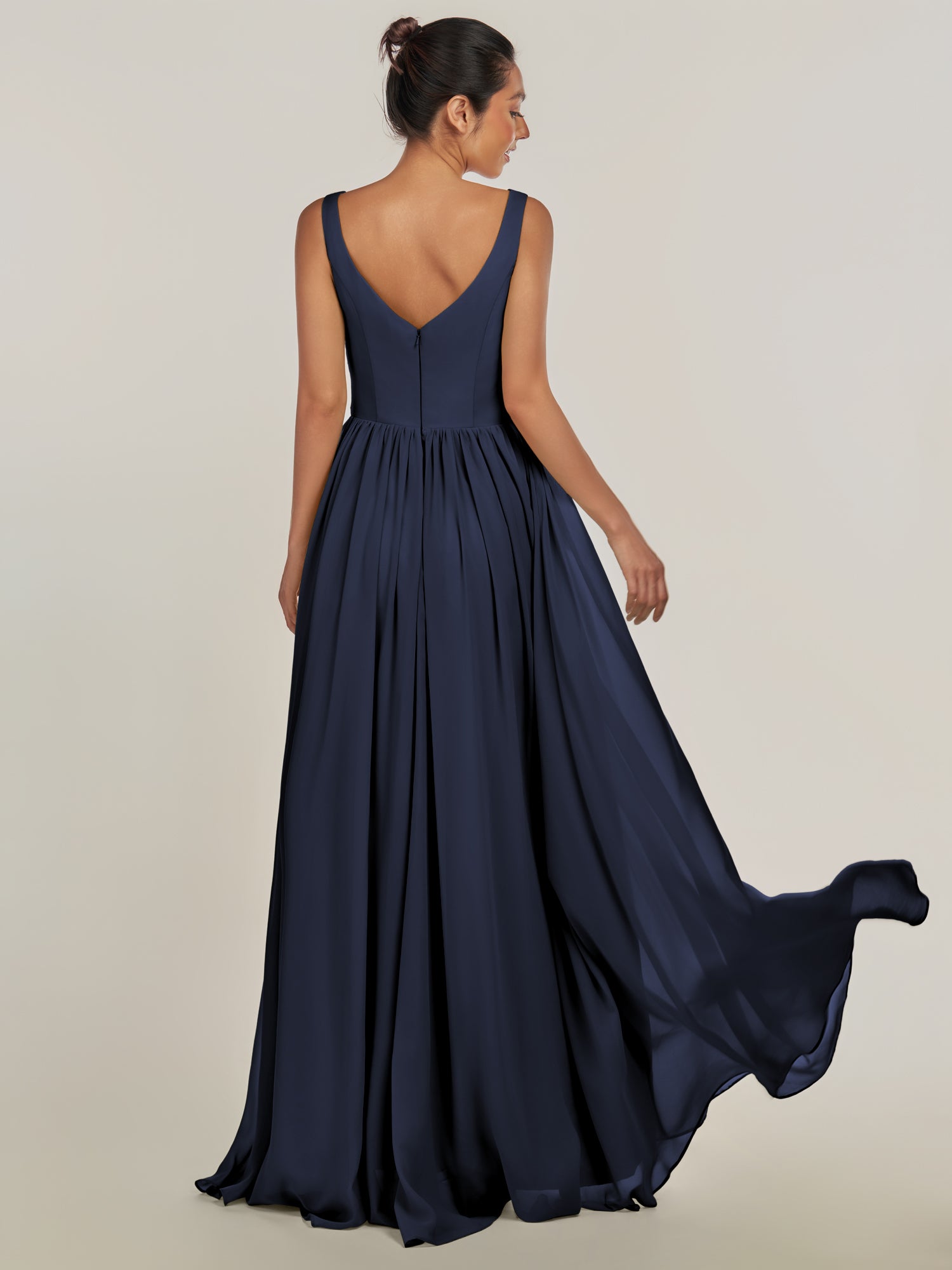 Cova embodies effortless elegance and modern grace. Crafted from soft chiffon, she features a flattering V-neckline and a sleeveless bodice that highlights the shoulders beautifully. Her floor-length A-line skirt flows with ease, while the subtle side slit adds a hint of allure and movement. Finished with a smooth zipper back, Cova is the perfect blend of simplicity and sophistication—ideal for weddings and timeless celebrations.