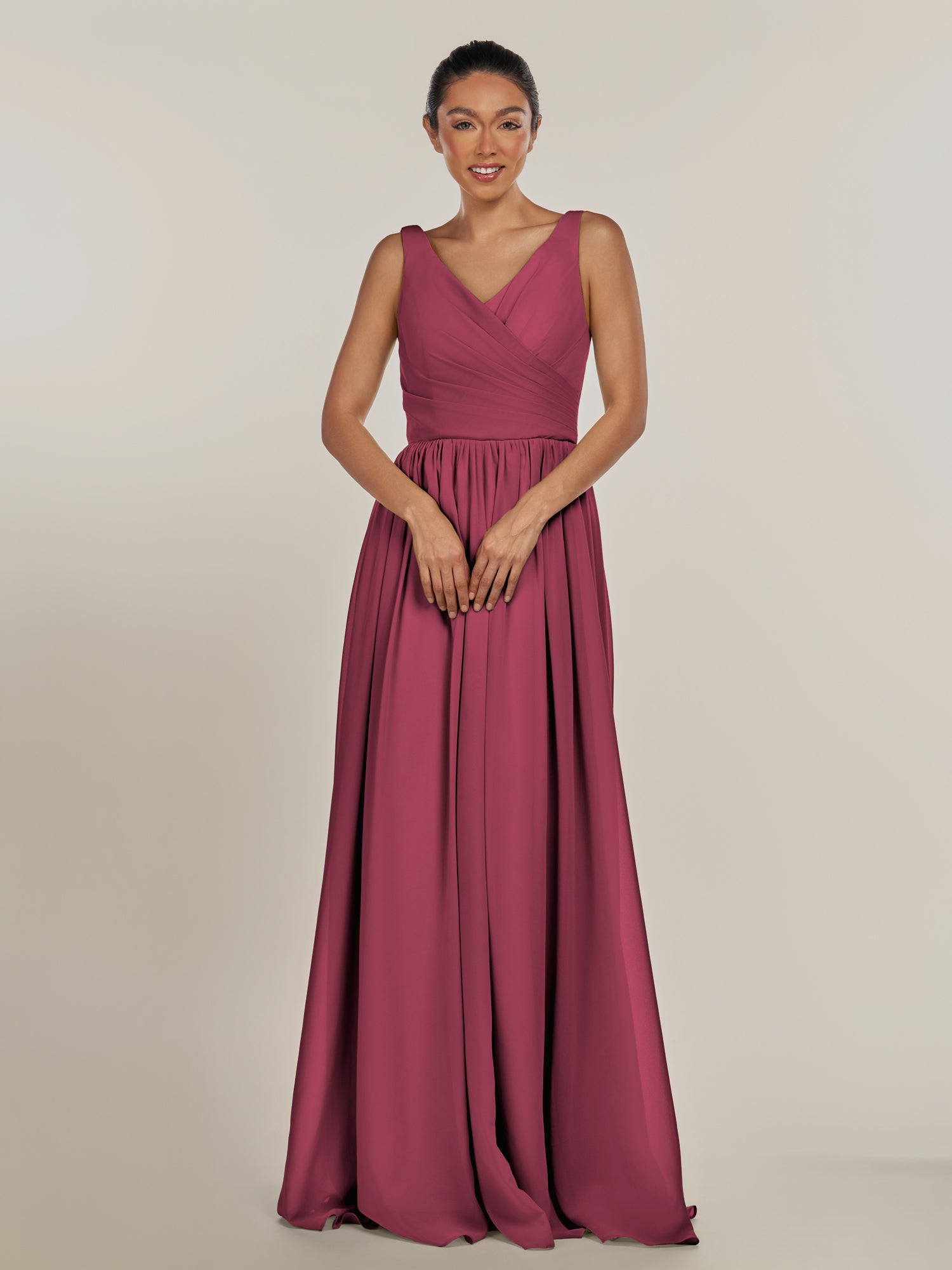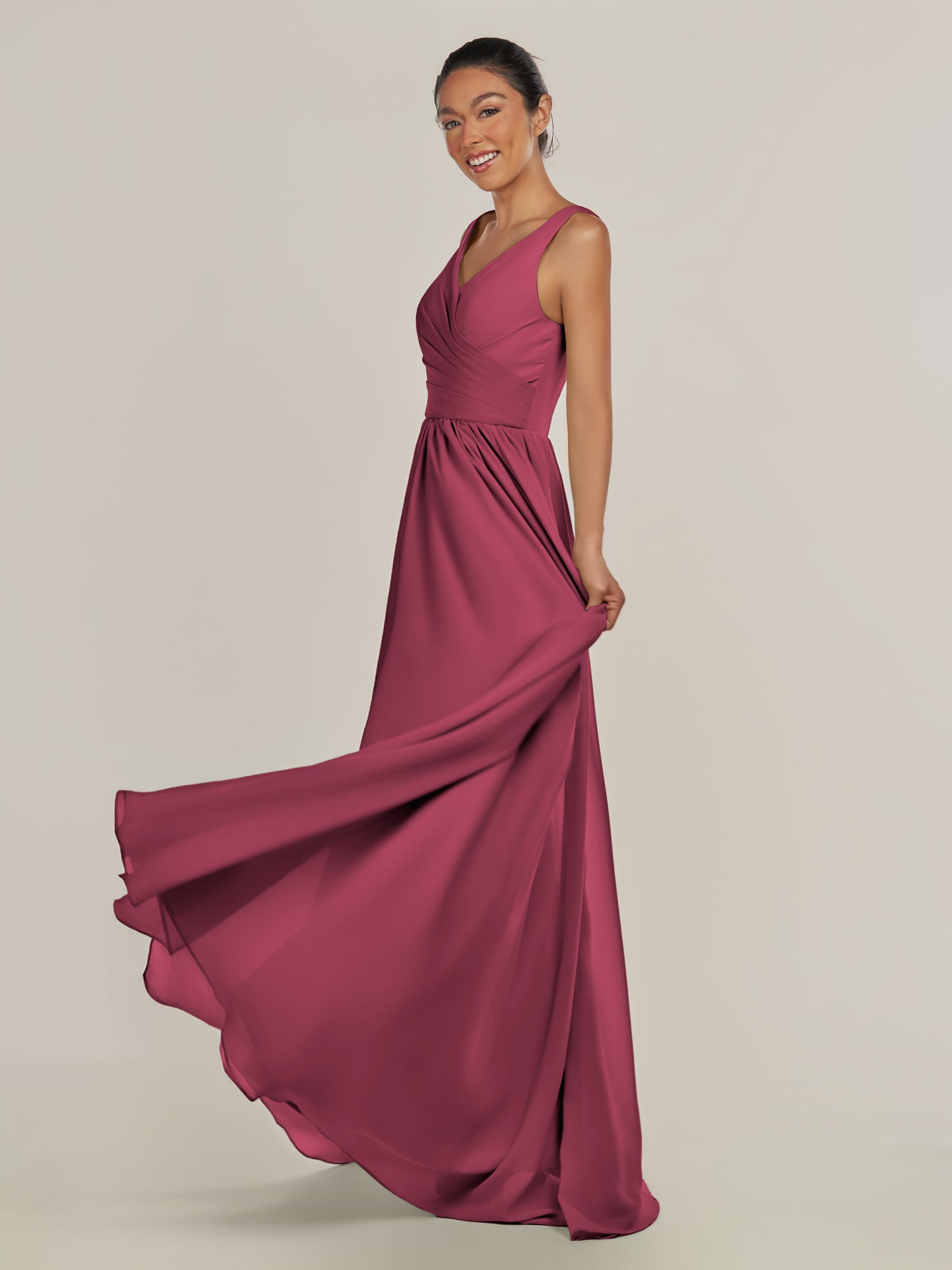 Cova embodies effortless elegance and modern grace. Crafted from soft chiffon, she features a flattering V-neckline and a sleeveless bodice that highlights the shoulders beautifully. Her floor-length A-line skirt flows with ease, while the subtle side slit adds a hint of allure and movement. Finished with a smooth zipper back, Cova is the perfect blend of simplicity and sophistication—ideal for weddings and timeless celebrations.