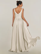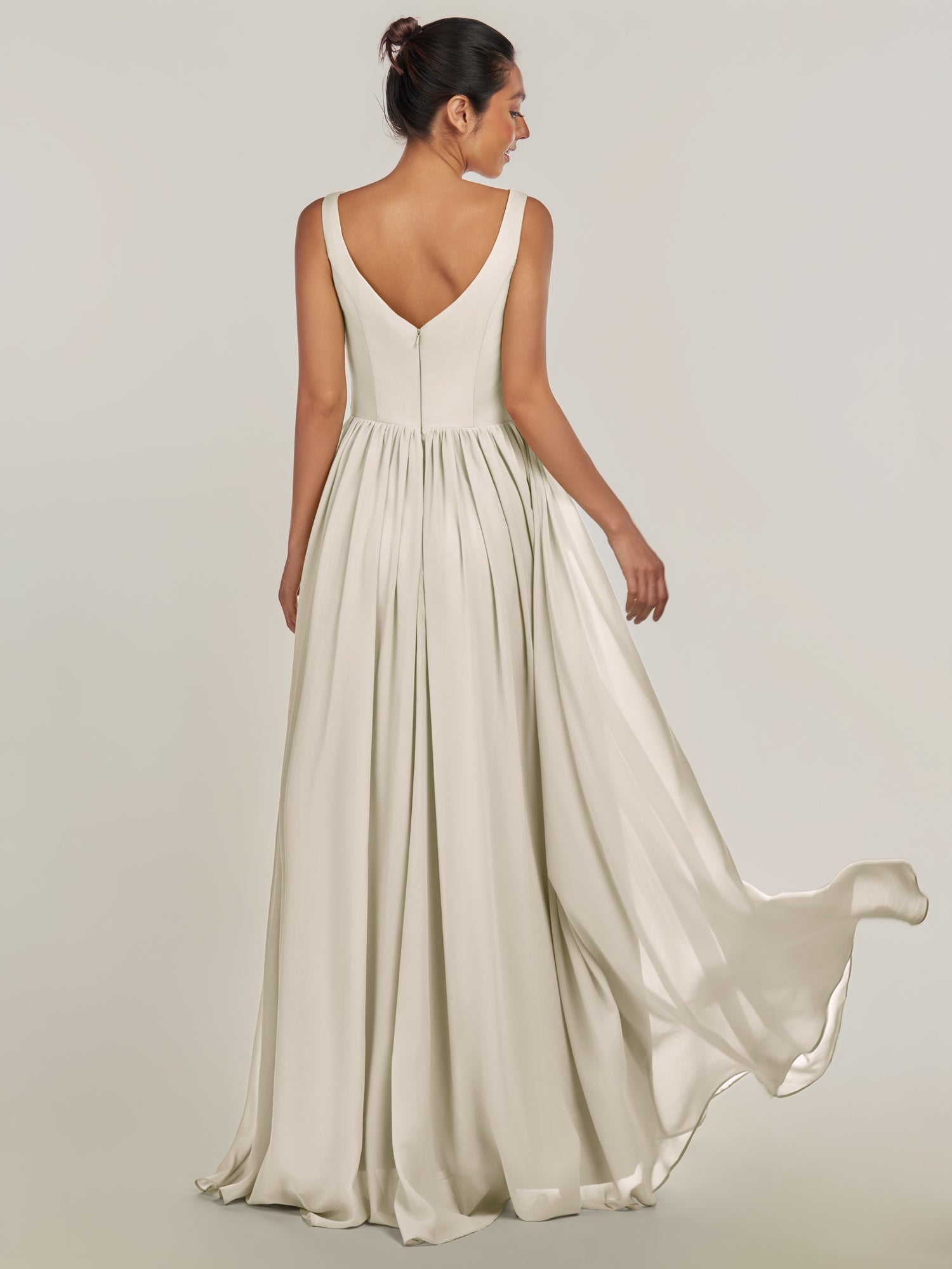 Cova embodies effortless elegance and modern grace. Crafted from soft chiffon, she features a flattering V-neckline and a sleeveless bodice that highlights the shoulders beautifully. Her floor-length A-line skirt flows with ease, while the subtle side slit adds a hint of allure and movement. Finished with a smooth zipper back, Cova is the perfect blend of simplicity and sophistication—ideal for weddings and timeless celebrations.