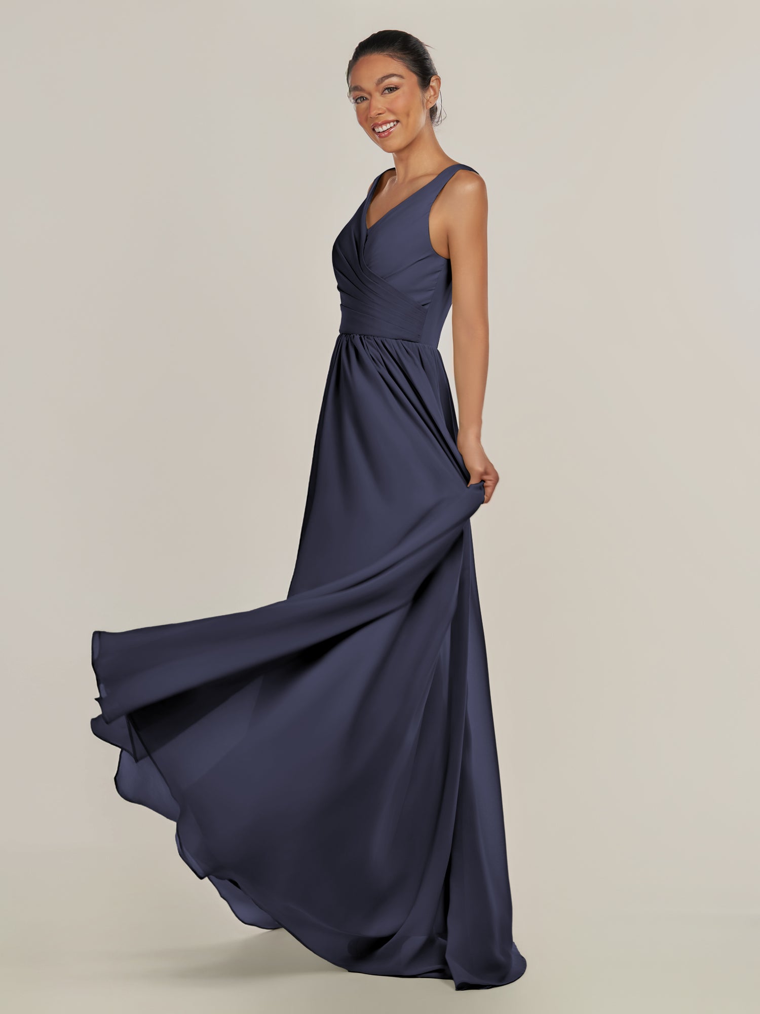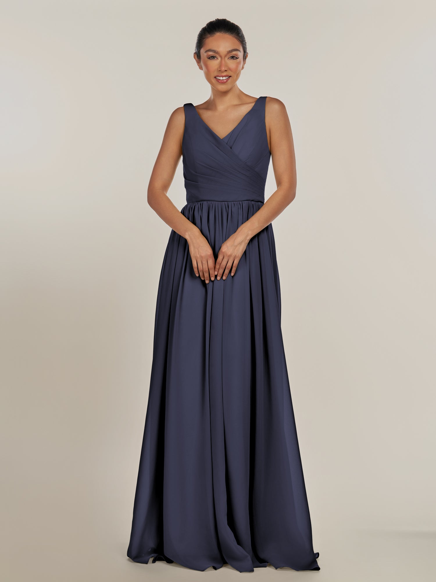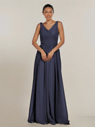 Cova embodies effortless elegance and modern grace. Crafted from soft chiffon, she features a flattering V-neckline and a sleeveless bodice that highlights the shoulders beautifully. Her floor-length A-line skirt flows with ease, while the subtle side slit adds a hint of allure and movement. Finished with a smooth zipper back, Cova is the perfect blend of simplicity and sophistication—ideal for weddings and timeless celebrations.