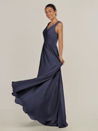 Cova | Dusk Blue - A Line Chiffon V Neck Long Bridesmaid Dress with Slit