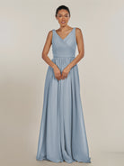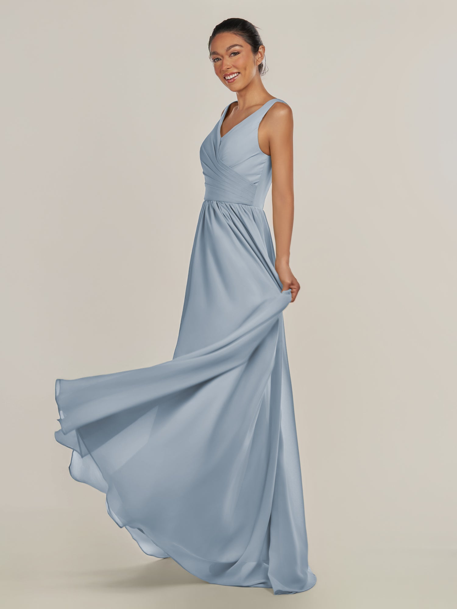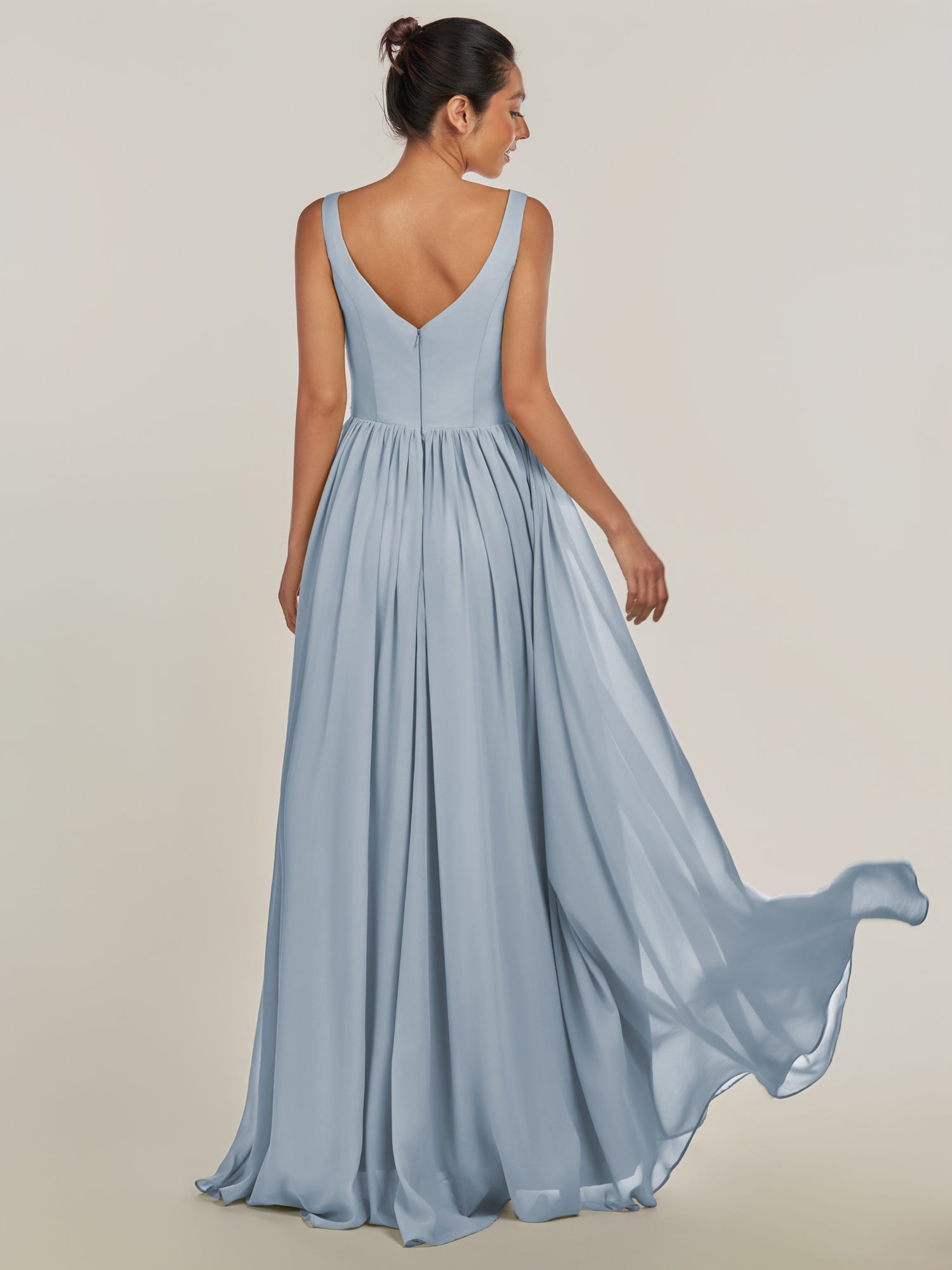 Cova | Dusty Blue - A Line Chiffon V Neck Long Bridesmaid Dress with Slit