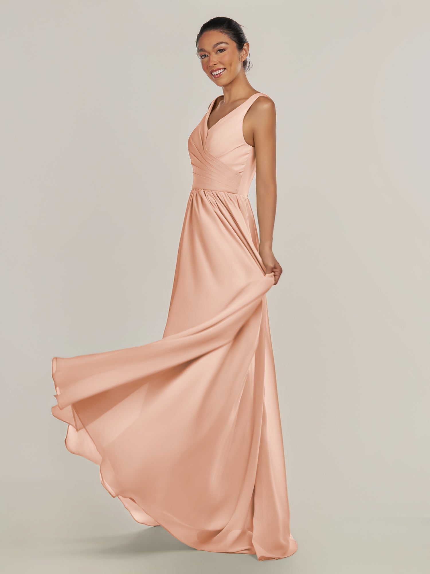 Cova embodies effortless elegance and modern grace. Crafted from soft chiffon, she features a flattering V-neckline and a sleeveless bodice that highlights the shoulders beautifully. Her floor-length A-line skirt flows with ease, while the subtle side slit adds a hint of allure and movement. Finished with a smooth zipper back, Cova is the perfect blend of simplicity and sophistication—ideal for weddings and timeless celebrations.