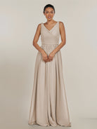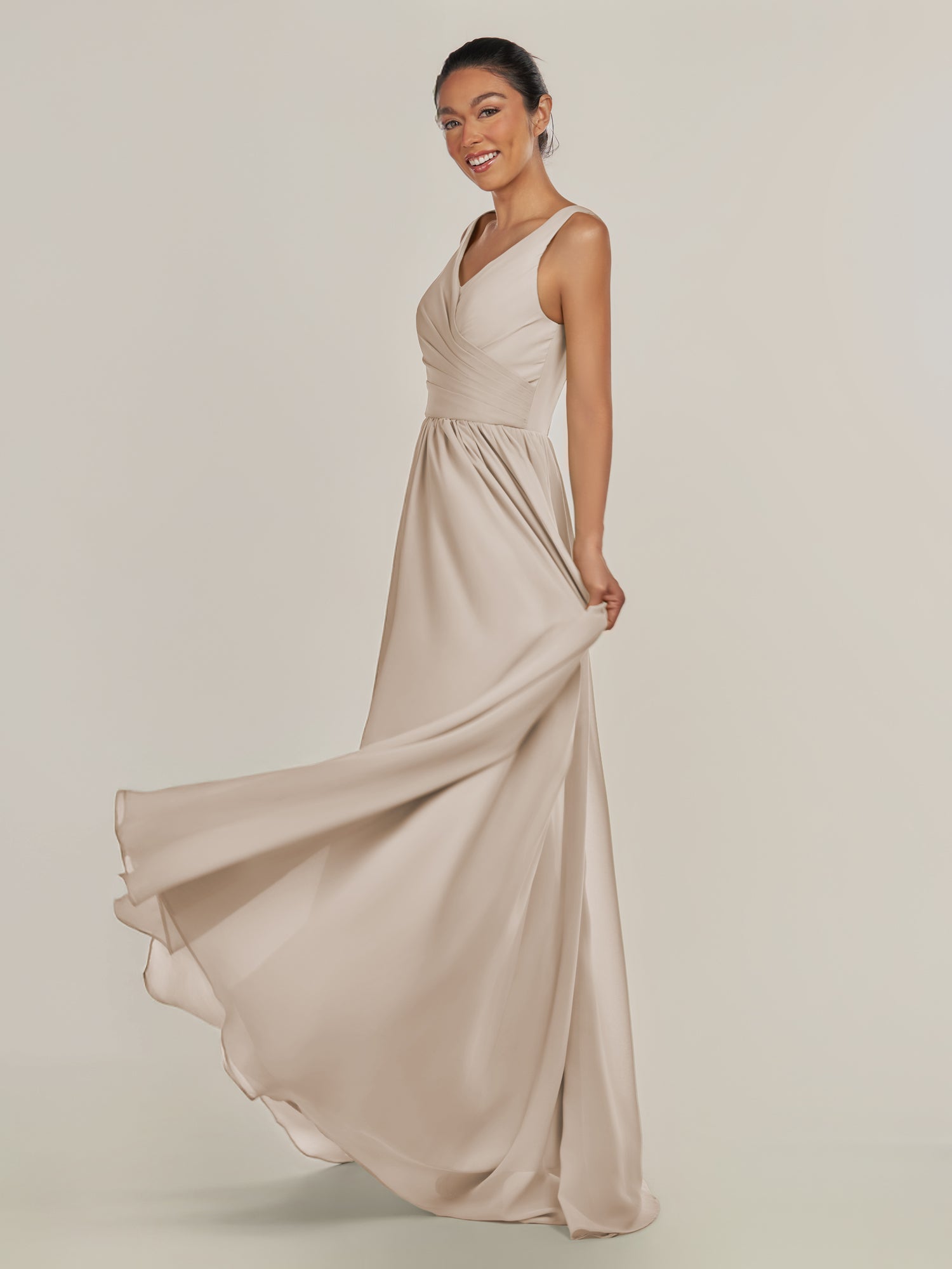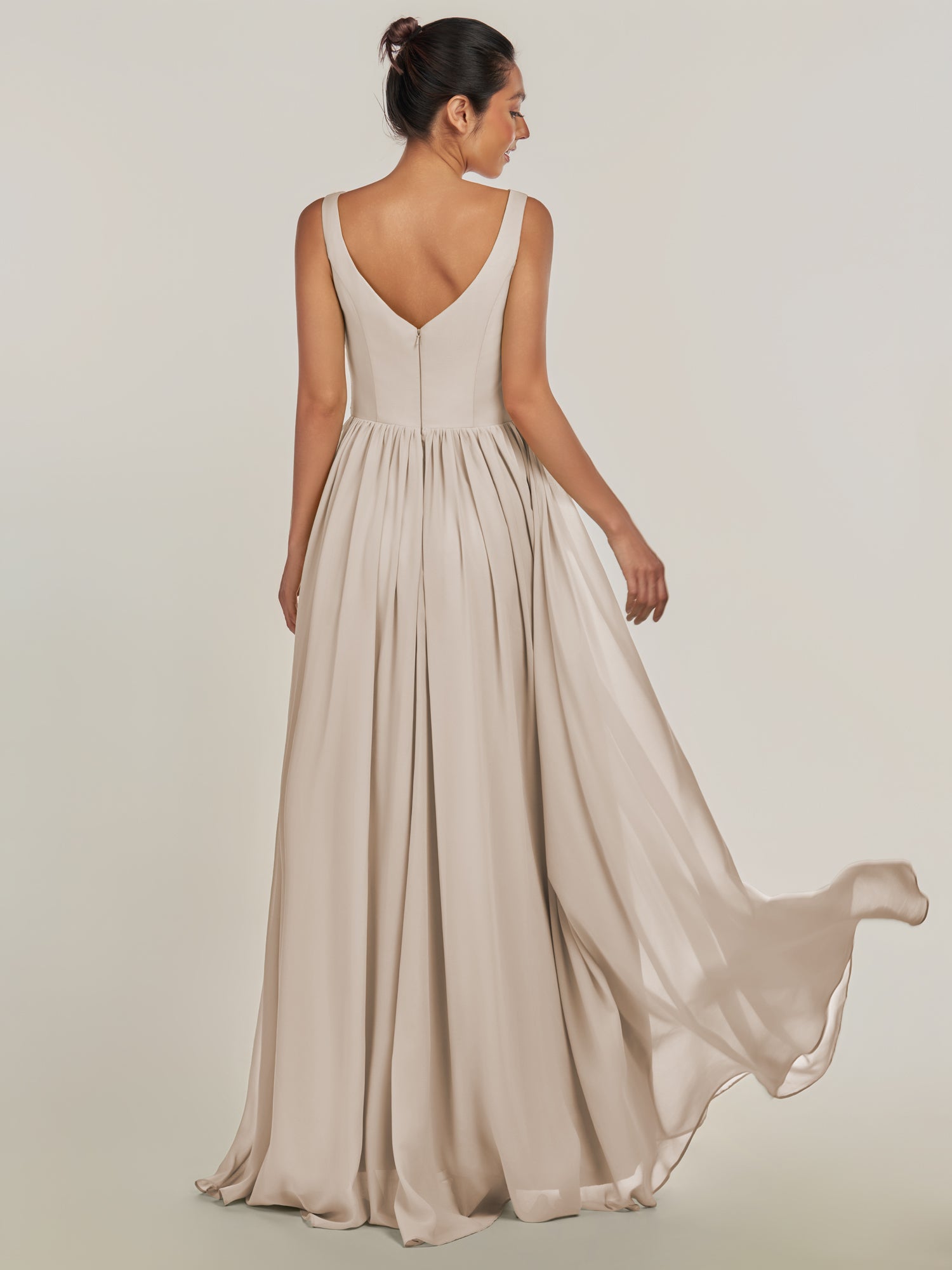 Cova embodies effortless elegance and modern grace. Crafted from soft chiffon, she features a flattering V-neckline and a sleeveless bodice that highlights the shoulders beautifully. Her floor-length A-line skirt flows with ease, while the subtle side slit adds a hint of allure and movement. Finished with a smooth zipper back, Cova is the perfect blend of simplicity and sophistication—ideal for weddings and timeless celebrations.