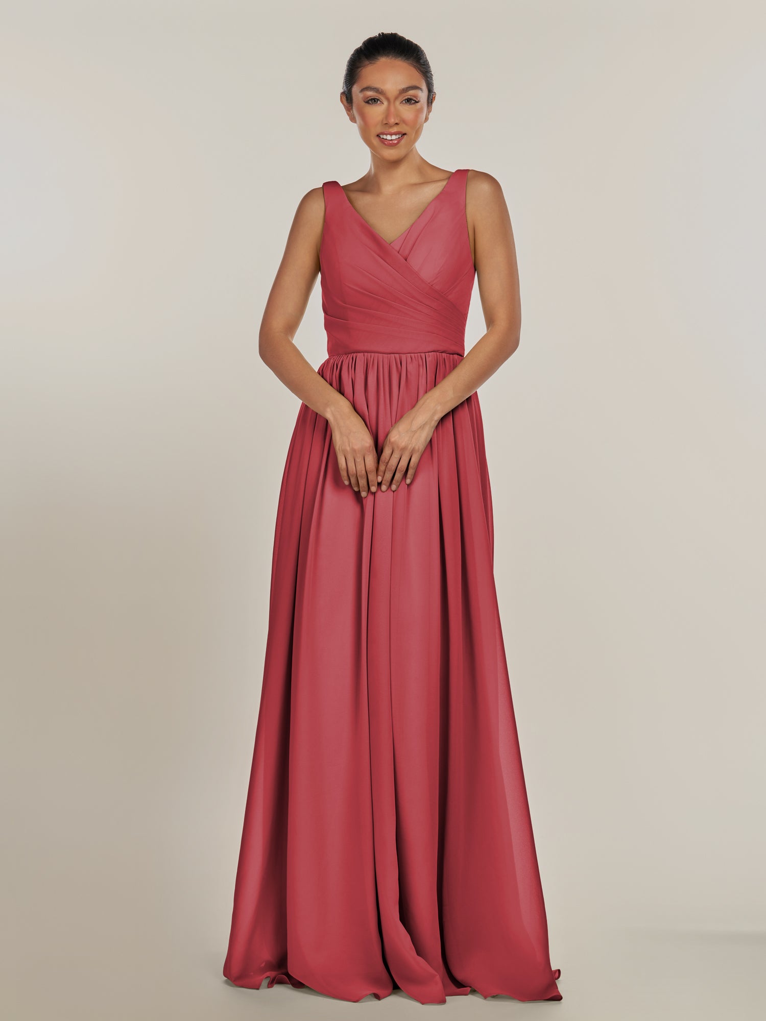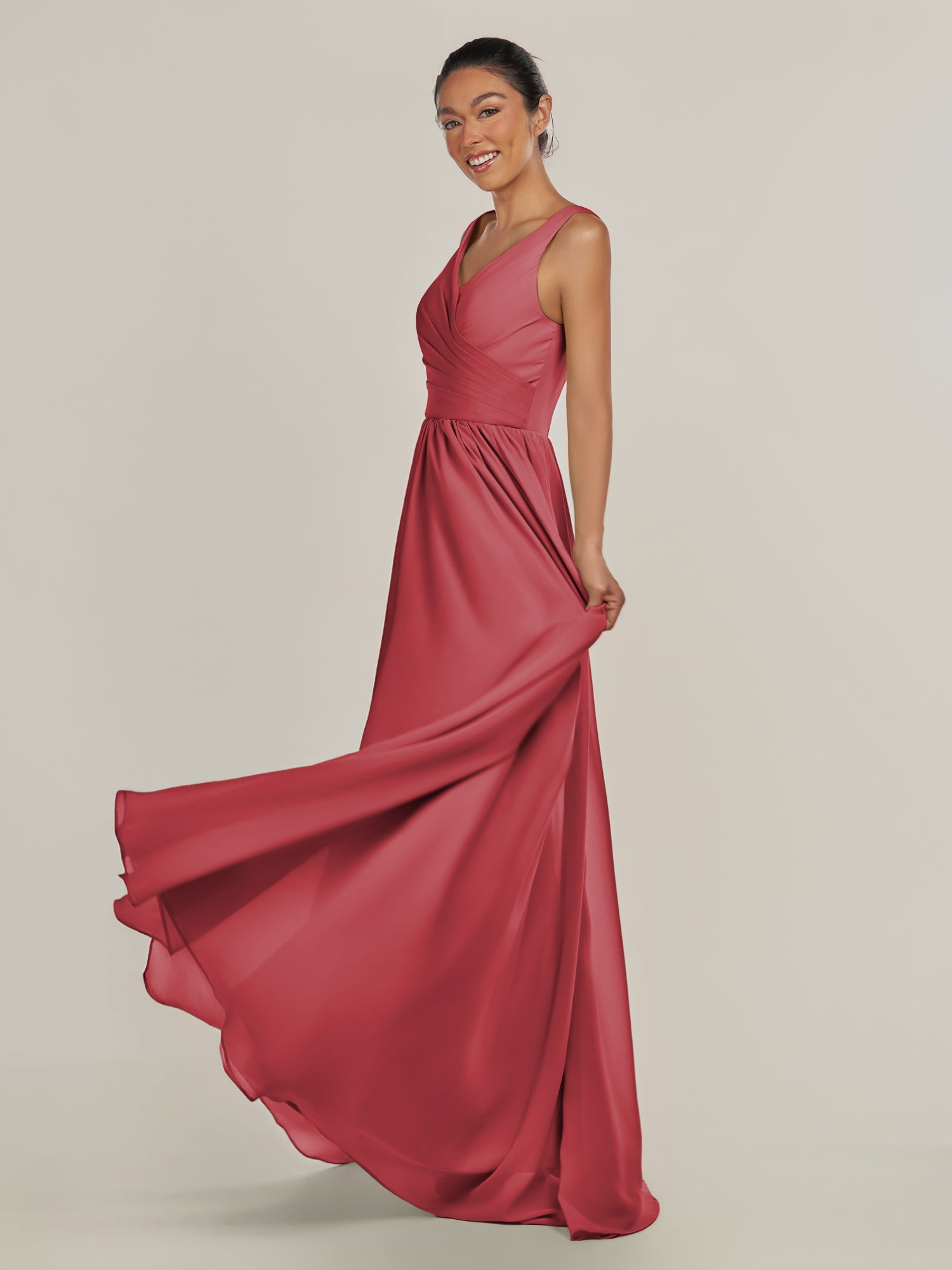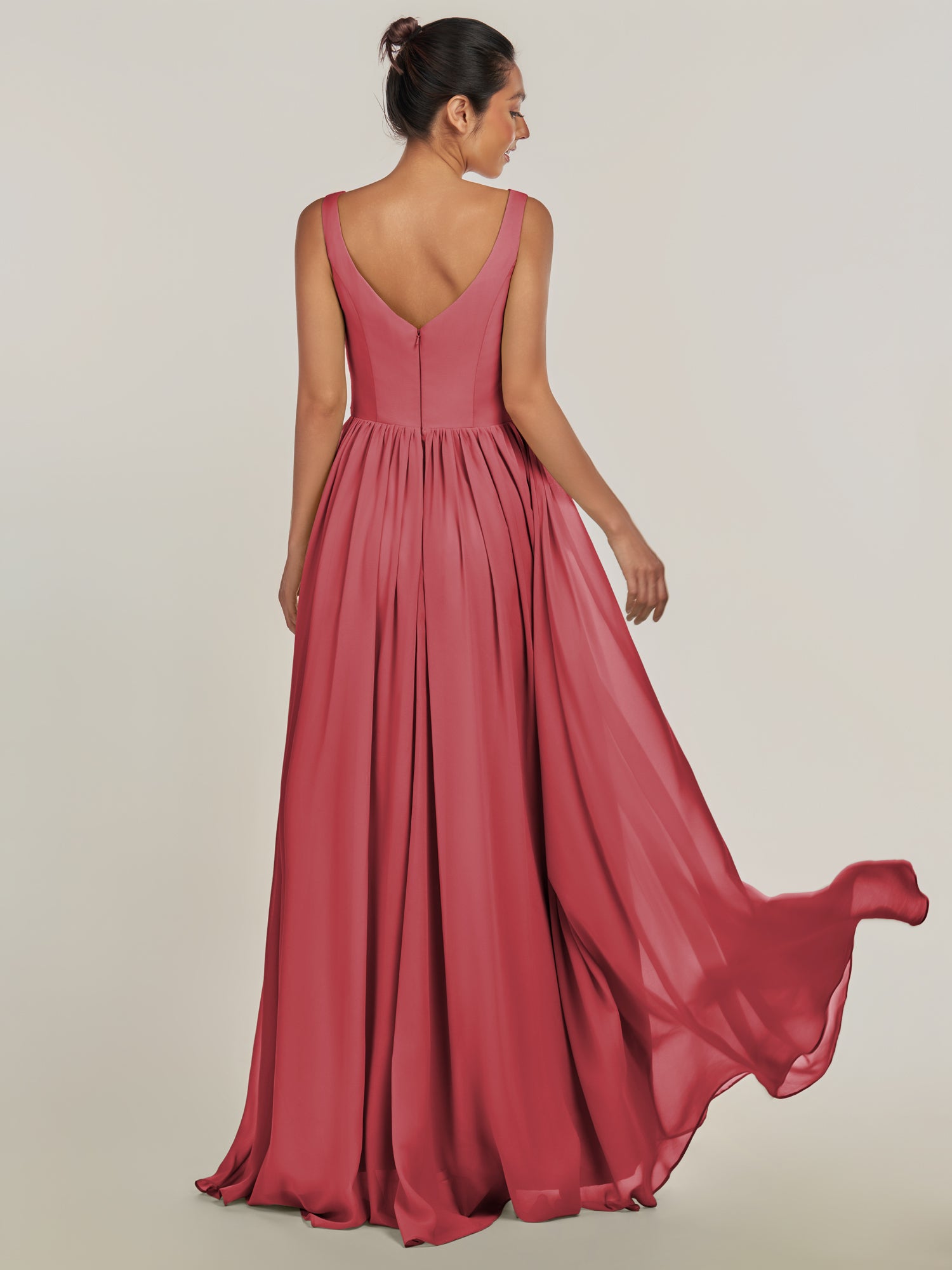 Cova embodies effortless elegance and modern grace. Crafted from soft chiffon, she features a flattering V-neckline and a sleeveless bodice that highlights the shoulders beautifully. Her floor-length A-line skirt flows with ease, while the subtle side slit adds a hint of allure and movement. Finished with a smooth zipper back, Cova is the perfect blend of simplicity and sophistication—ideal for weddings and timeless celebrations.
