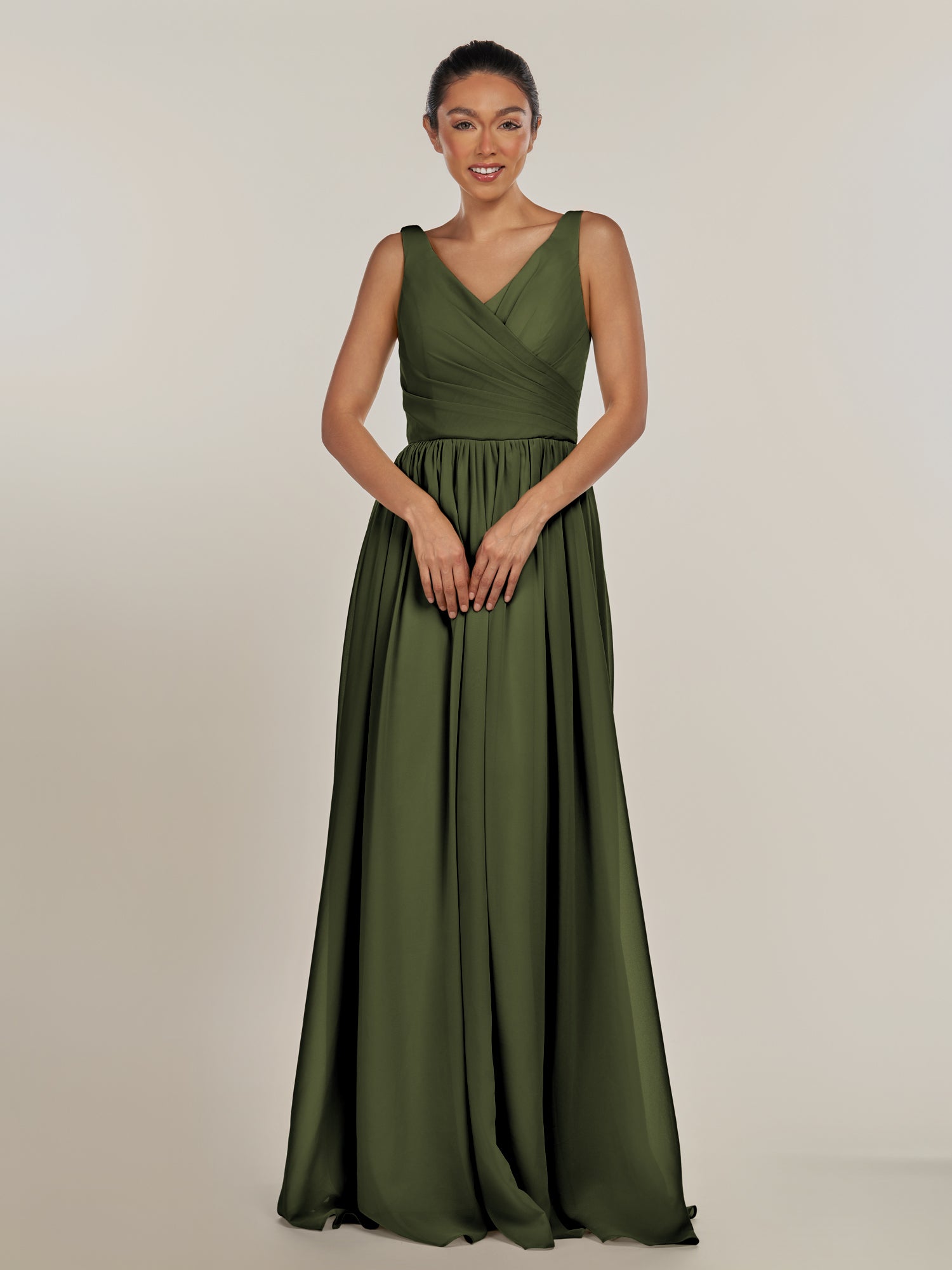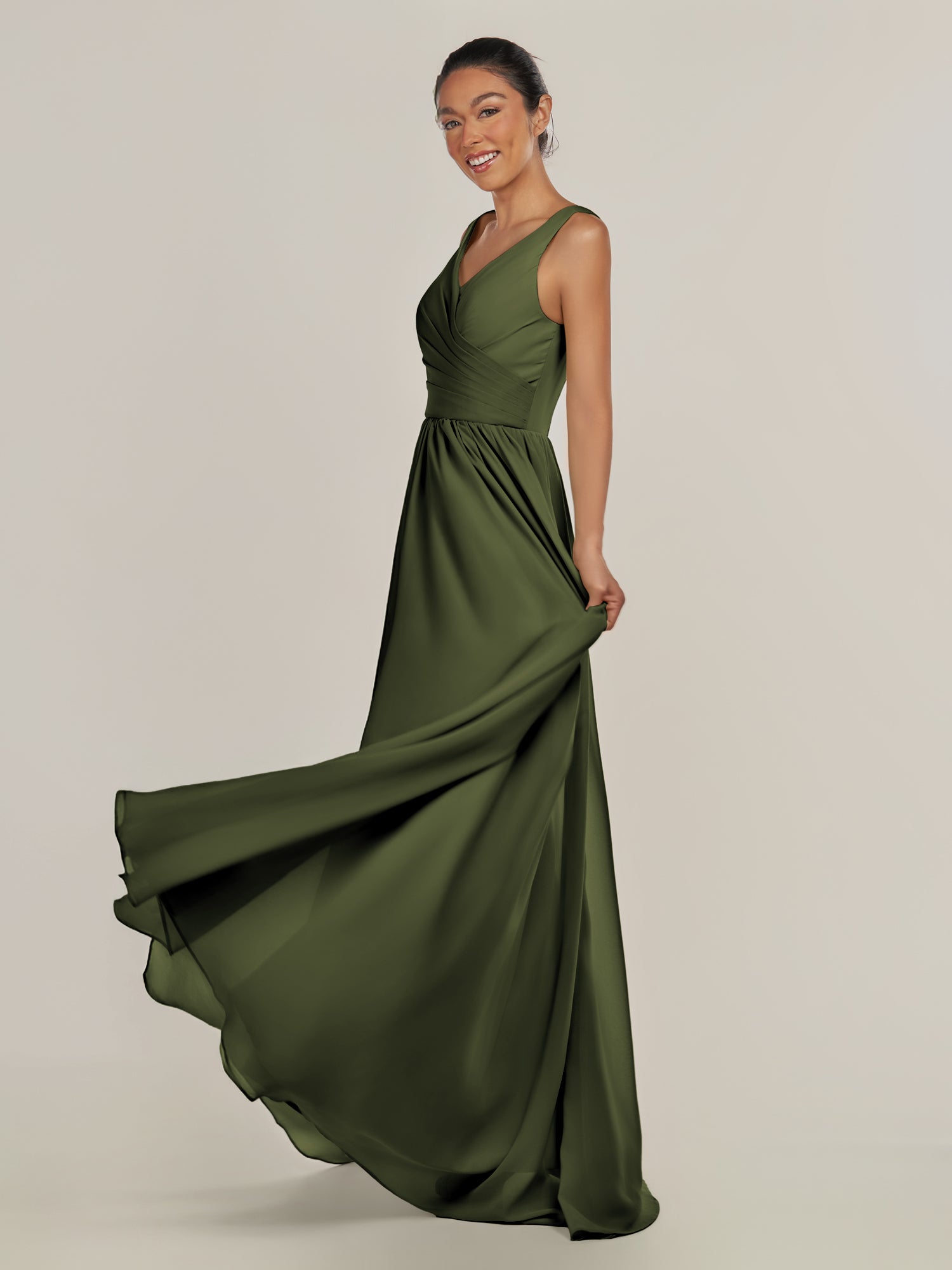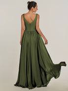 Cova | Olive - A Line Chiffon V Neck Long Bridesmaid Dress with Slit