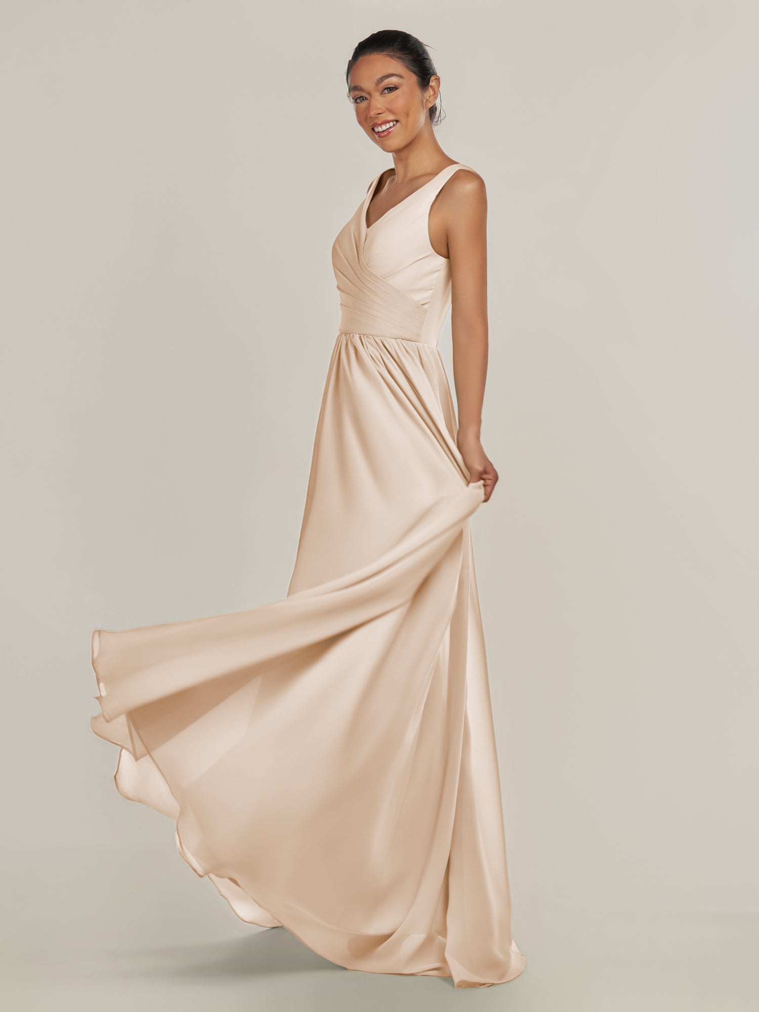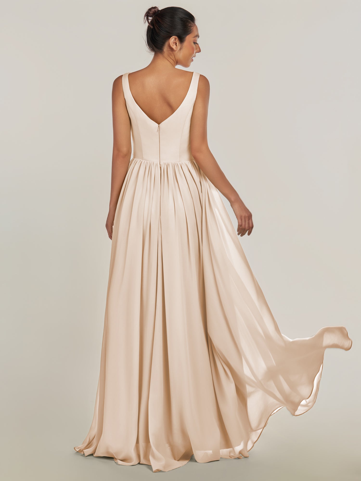 Cova embodies effortless elegance and modern grace. Crafted from soft chiffon, she features a flattering V-neckline and a sleeveless bodice that highlights the shoulders beautifully. Her floor-length A-line skirt flows with ease, while the subtle side slit adds a hint of allure and movement. Finished with a smooth zipper back, Cova is the perfect blend of simplicity and sophistication—ideal for weddings and timeless celebrations.