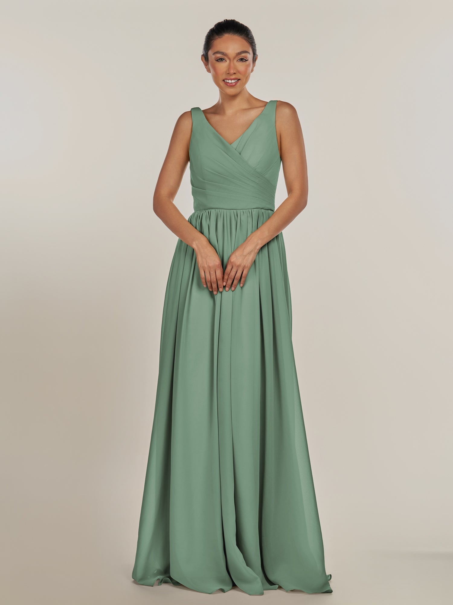 Cova embodies effortless elegance and modern grace. Crafted from soft chiffon, she features a flattering V-neckline and a sleeveless bodice that highlights the shoulders beautifully. Her floor-length A-line skirt flows with ease, while the subtle side slit adds a hint of allure and movement. Finished with a smooth zipper back, Cova is the perfect blend of simplicity and sophistication—ideal for weddings and timeless celebrations.