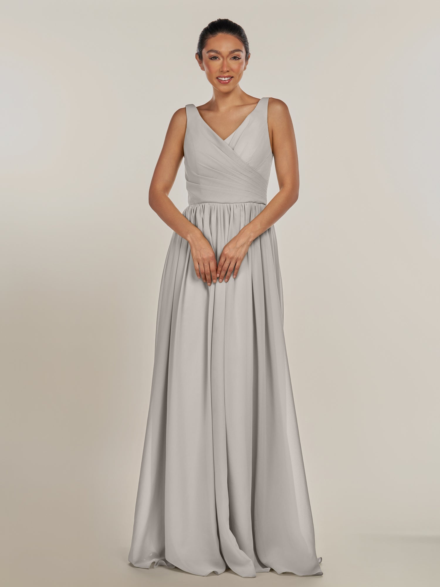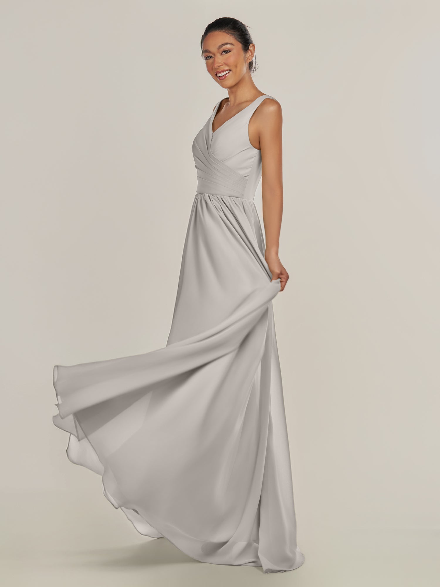 Cova embodies effortless elegance and modern grace. Crafted from soft chiffon, she features a flattering V-neckline and a sleeveless bodice that highlights the shoulders beautifully. Her floor-length A-line skirt flows with ease, while the subtle side slit adds a hint of allure and movement. Finished with a smooth zipper back, Cova is the perfect blend of simplicity and sophistication—ideal for weddings and timeless celebrations.