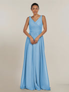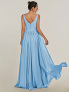 Cova | Steel Blue - A Line Chiffon V Neck Long Bridesmaid Dress with Slit