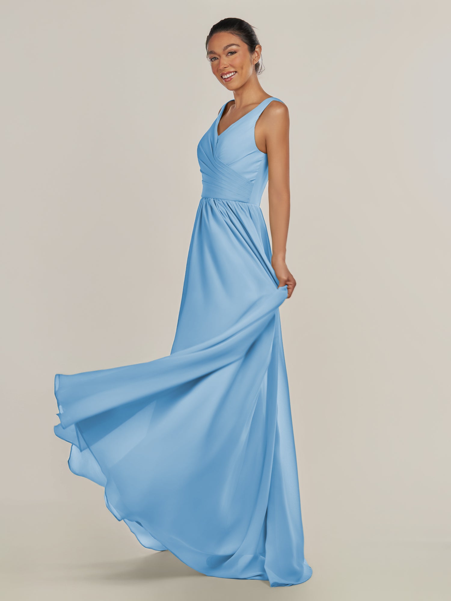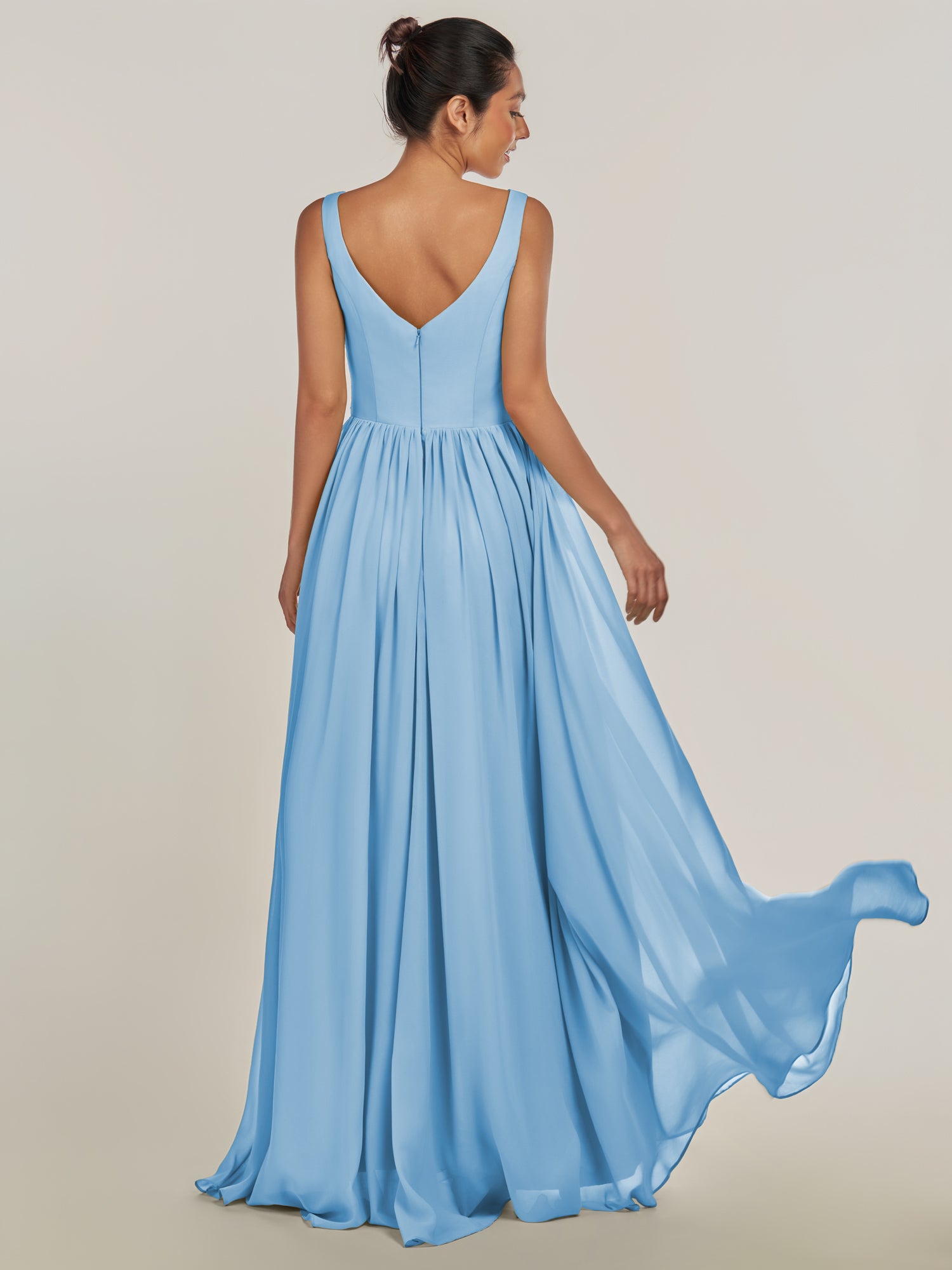 Cova embodies effortless elegance and modern grace. Crafted from soft chiffon, she features a flattering V-neckline and a sleeveless bodice that highlights the shoulders beautifully. Her floor-length A-line skirt flows with ease, while the subtle side slit adds a hint of allure and movement. Finished with a smooth zipper back, Cova is the perfect blend of simplicity and sophistication—ideal for weddings and timeless celebrations.