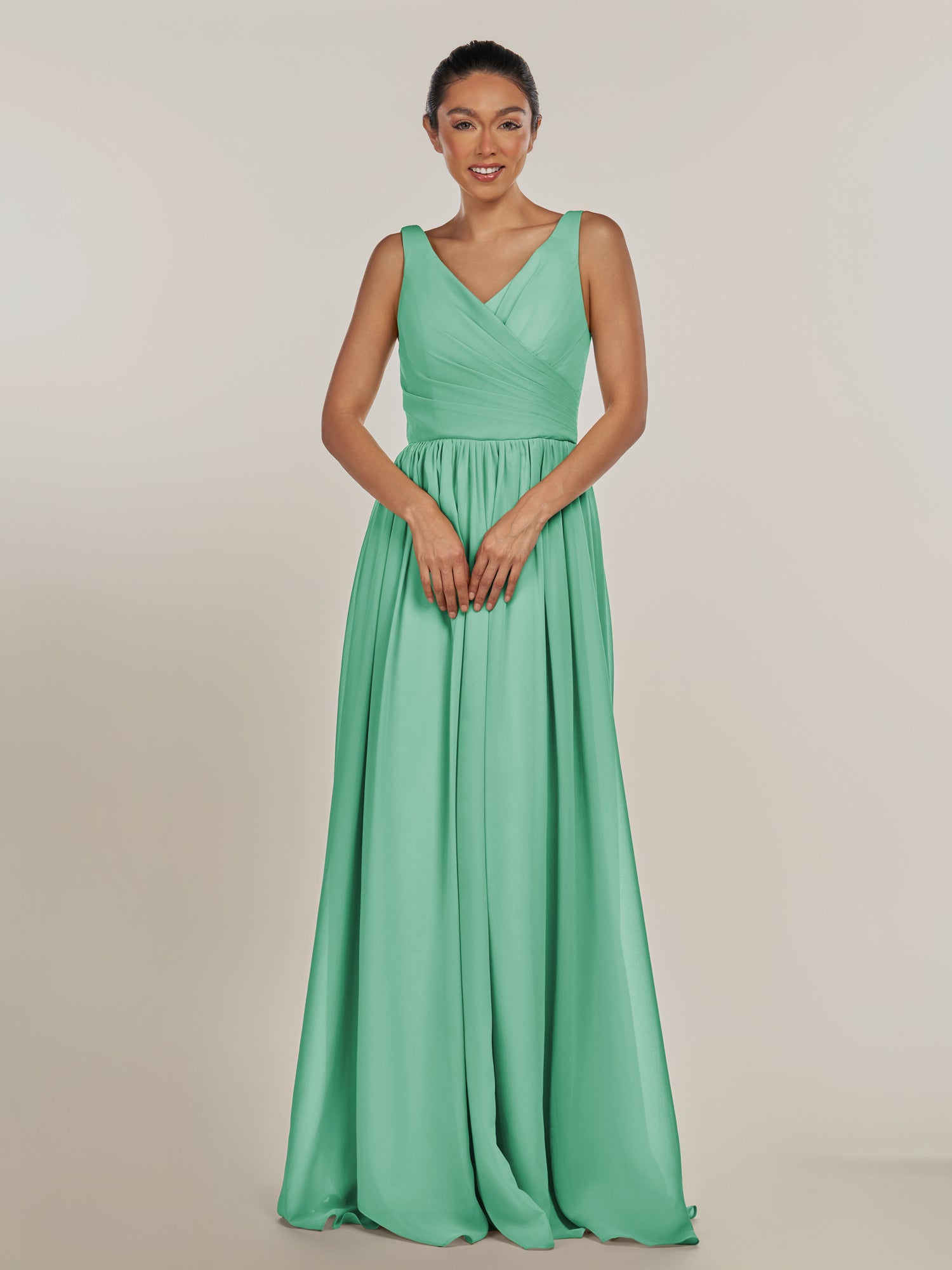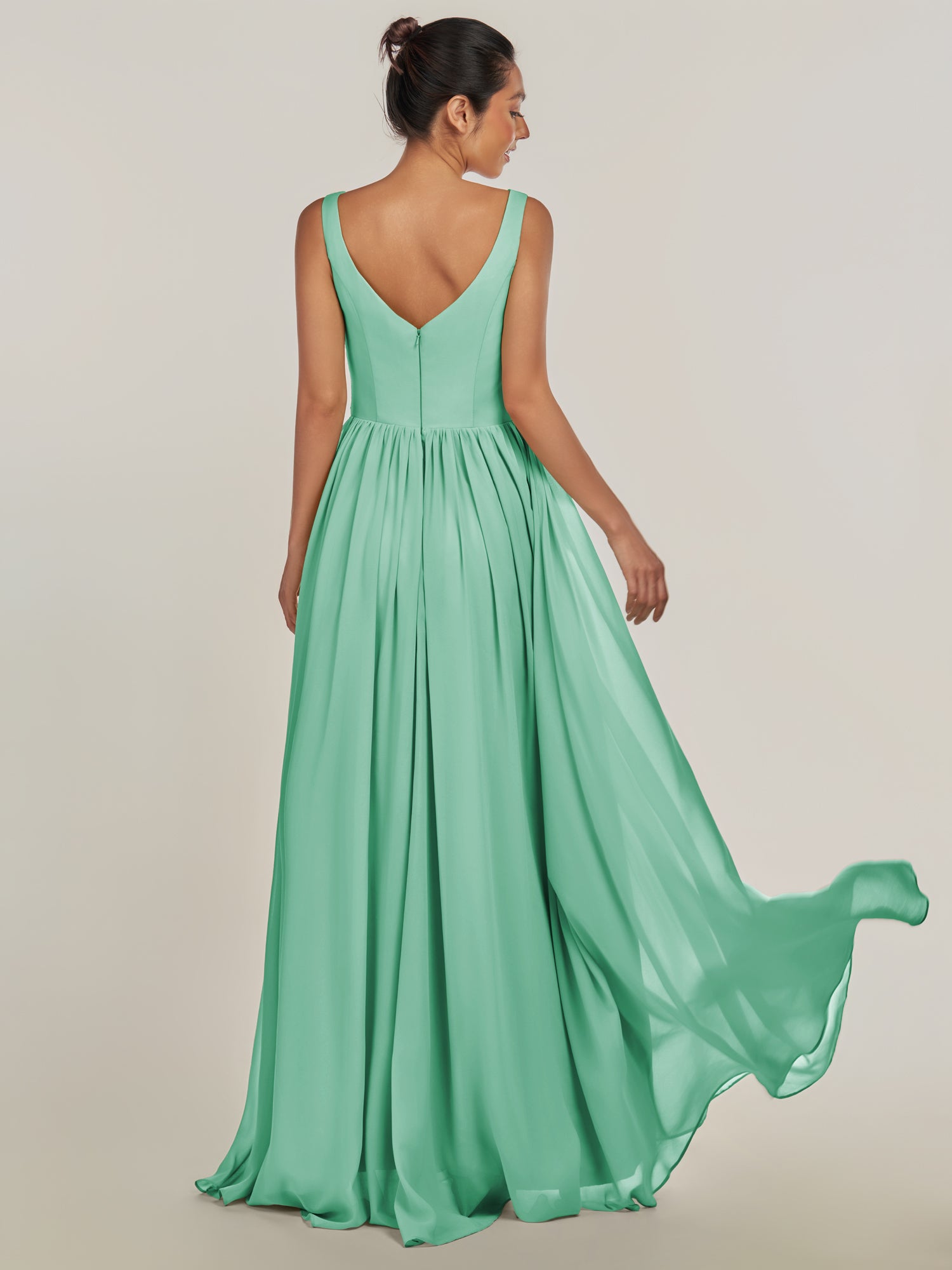 Cova embodies effortless elegance and modern grace. Crafted from soft chiffon, she features a flattering V-neckline and a sleeveless bodice that highlights the shoulders beautifully. Her floor-length A-line skirt flows with ease, while the subtle side slit adds a hint of allure and movement. Finished with a smooth zipper back, Cova is the perfect blend of simplicity and sophistication—ideal for weddings and timeless celebrations.