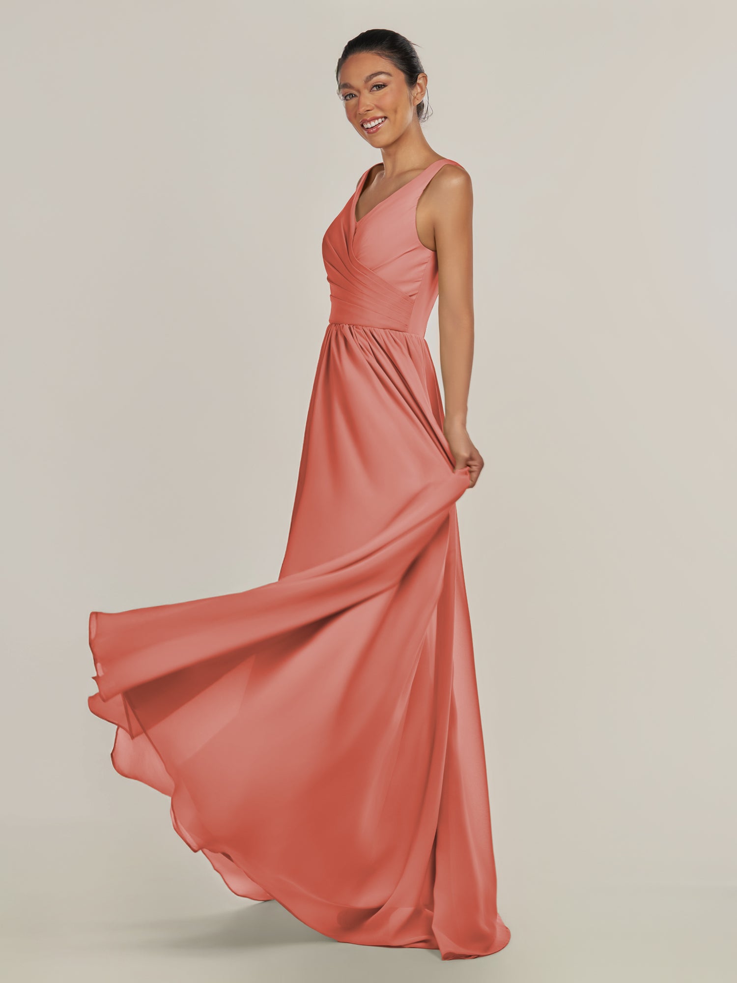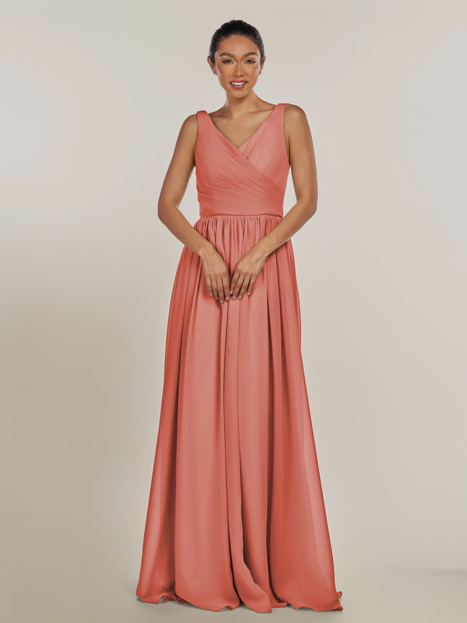 Cova embodies effortless elegance and modern grace. Crafted from soft chiffon, she features a flattering V-neckline and a sleeveless bodice that highlights the shoulders beautifully. Her floor-length A-line skirt flows with ease, while the subtle side slit adds a hint of allure and movement. Finished with a smooth zipper back, Cova is the perfect blend of simplicity and sophistication—ideal for weddings and timeless celebrations.