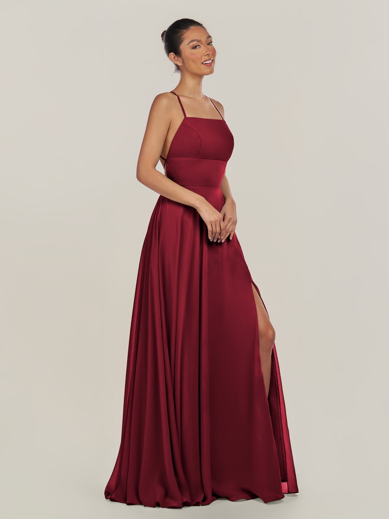 Dena is a timeless blend of simplicity and charm. Crafted from soft chiffon, she features delicate spaghetti straps that frame a flattering neckline and a fitted bodice for an effortlessly elegant look. Her floor-length A-line skirt flows gracefully with every step, highlighted by a subtle side slit that adds a touch of modern ease. Finished with a smooth zipper back, Dena embodies understated sophistication—perfect for weddings and graceful celebrations.