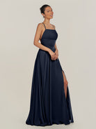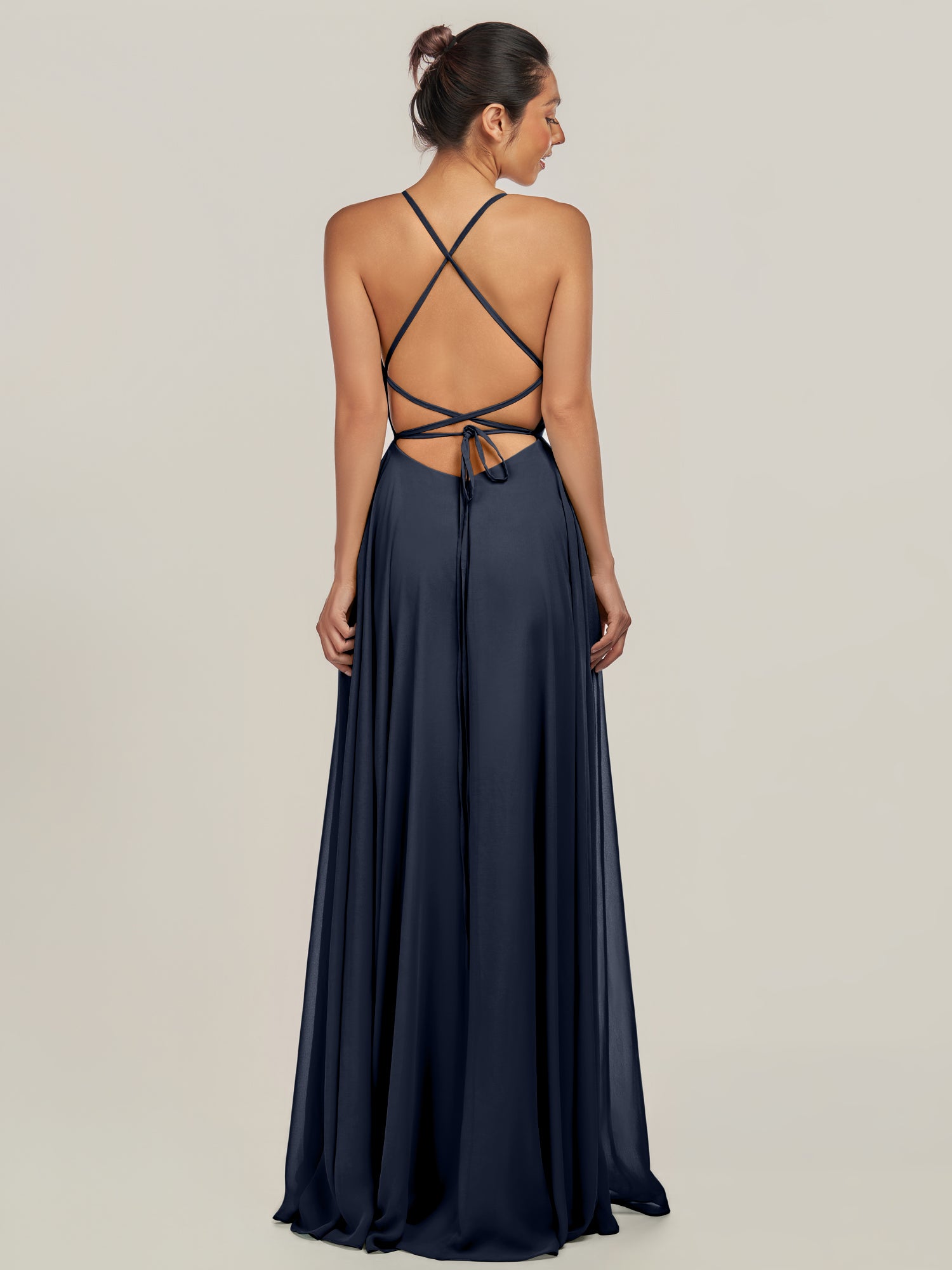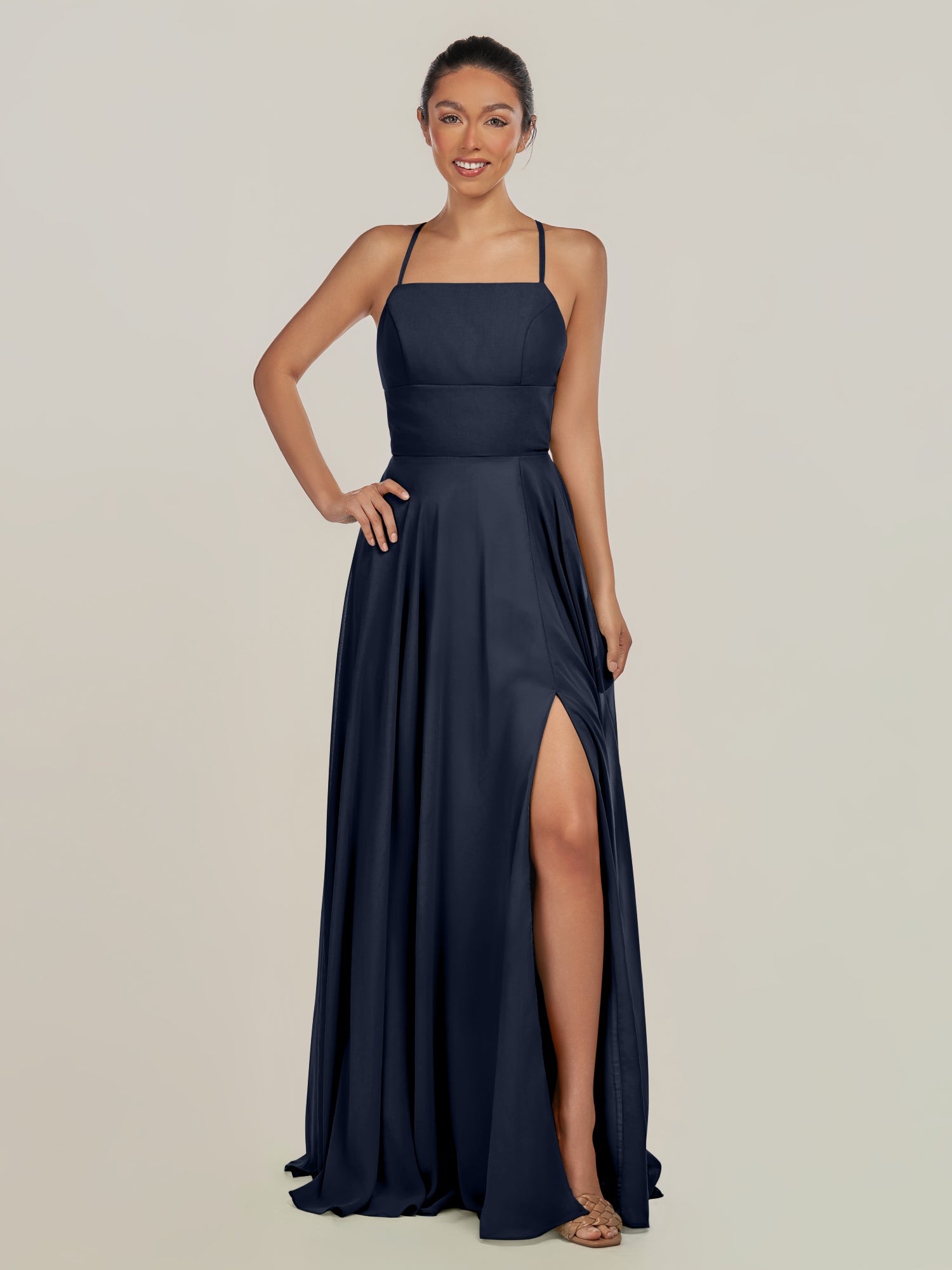 Dena | Dark Navy - A Line Chiffon Spaghetti Straps Long Bridesmaid Dress with Slit