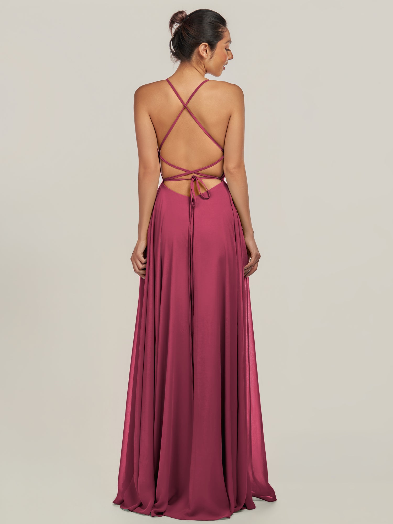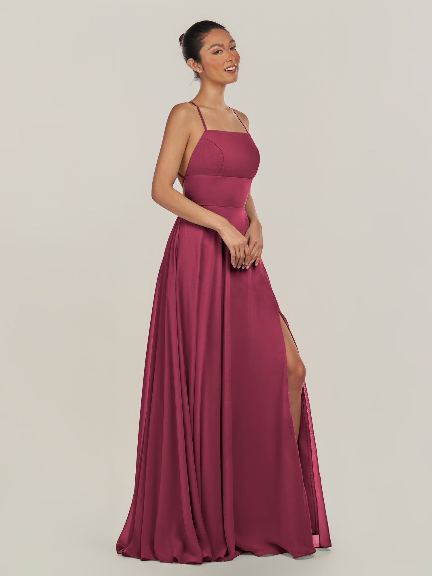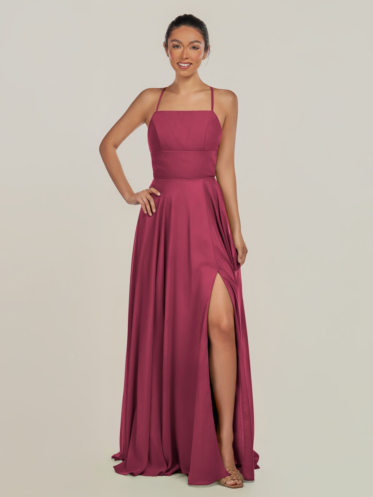 Dena is a timeless blend of simplicity and charm. Crafted from soft chiffon, she features delicate spaghetti straps that frame a flattering neckline and a fitted bodice for an effortlessly elegant look. Her floor-length A-line skirt flows gracefully with every step, highlighted by a subtle side slit that adds a touch of modern ease. Finished with a smooth zipper back, Dena embodies understated sophistication—perfect for weddings and graceful celebrations.