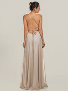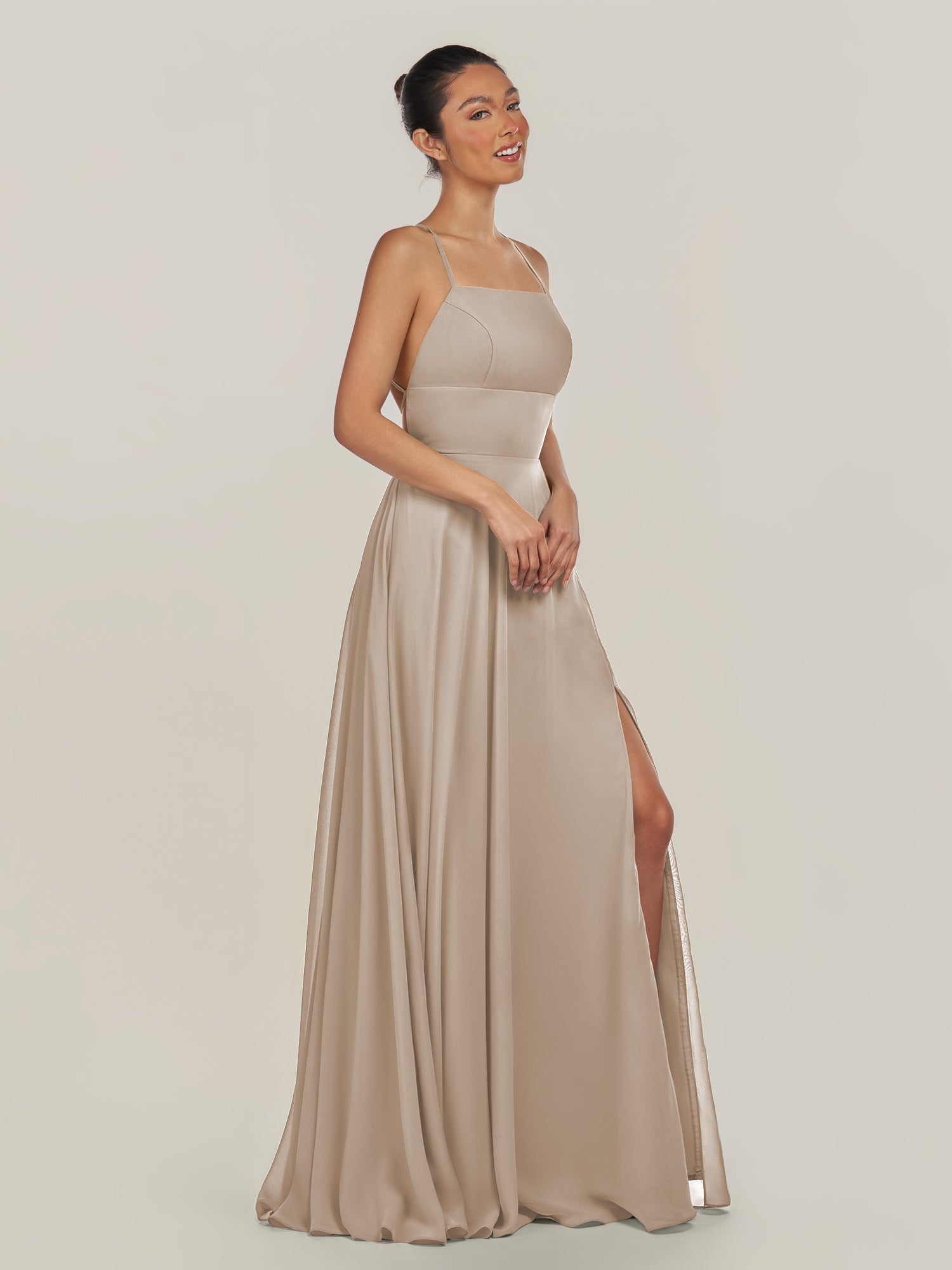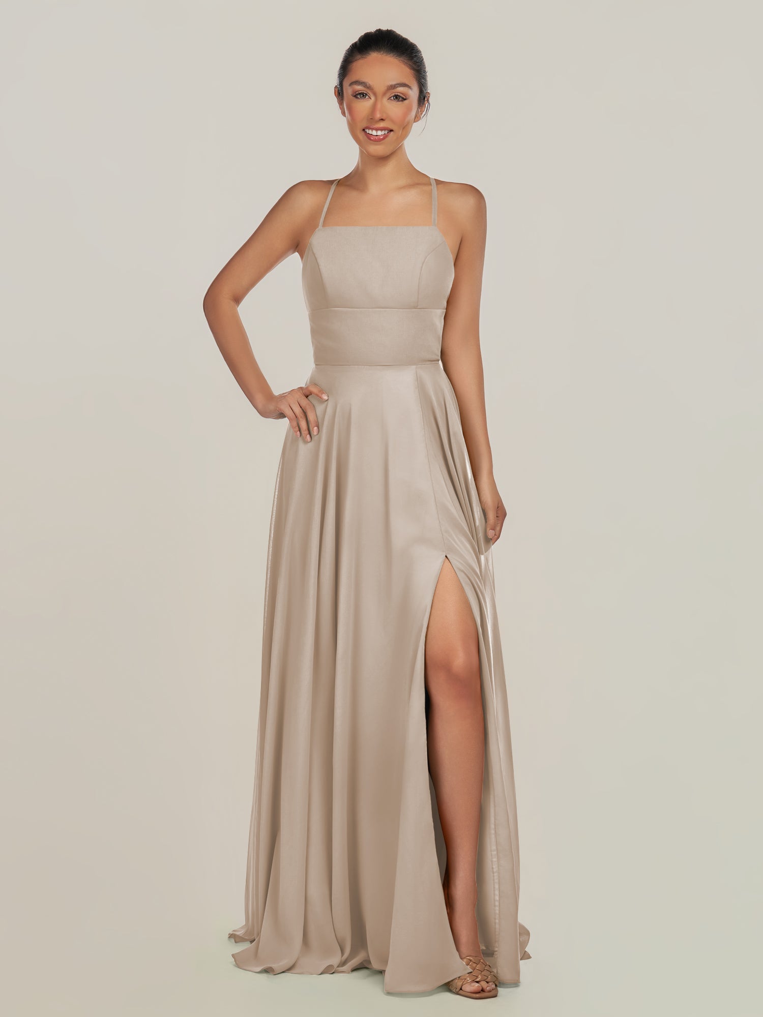 Dena is a timeless blend of simplicity and charm. Crafted from soft chiffon, she features delicate spaghetti straps that frame a flattering neckline and a fitted bodice for an effortlessly elegant look. Her floor-length A-line skirt flows gracefully with every step, highlighted by a subtle side slit that adds a touch of modern ease. Finished with a smooth zipper back, Dena embodies understated sophistication—perfect for weddings and graceful celebrations.