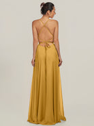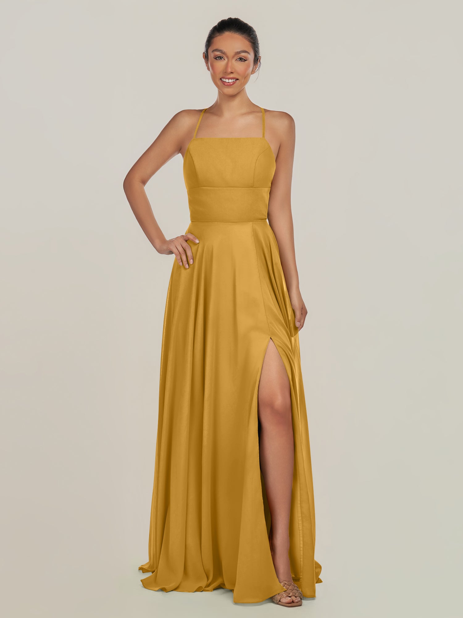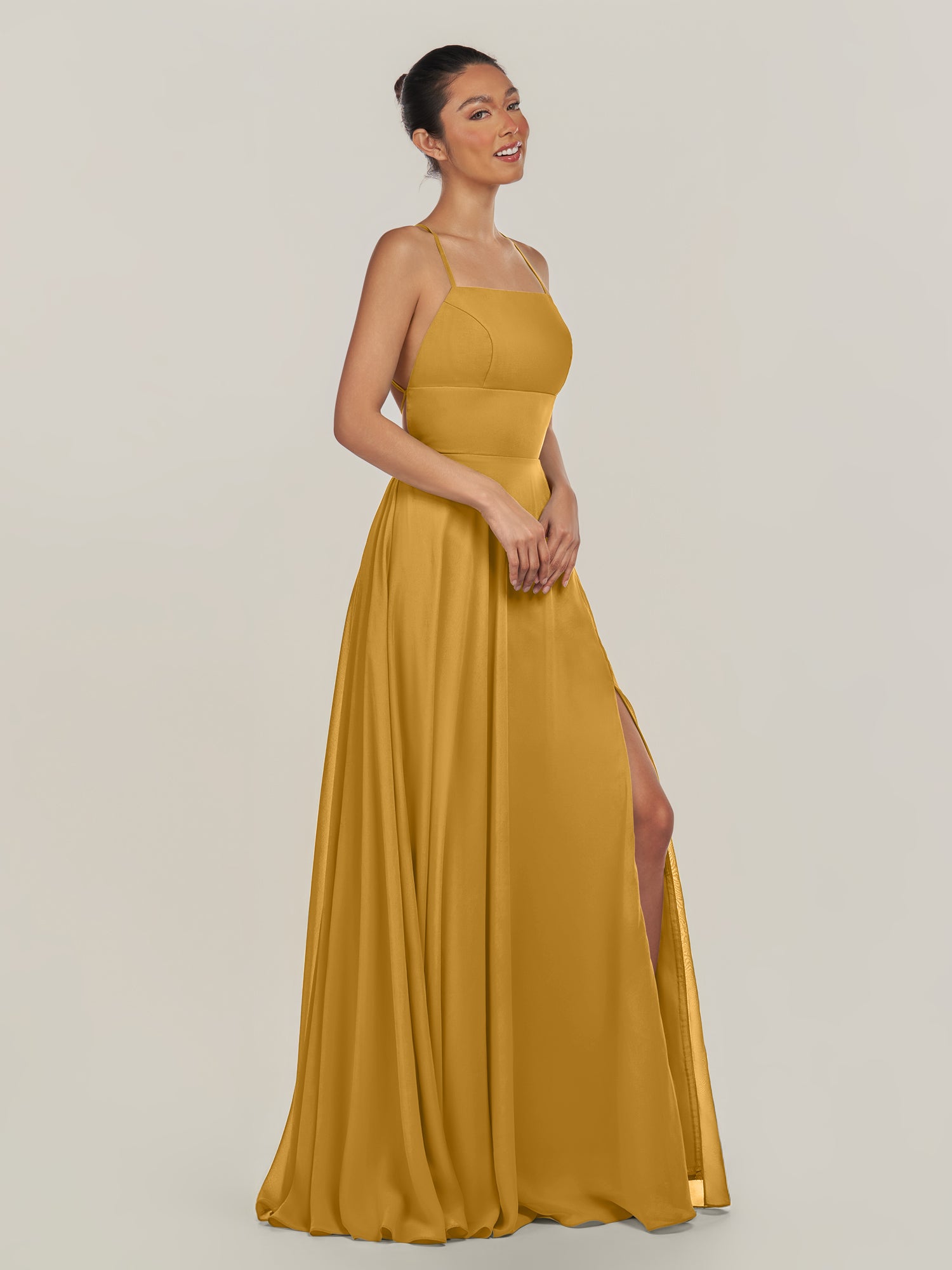 Dena | Marigold - A Line Chiffon Spaghetti Straps Long Bridesmaid Dress with Slit