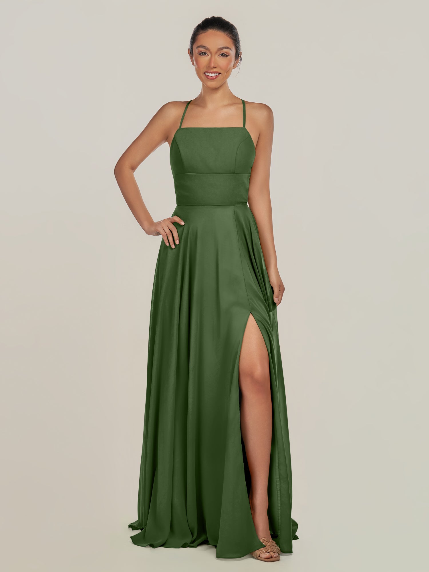 Dena is a timeless blend of simplicity and charm. Crafted from soft chiffon, she features delicate spaghetti straps that frame a flattering neckline and a fitted bodice for an effortlessly elegant look. Her floor-length A-line skirt flows gracefully with every step, highlighted by a subtle side slit that adds a touch of modern ease. Finished with a smooth zipper back, Dena embodies understated sophistication—perfect for weddings and graceful celebrations.