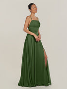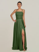 Dena | Moss - A Line Chiffon Spaghetti Straps Long Bridesmaid Dress with Slit