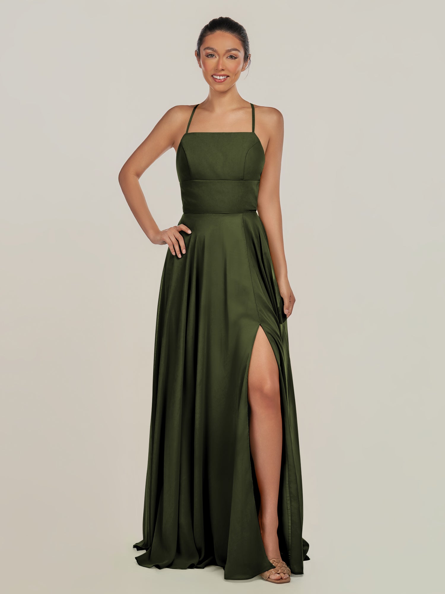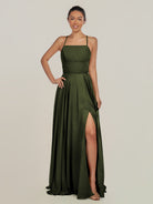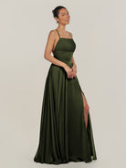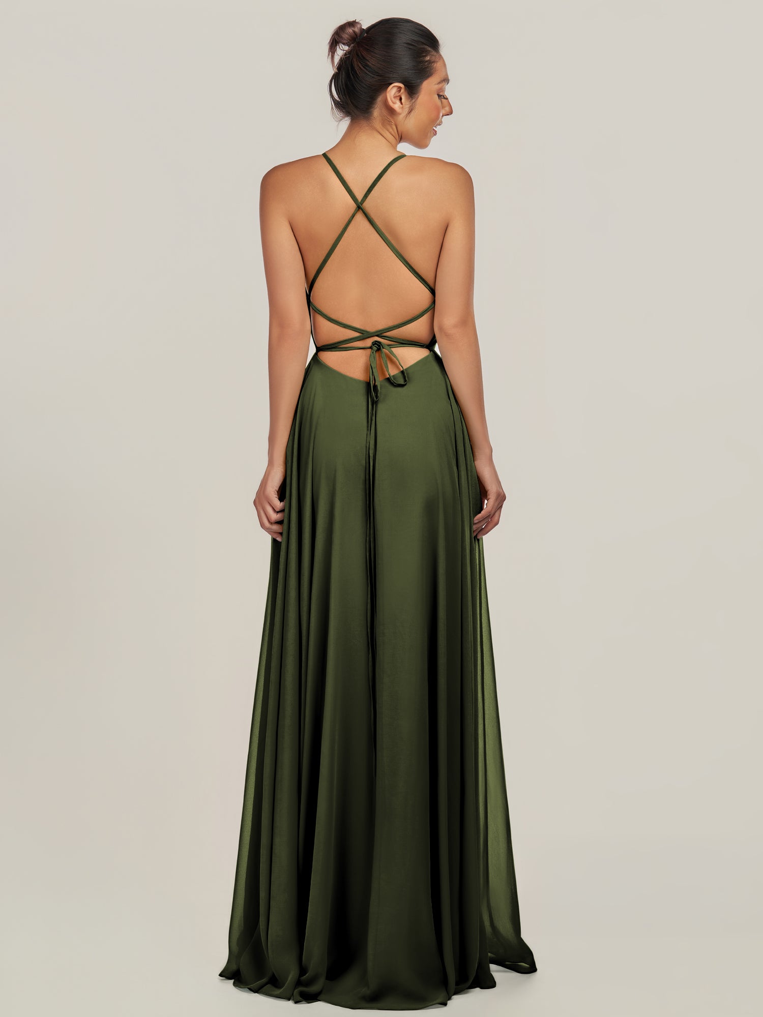 Dena | Olive - A Line Chiffon Spaghetti Straps Long Bridesmaid Dress with Slit
