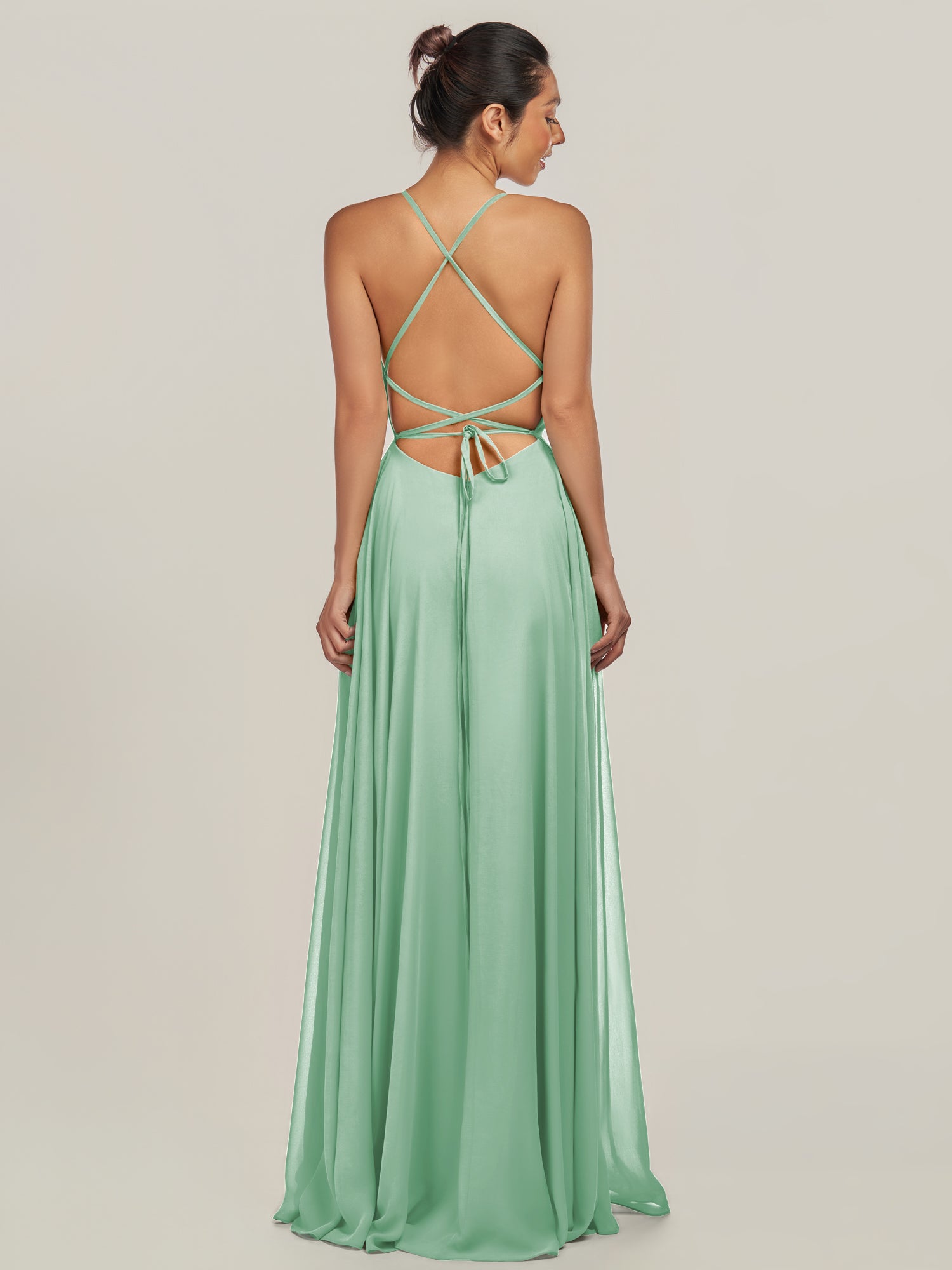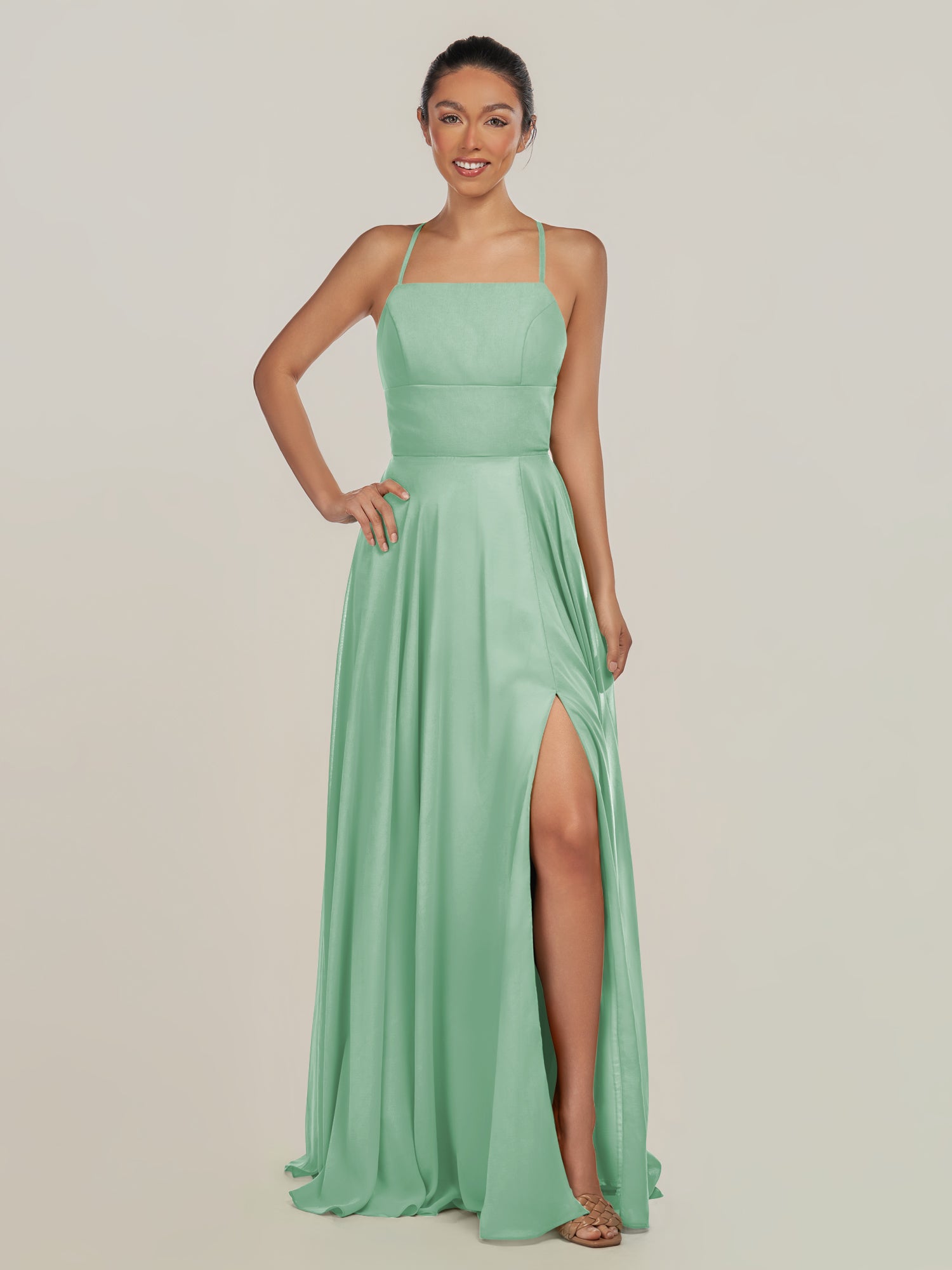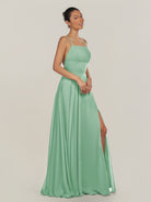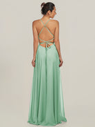 Dena | Pale Pistachio - A Line Chiffon Spaghetti Straps Long Bridesmaid Dress with Slit