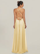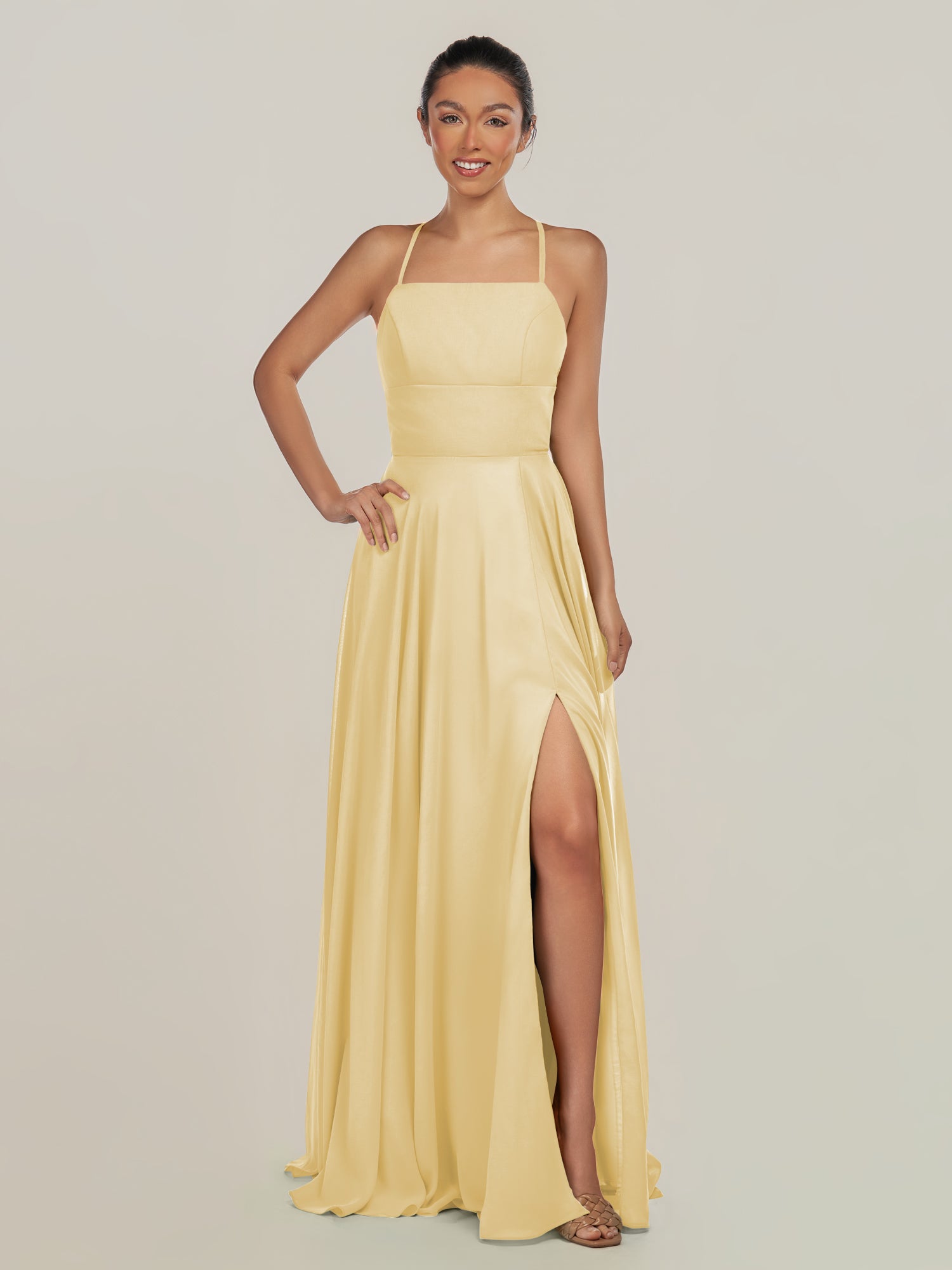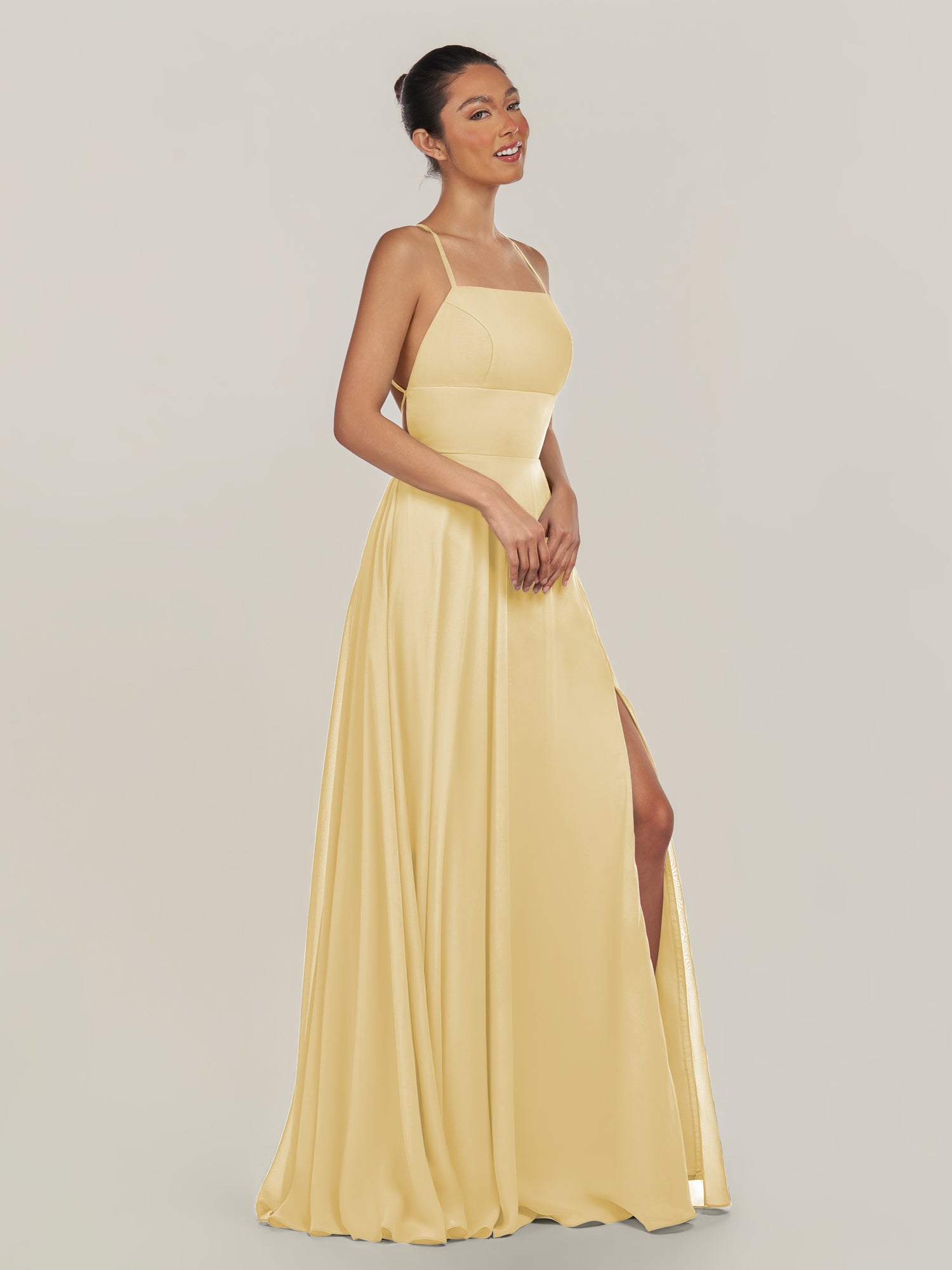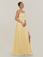 Dena | Pastel Yellow - A Line Chiffon Spaghetti Straps Long Bridesmaid Dress with Slit