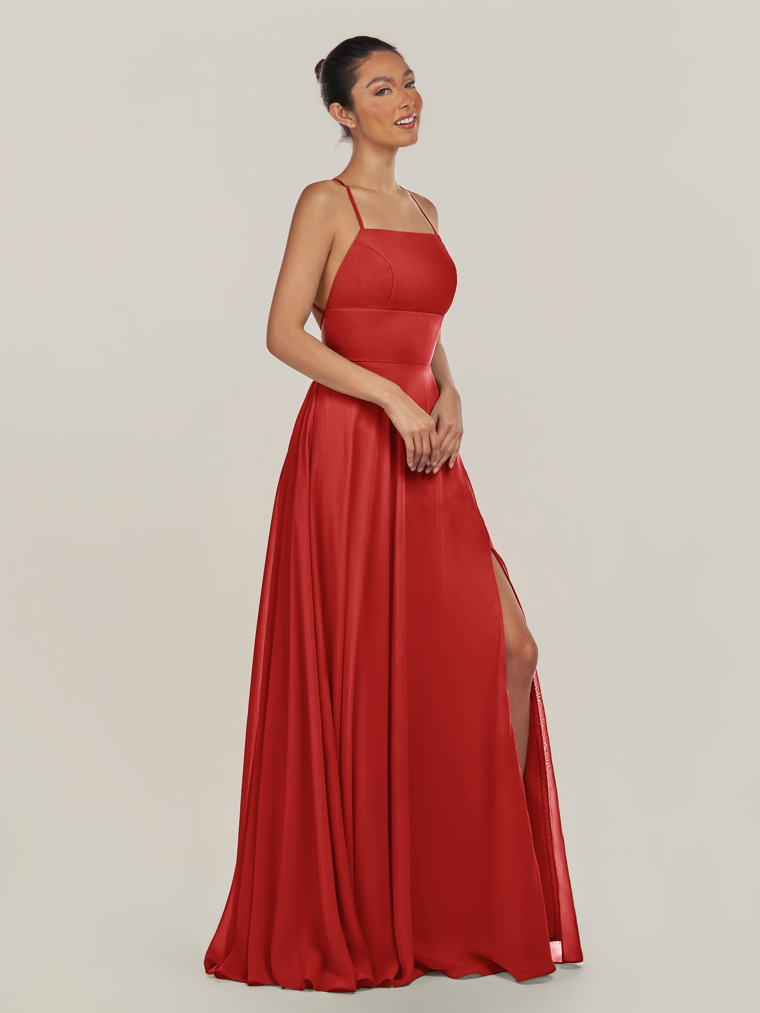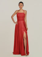 Dena | Ruby Red - A Line Chiffon Spaghetti Straps Long Bridesmaid Dress with Slit