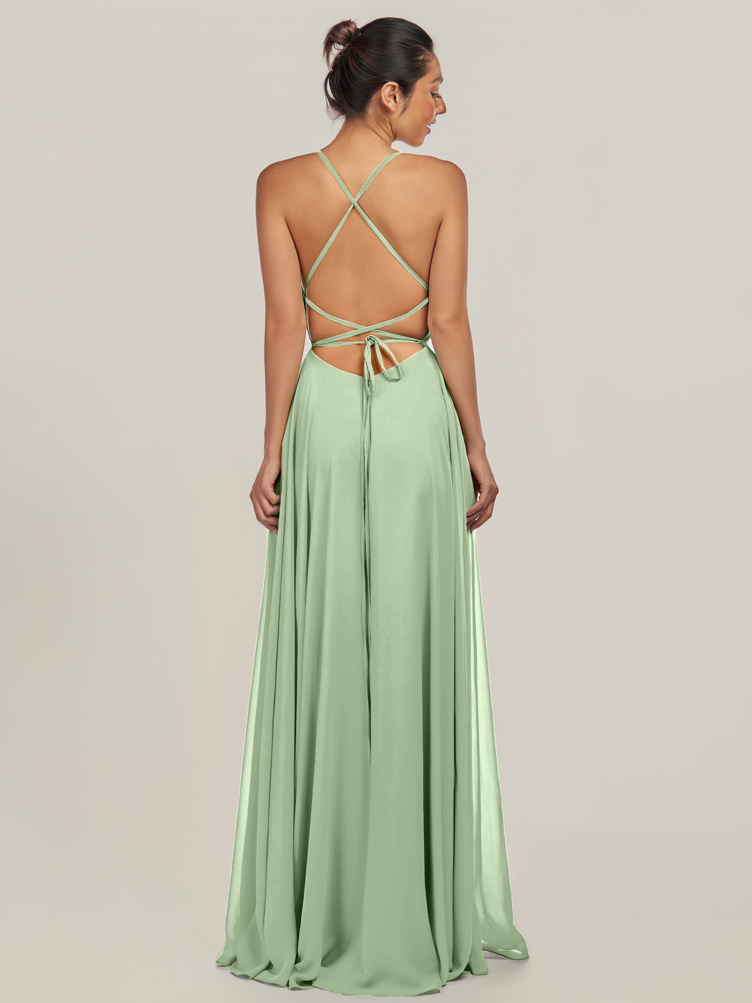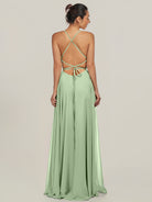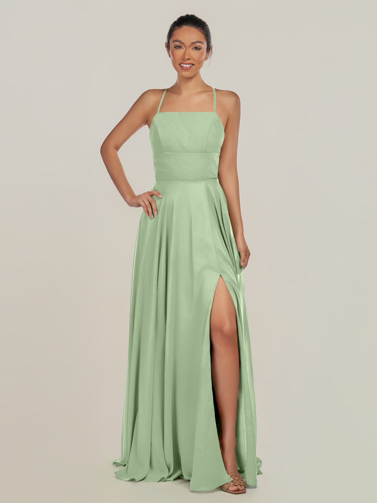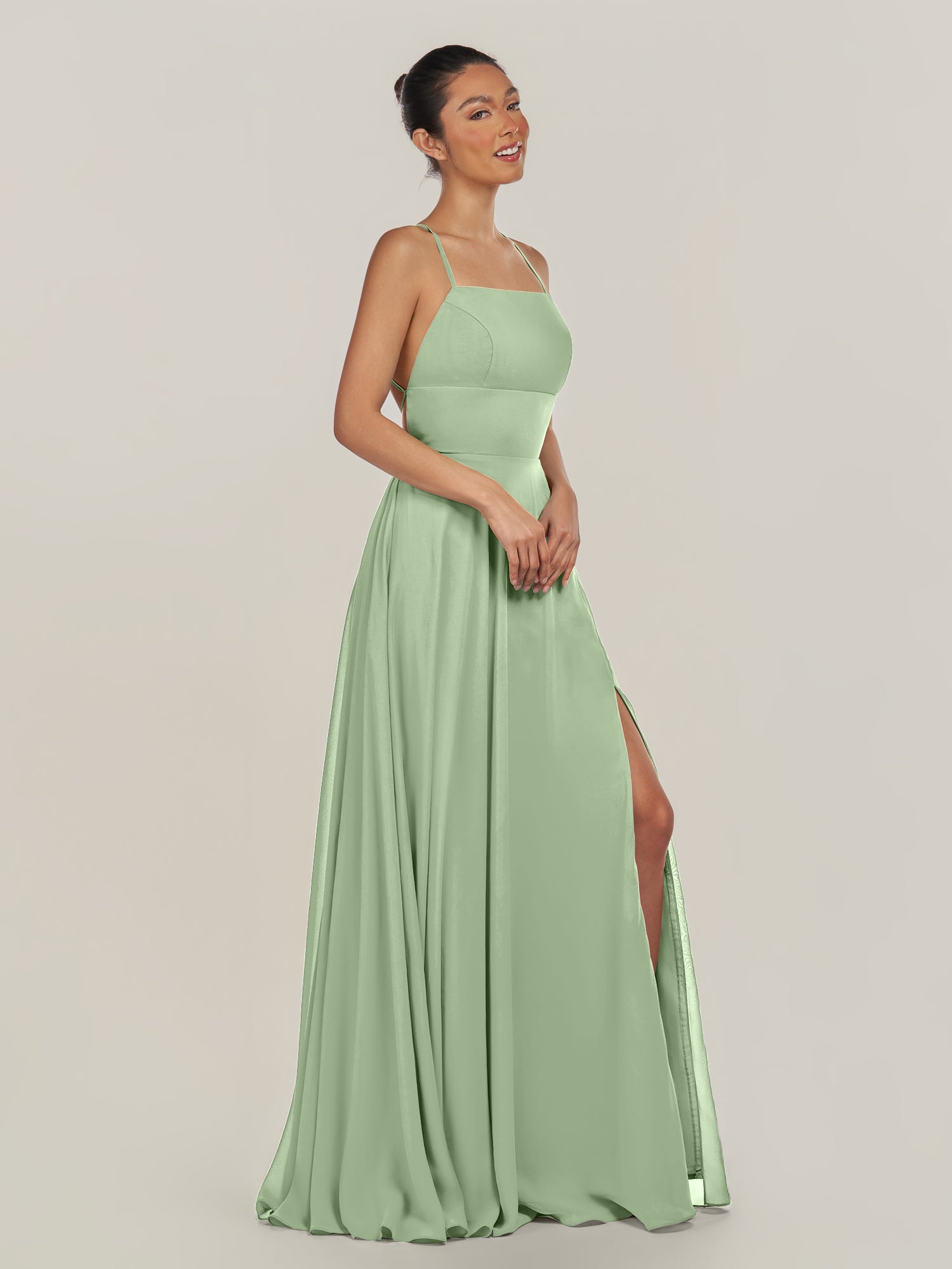Dena | Sage - A Line Chiffon Spaghetti Straps Long Bridesmaid Dress with Slit