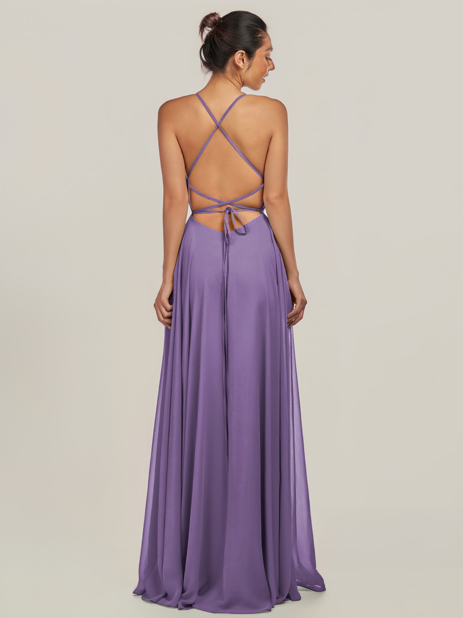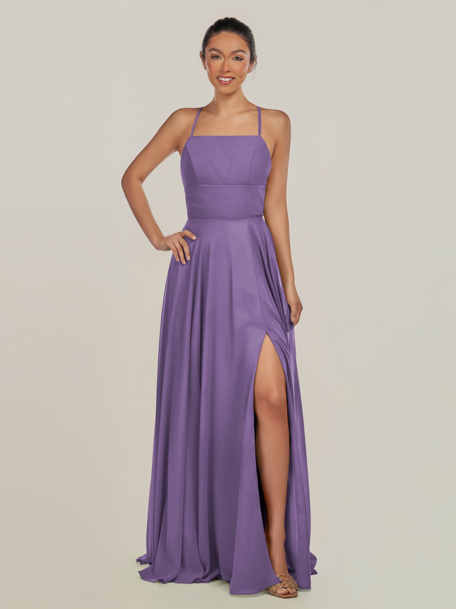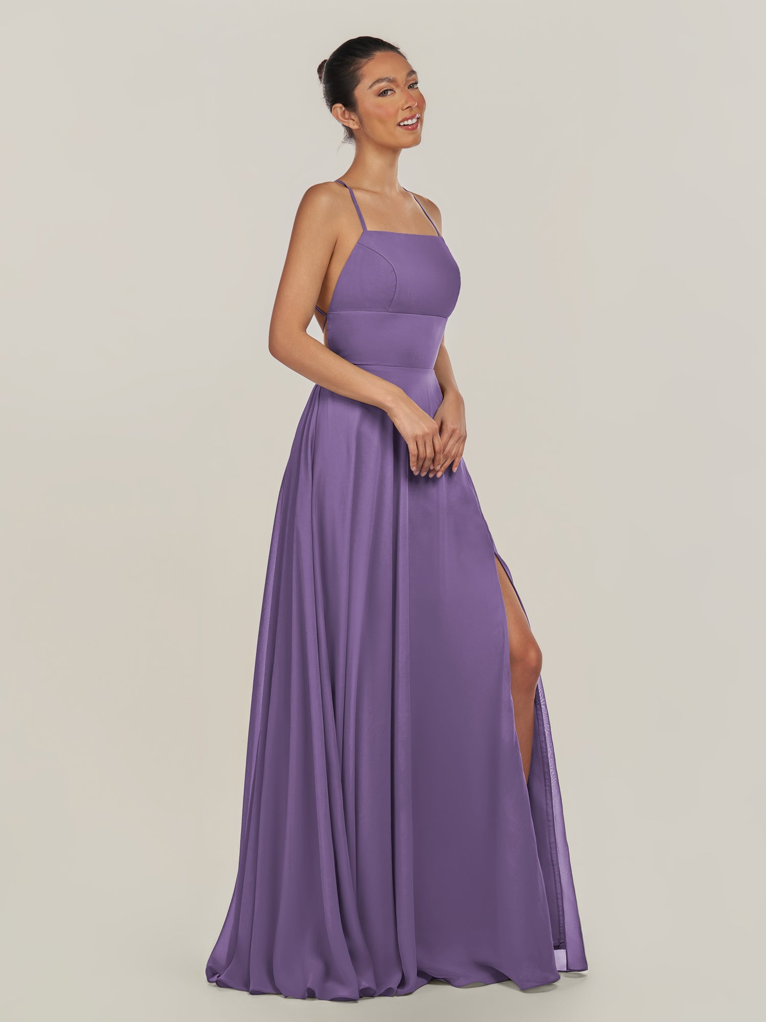 Dena is a timeless blend of simplicity and charm. Crafted from soft chiffon, she features delicate spaghetti straps that frame a flattering neckline and a fitted bodice for an effortlessly elegant look. Her floor-length A-line skirt flows gracefully with every step, highlighted by a subtle side slit that adds a touch of modern ease. Finished with a smooth zipper back, Dena embodies understated sophistication—perfect for weddings and graceful celebrations.