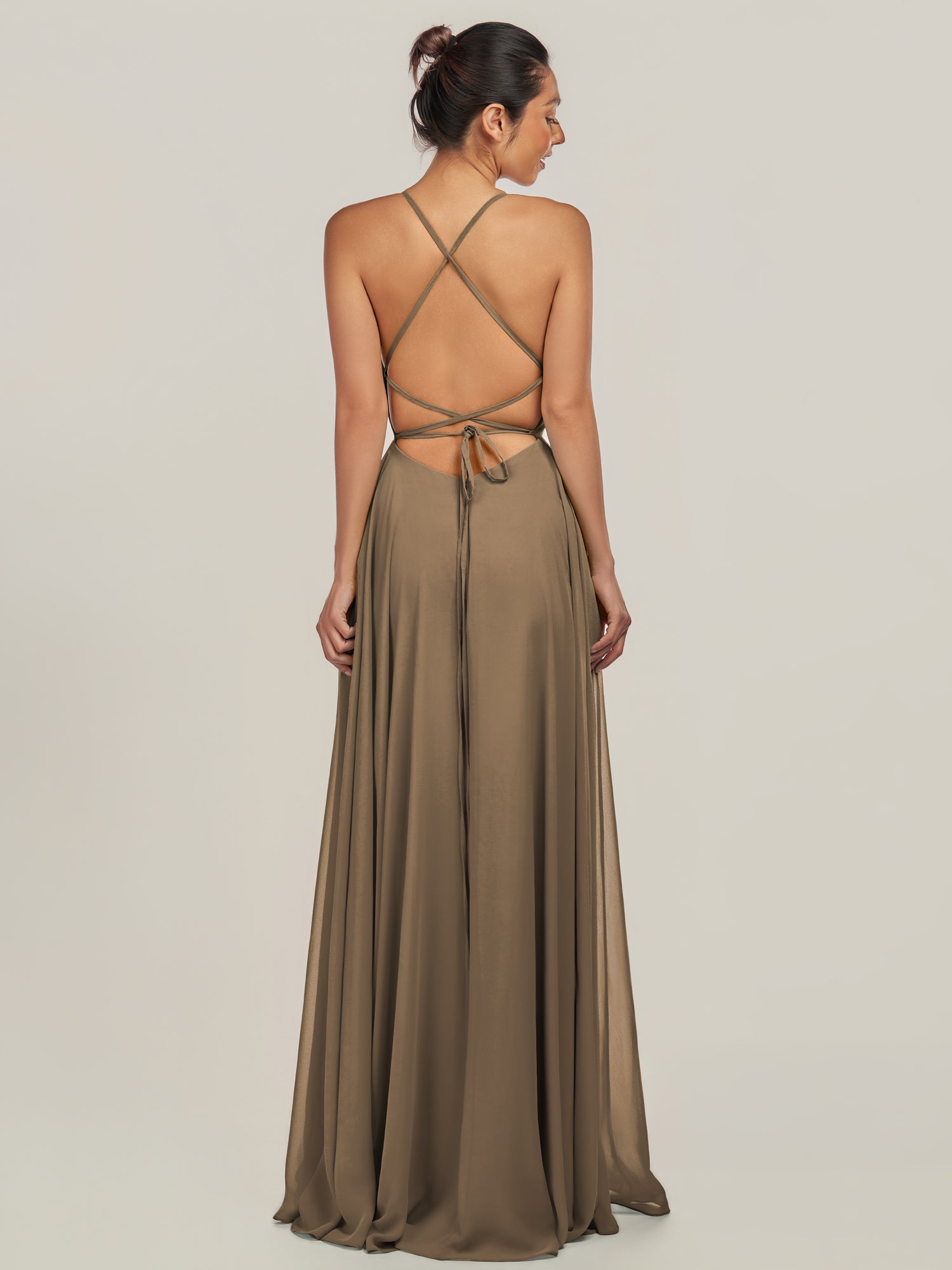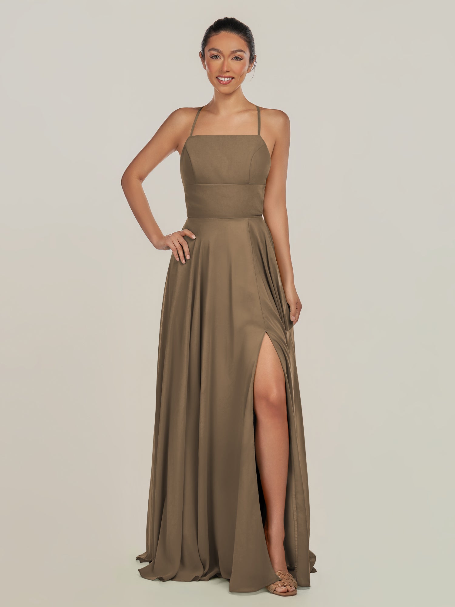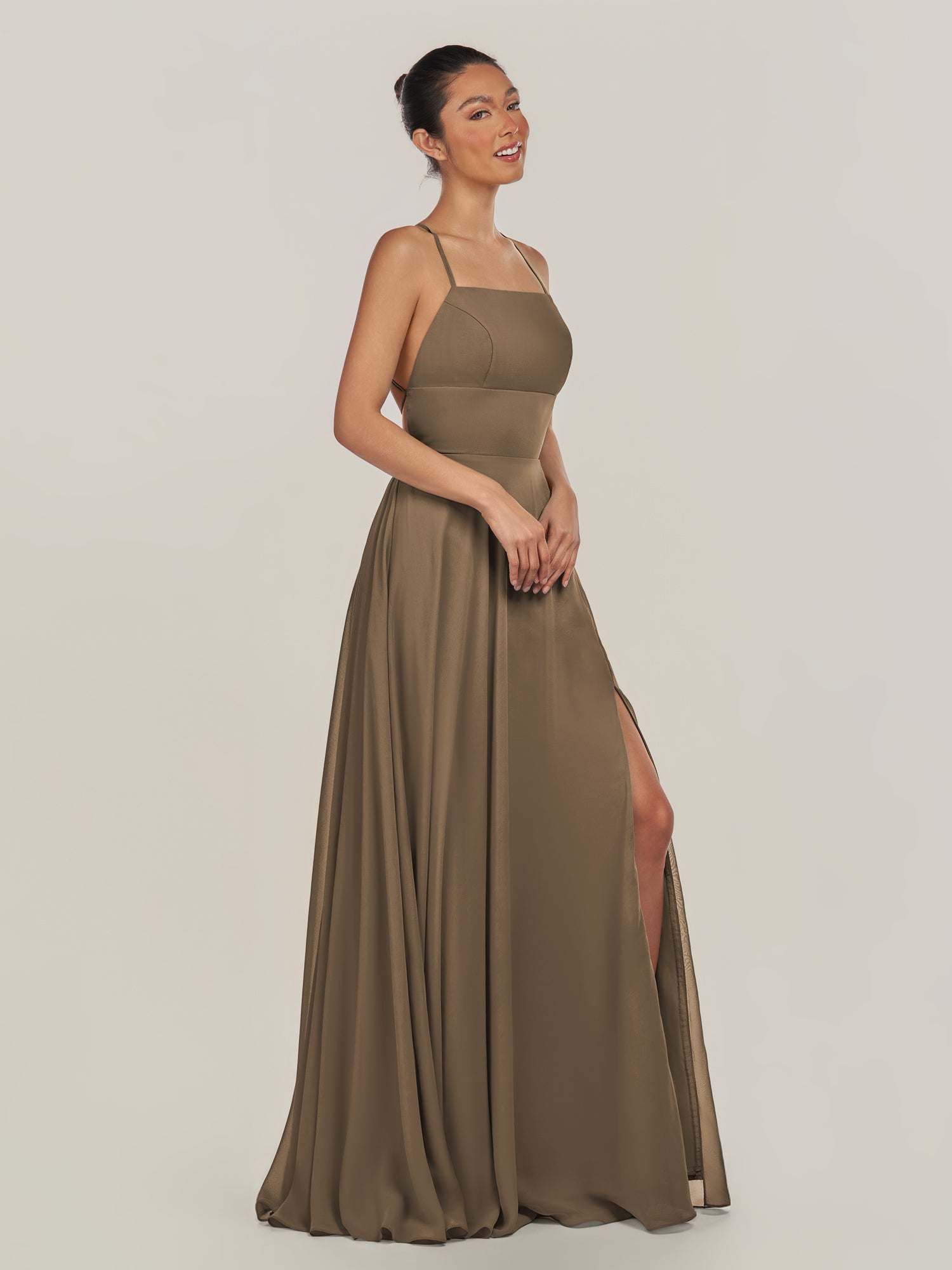 Dena is a timeless blend of simplicity and charm. Crafted from soft chiffon, she features delicate spaghetti straps that frame a flattering neckline and a fitted bodice for an effortlessly elegant look. Her floor-length A-line skirt flows gracefully with every step, highlighted by a subtle side slit that adds a touch of modern ease. Finished with a smooth zipper back, Dena embodies understated sophistication—perfect for weddings and graceful celebrations.