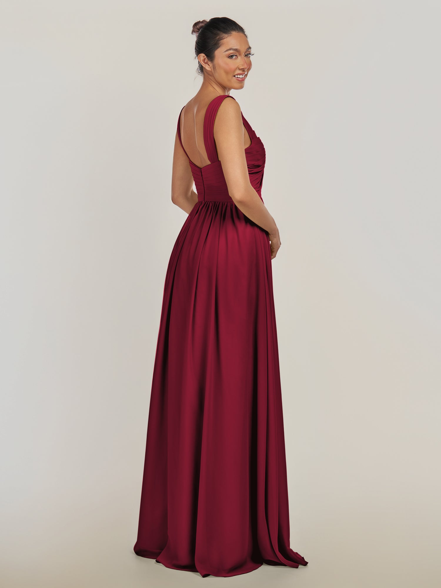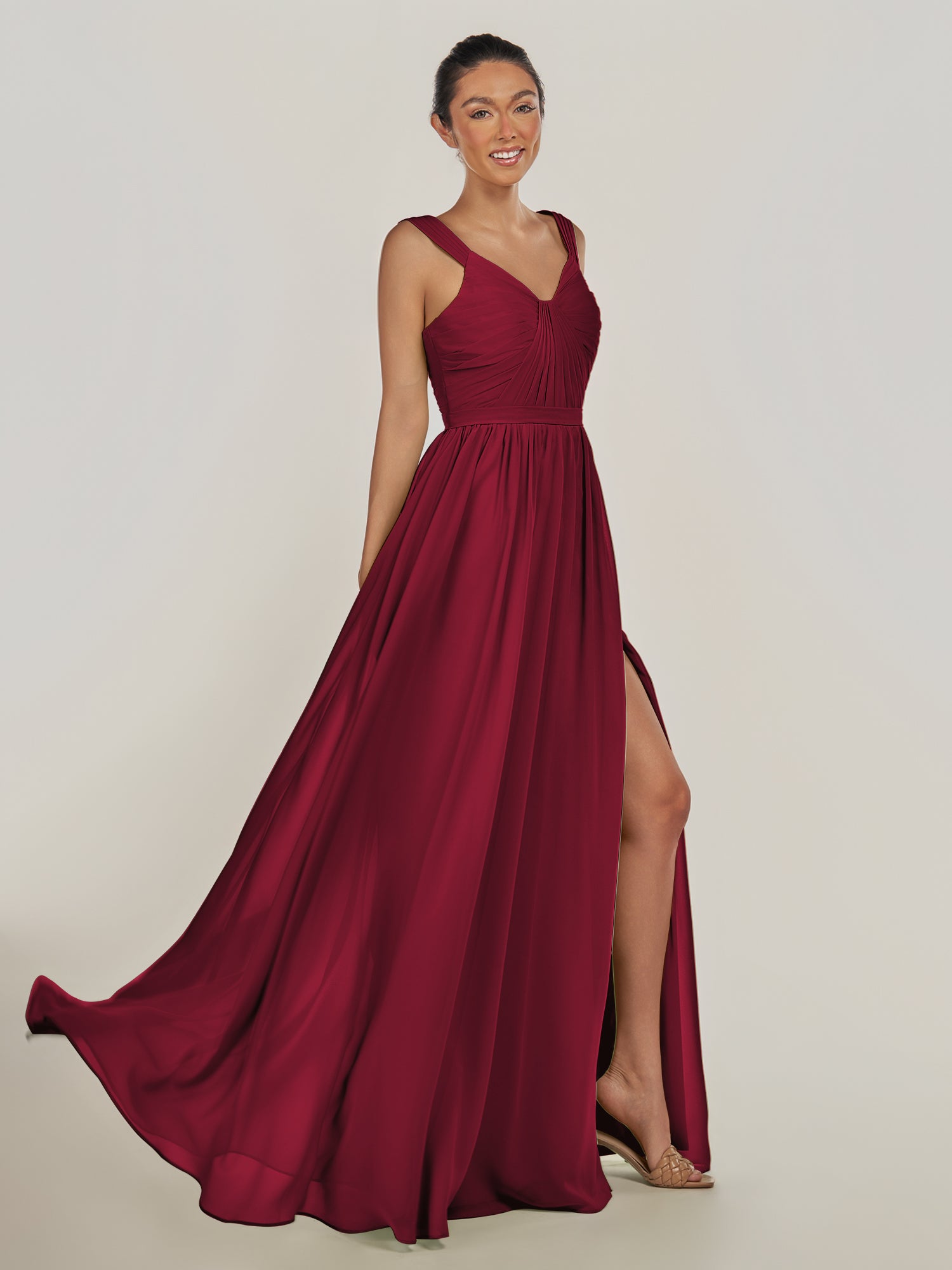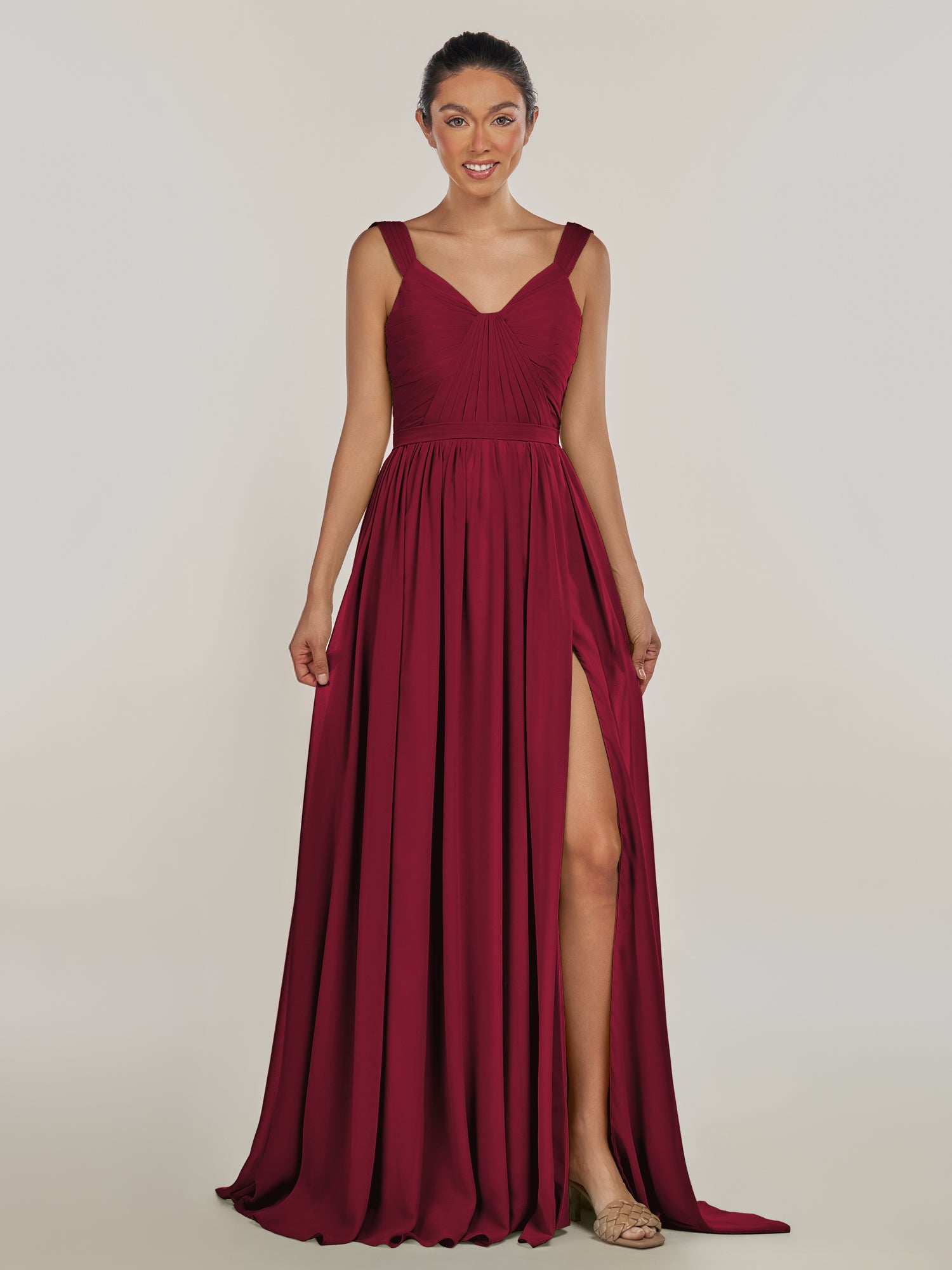 Fira | Berry - A Line Chiffon V Neck Pleated Long Bridesmaid Dress with Slit