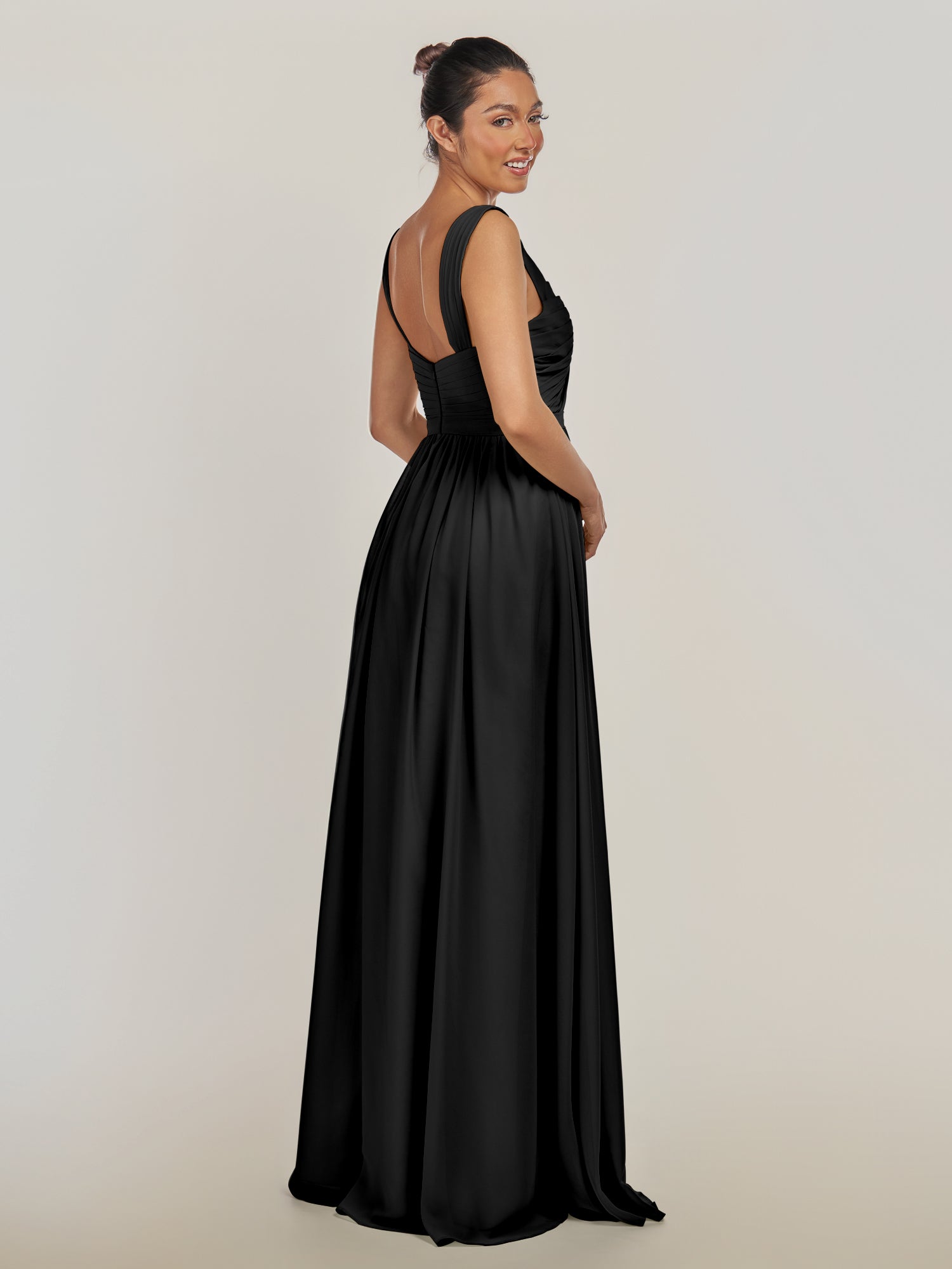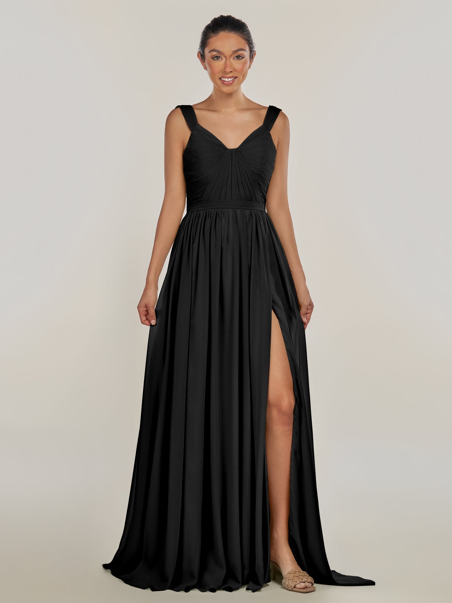 Fira | Black - A Line Chiffon V Neck Pleated Long Bridesmaid Dress with Slit