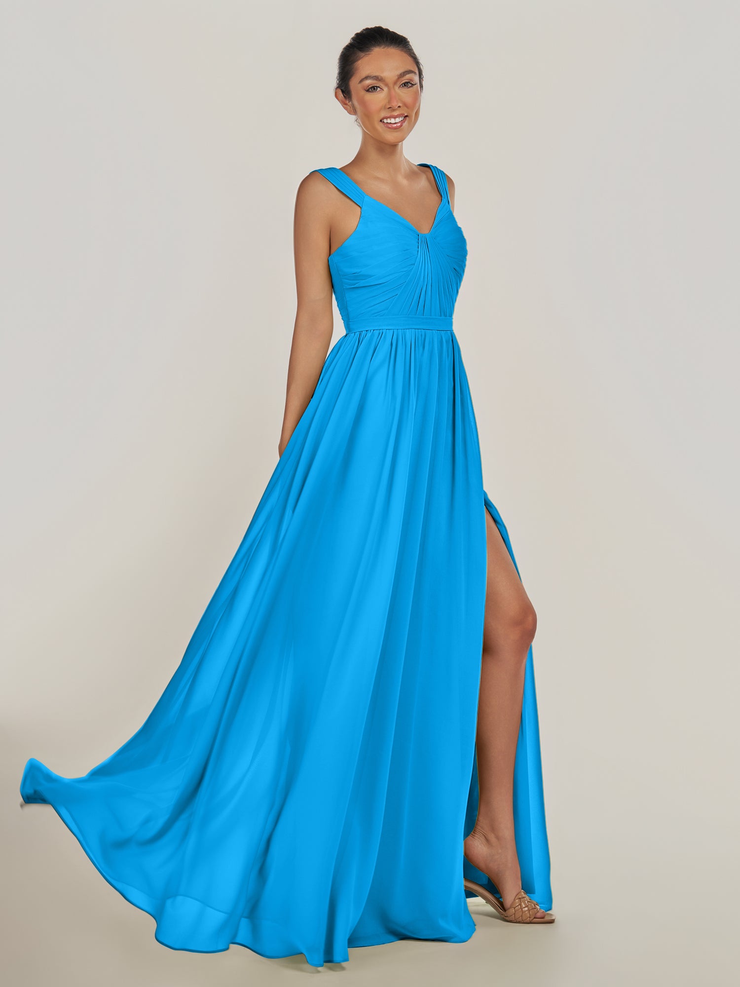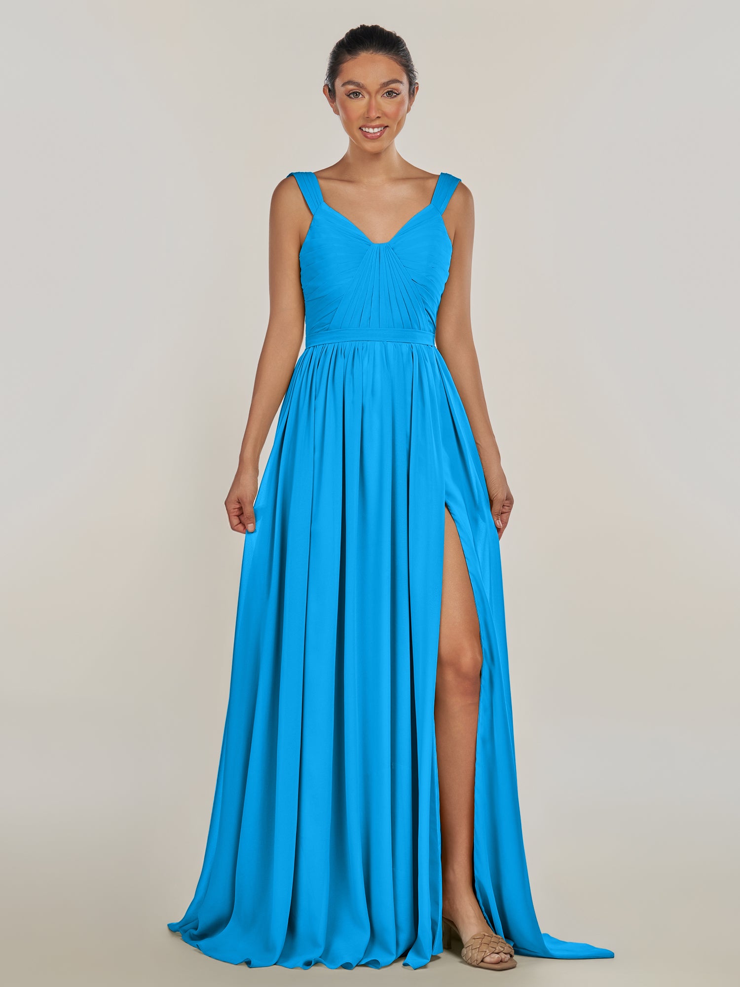 Fira | Blue Jay - A Line Chiffon V Neck Pleated Long Bridesmaid Dress with Slit