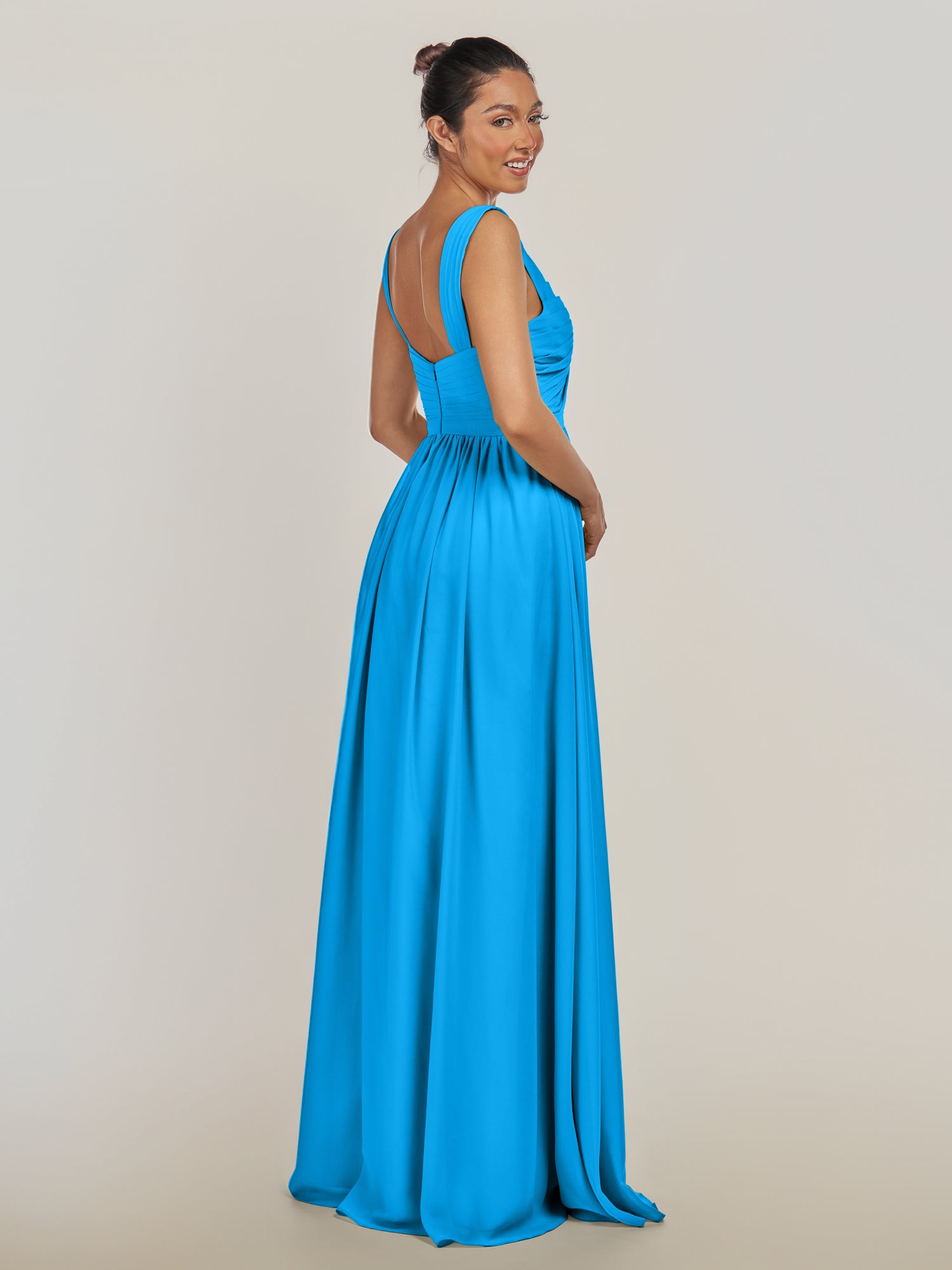 Fira is where soft romance meets timeless grace. Crafted from airy chiffon, she features a gentle V-neckline and delicate pleats that flatter every curve. Her A-line silhouette flows effortlessly to the floor, with a subtle slit that brings a modern, graceful touch. Finished with a smooth zipper back, Fira moves with poise and ease—perfect for bridesmaids who adore elegance with a fresh, refined charm.