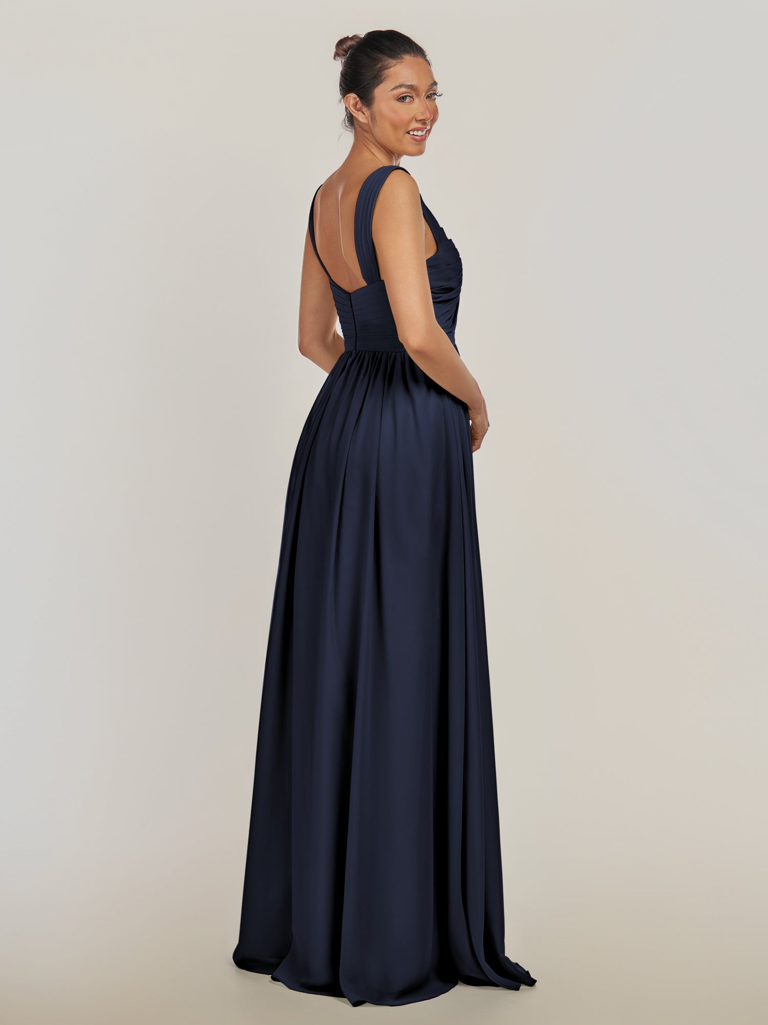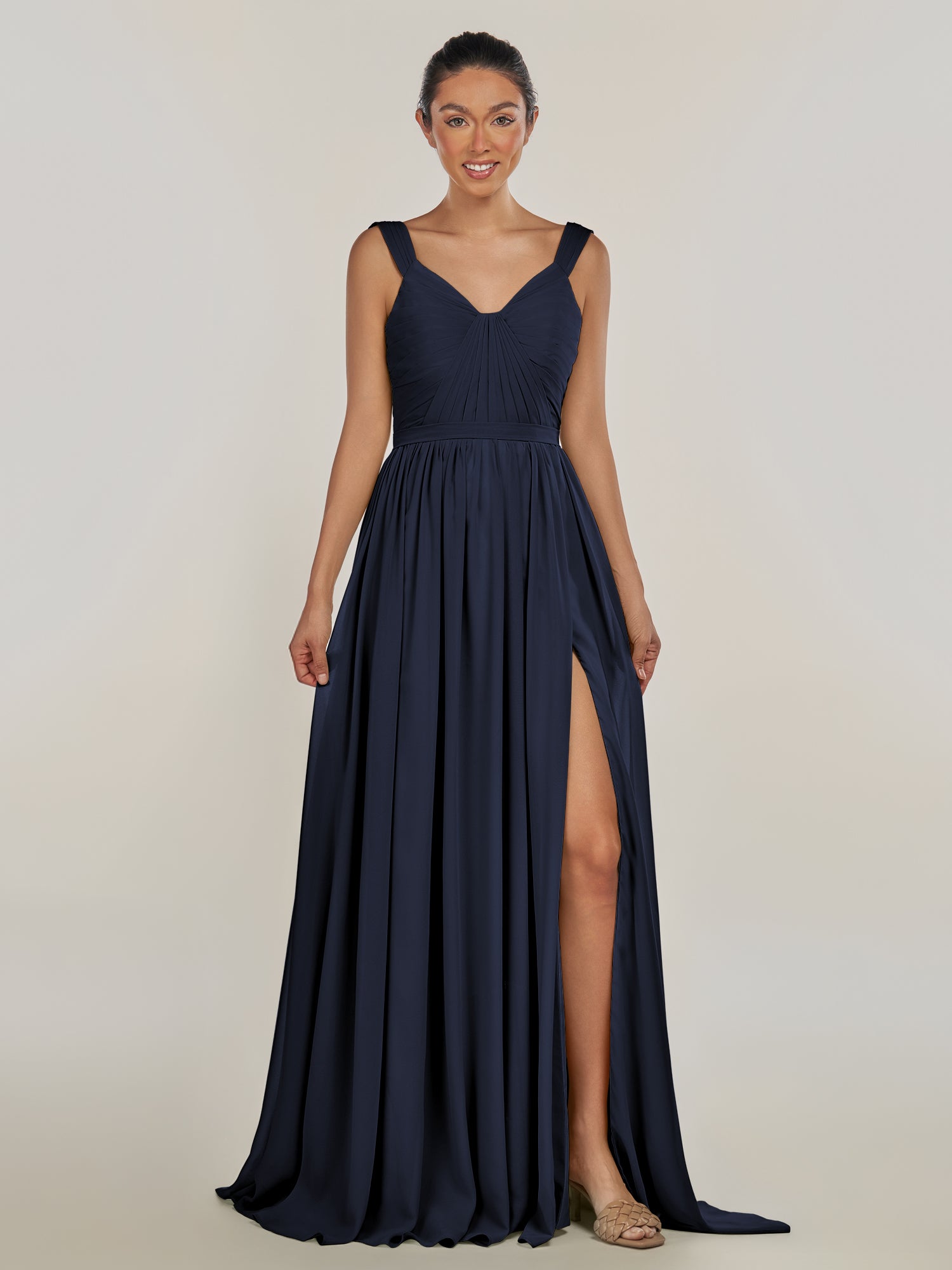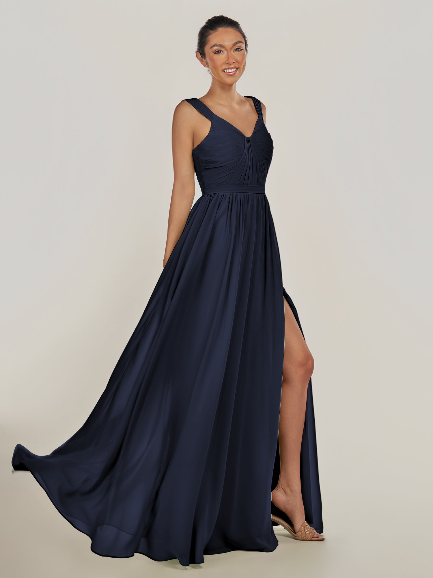 Fira | Dark Navy - A Line Chiffon V Neck Pleated Long Bridesmaid Dress with Slit
