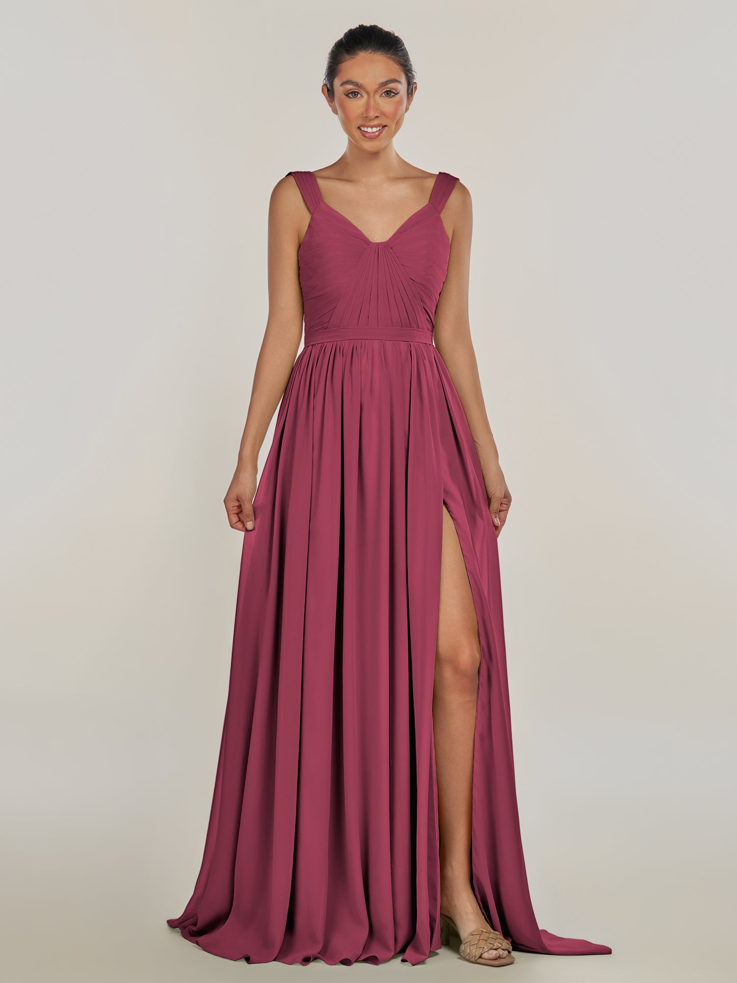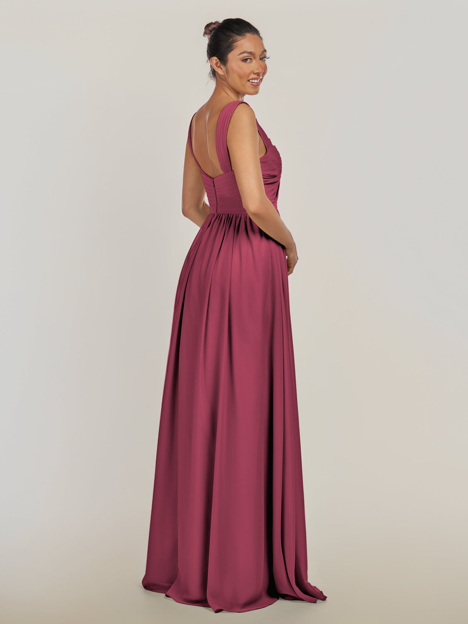 Fira is where soft romance meets timeless grace. Crafted from airy chiffon, she features a gentle V-neckline and delicate pleats that flatter every curve. Her A-line silhouette flows effortlessly to the floor, with a subtle slit that brings a modern, graceful touch. Finished with a smooth zipper back, Fira moves with poise and ease—perfect for bridesmaids who adore elegance with a fresh, refined charm.