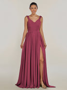 Fira | Desert Rose - A Line Chiffon V Neck Pleated Long Bridesmaid Dress with Slit